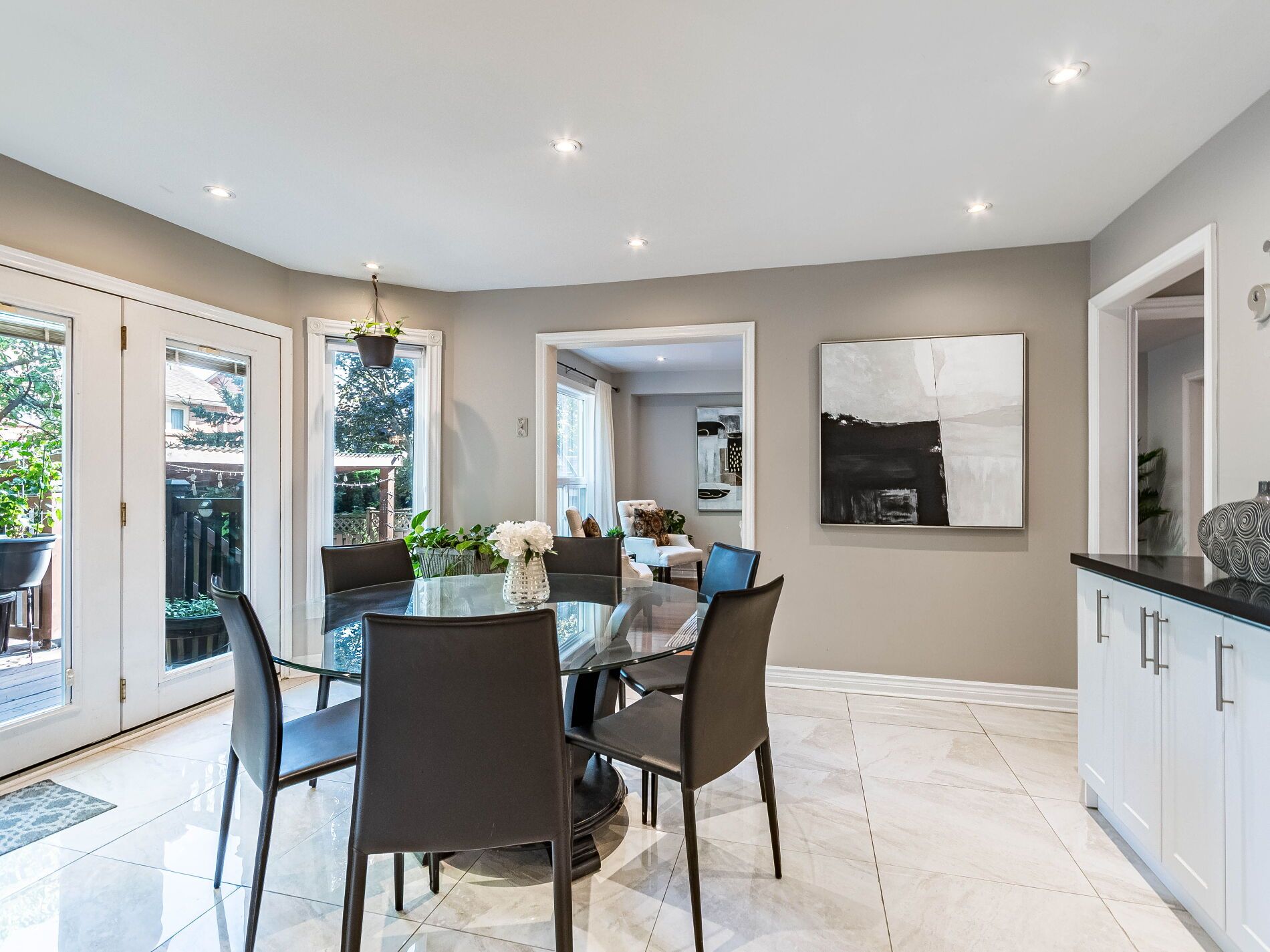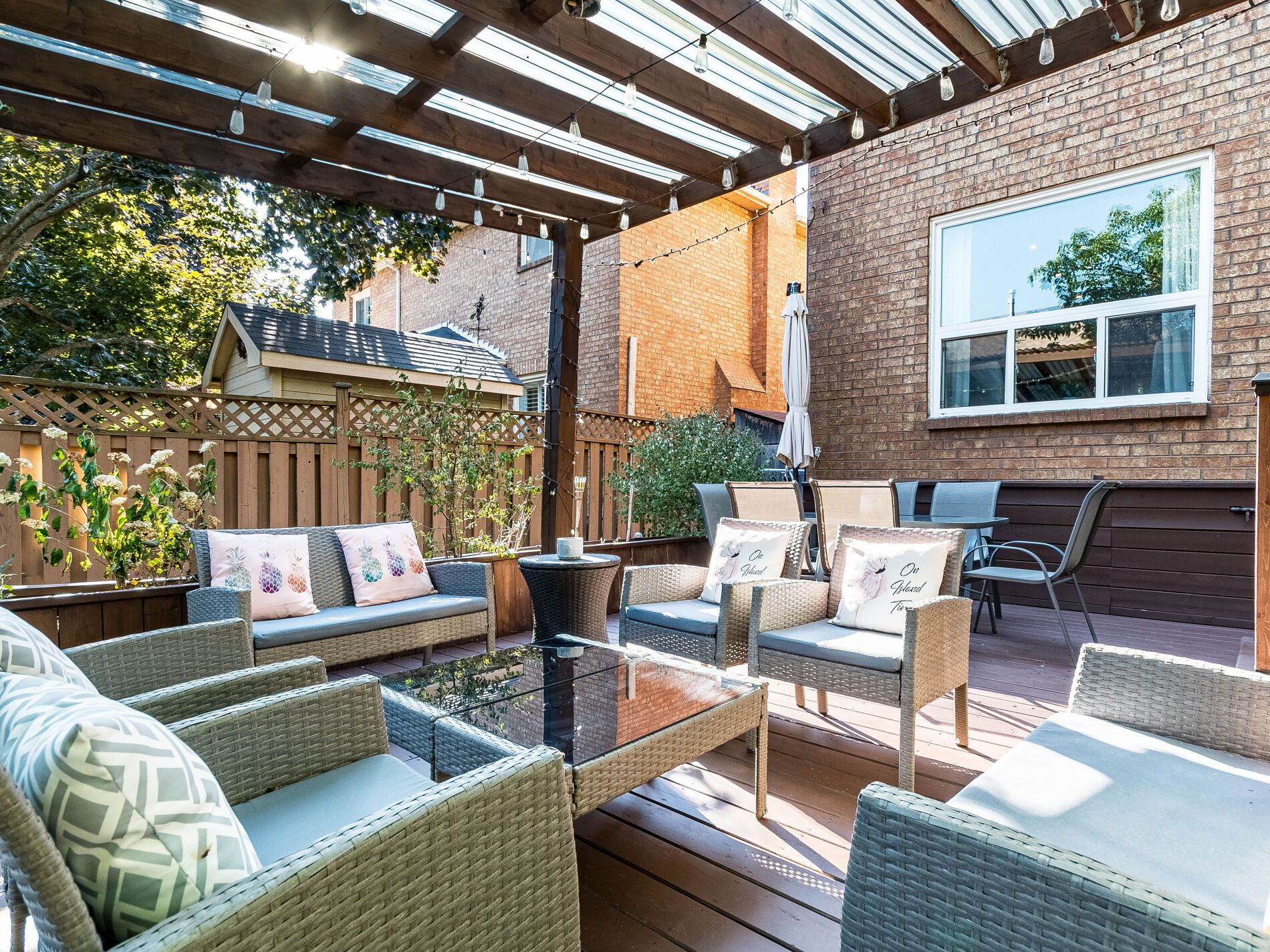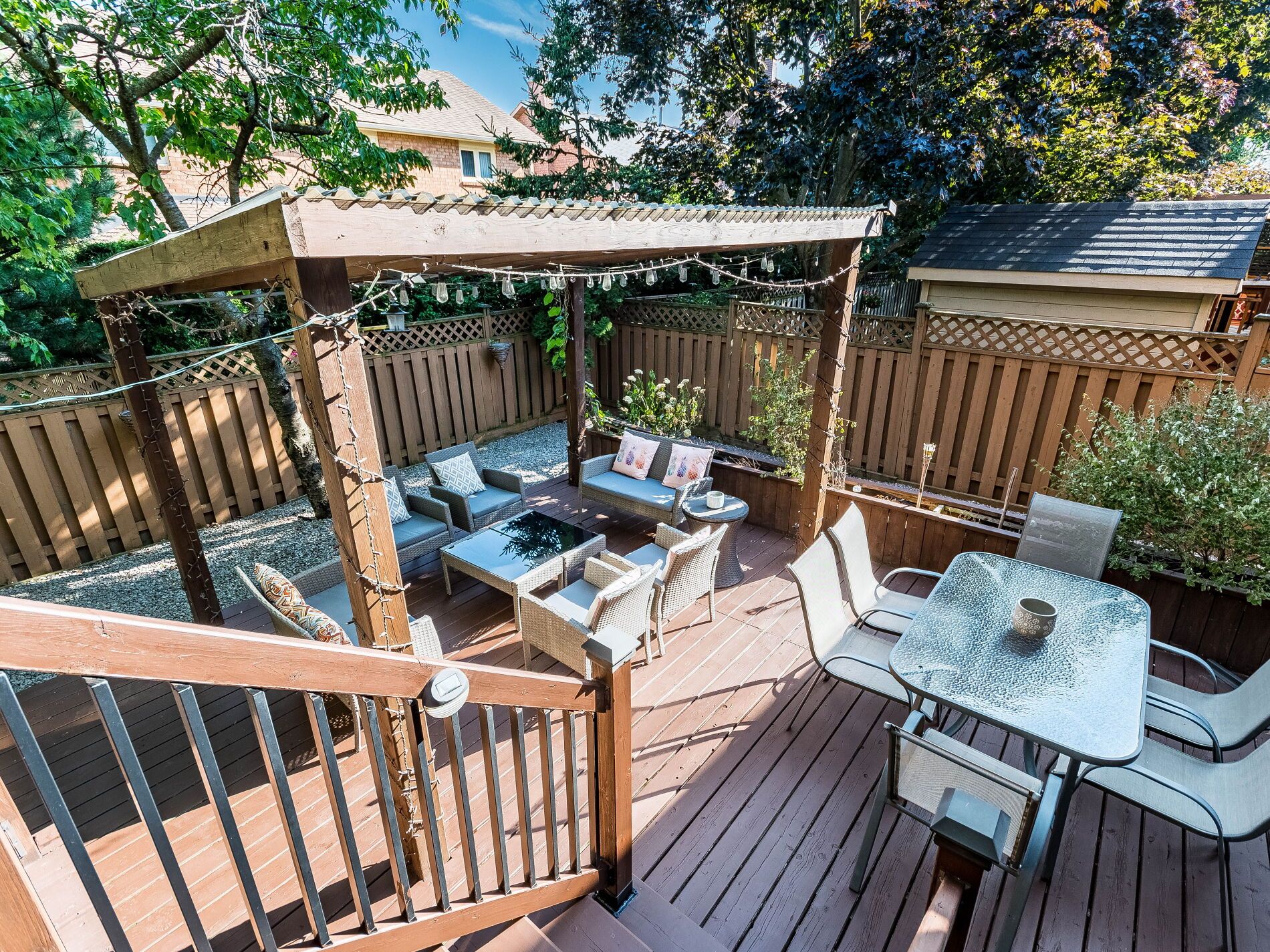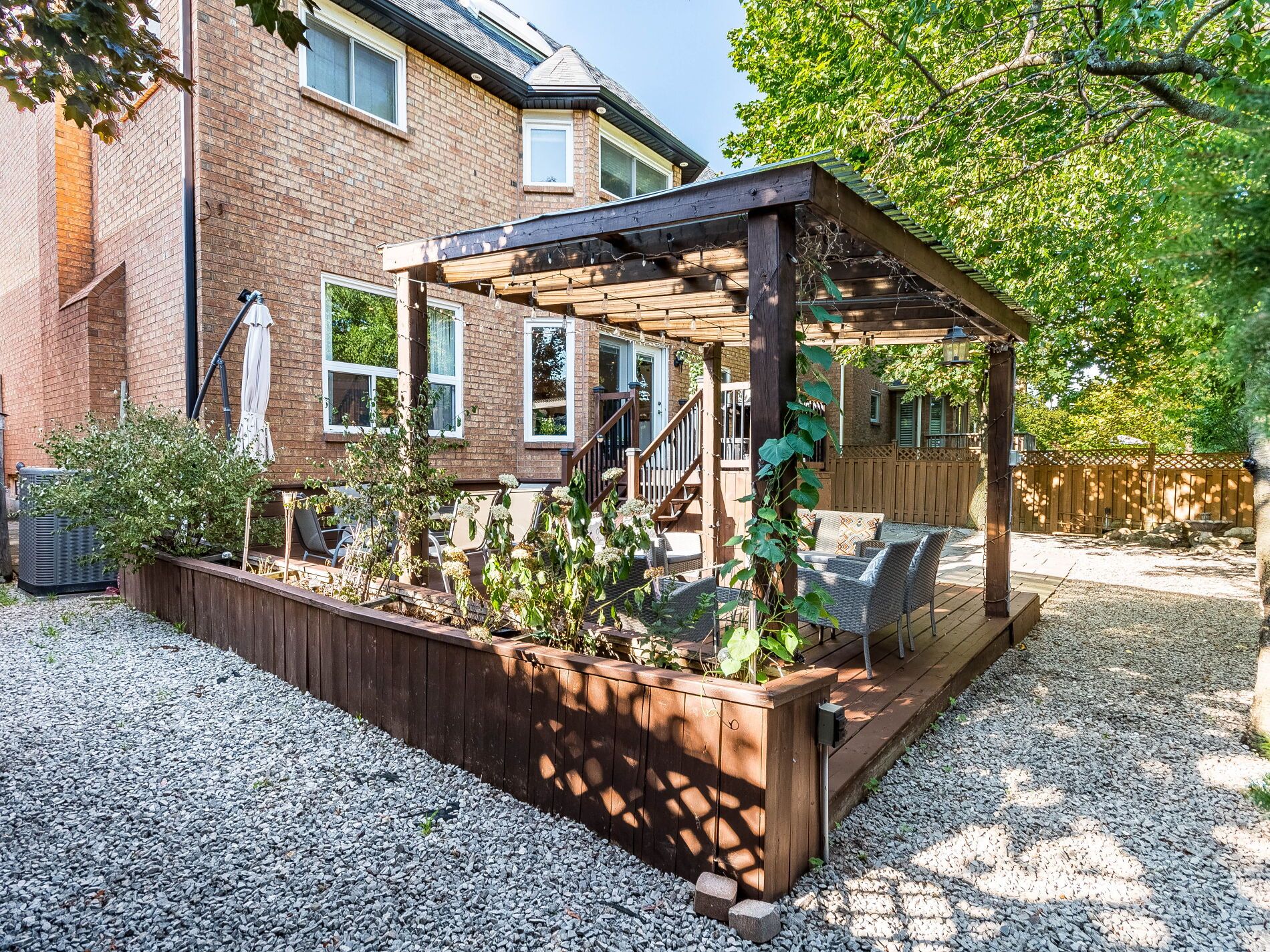 • Large outdoor deck surrounded by low-maintenance greenery for privacy.