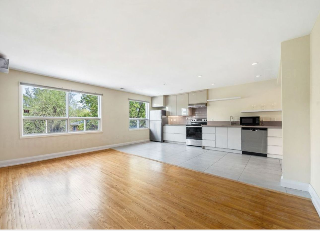 • Bright open concept apartment with oversized windows for natural light.
