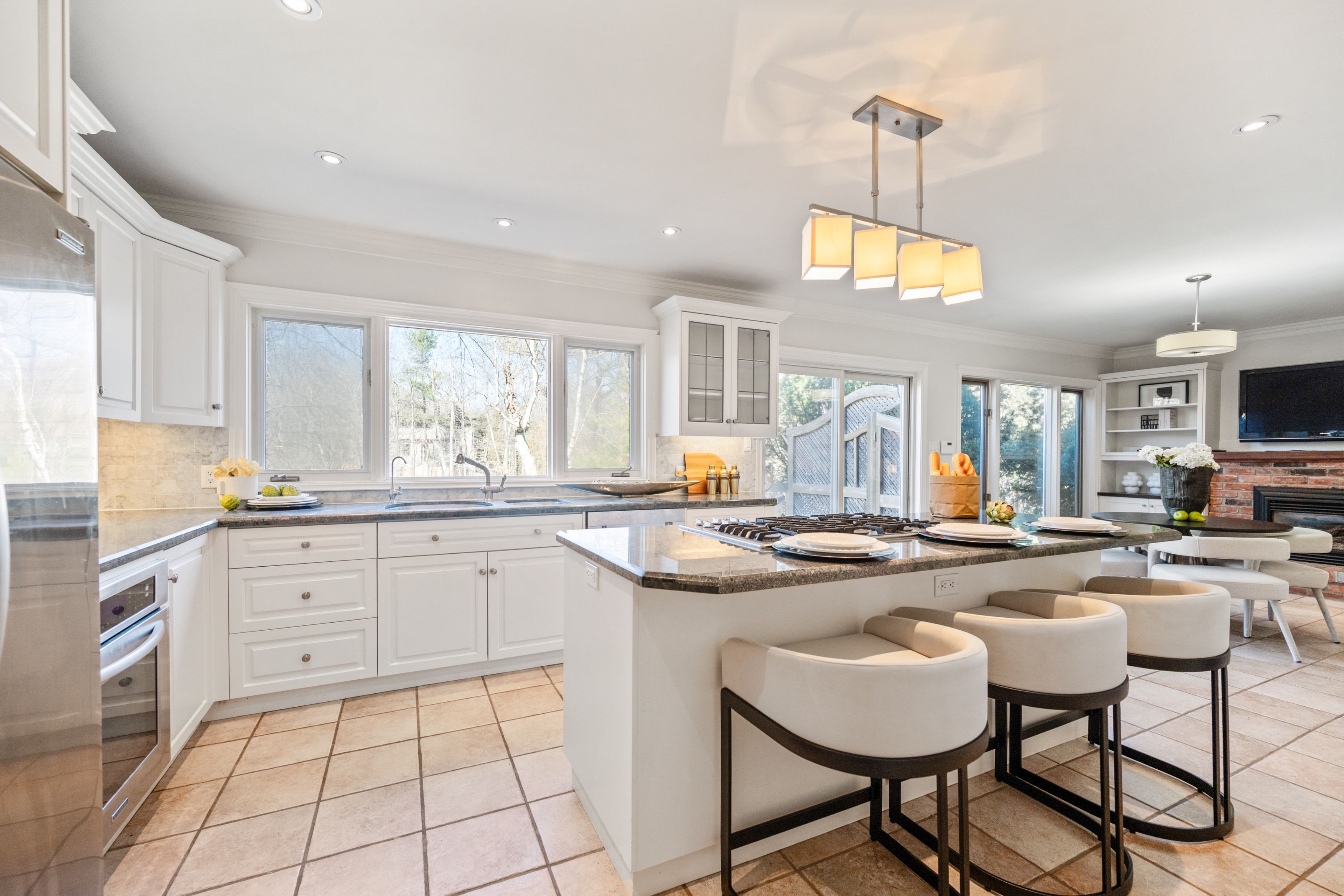 • Open concept kitchen and family room with a cozy fireplace.