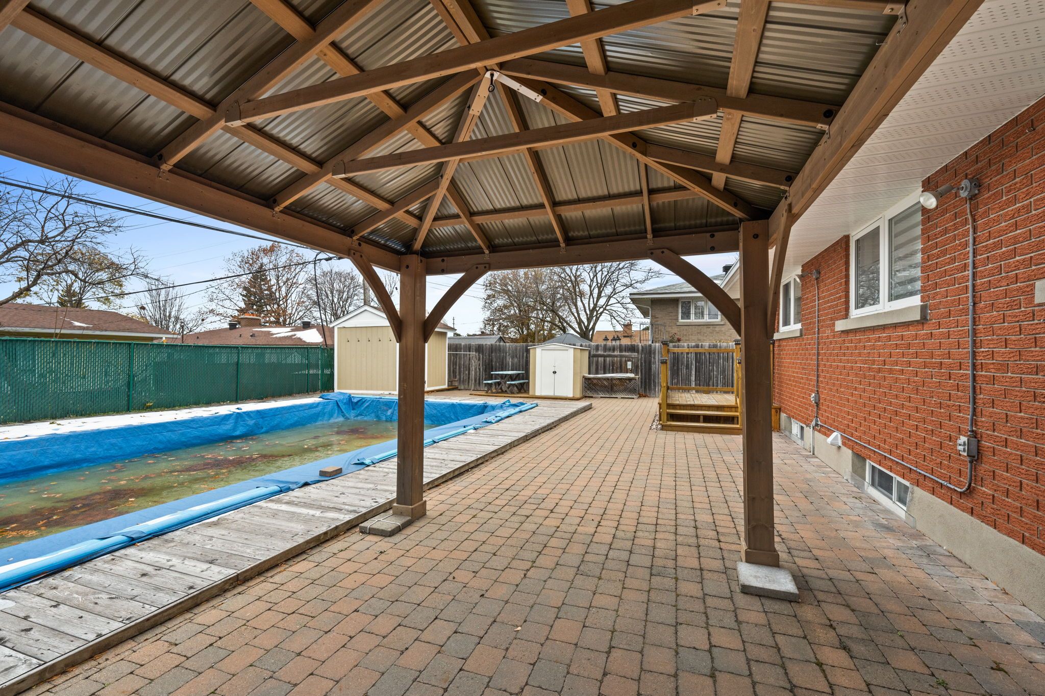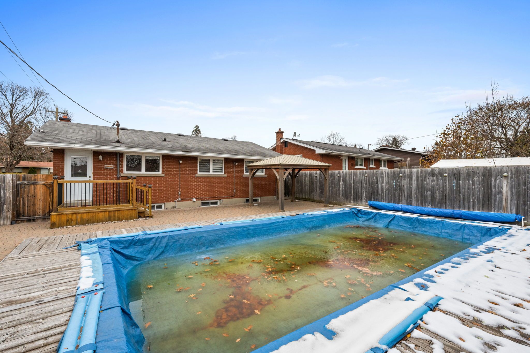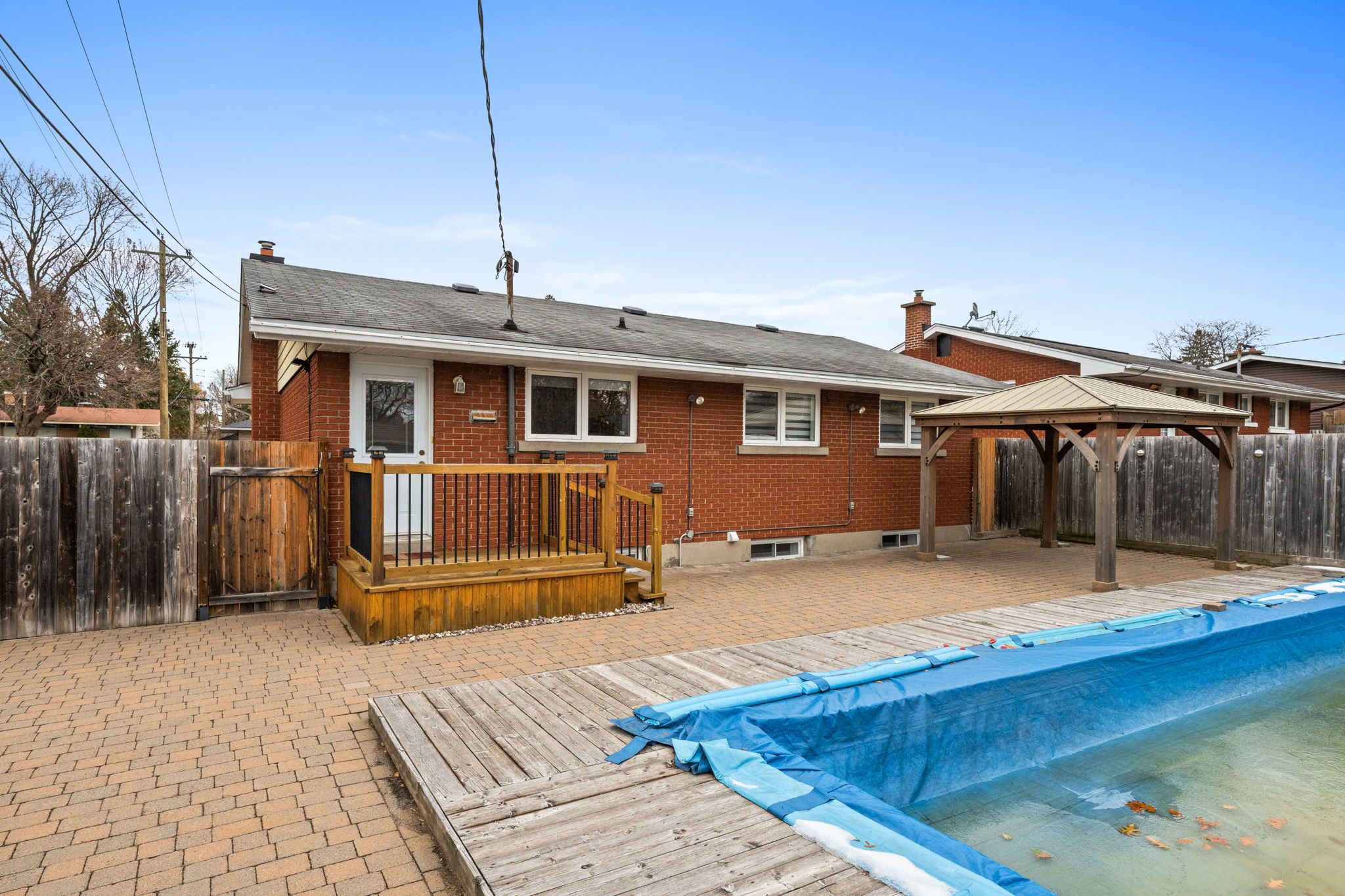 • Fenced backyard includes a heated inground pool and outdoor spaces.