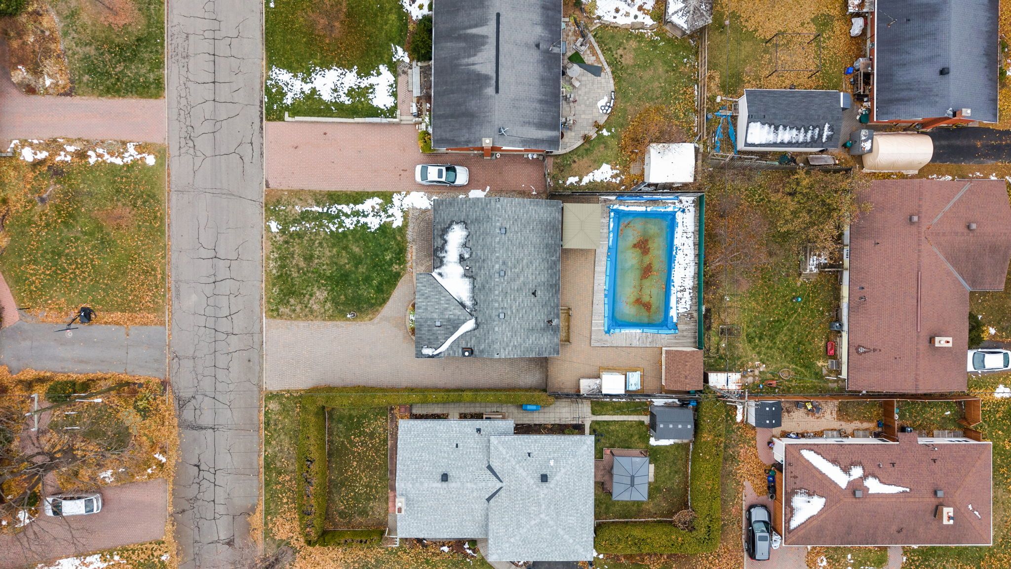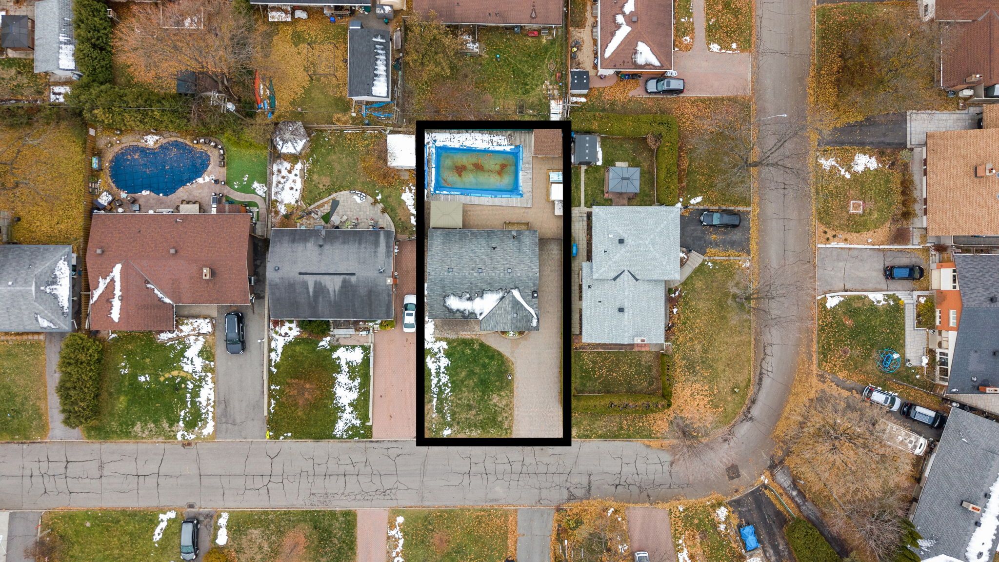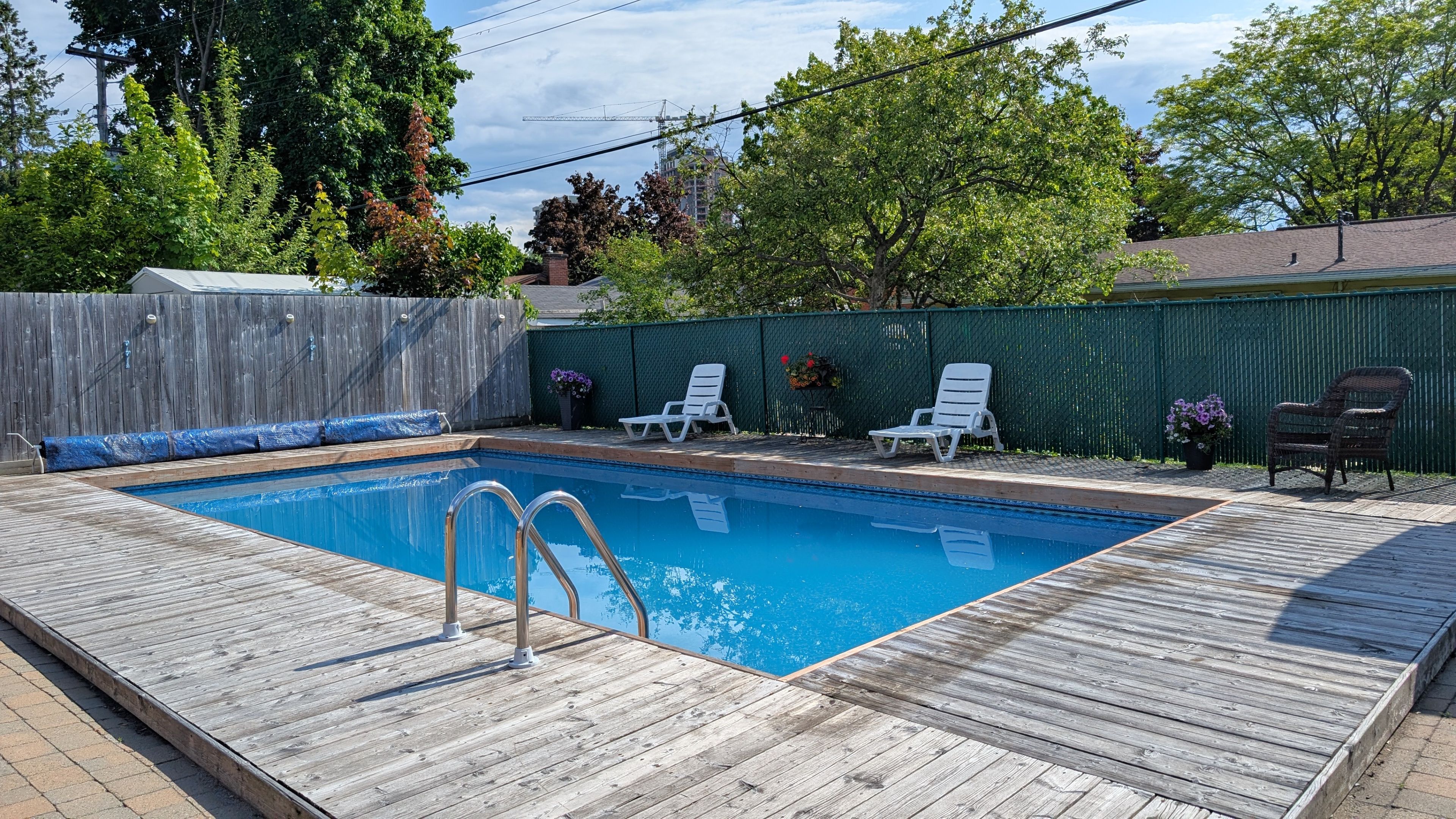 • Fenced backyard includes a heated inground pool and outdoor spaces.