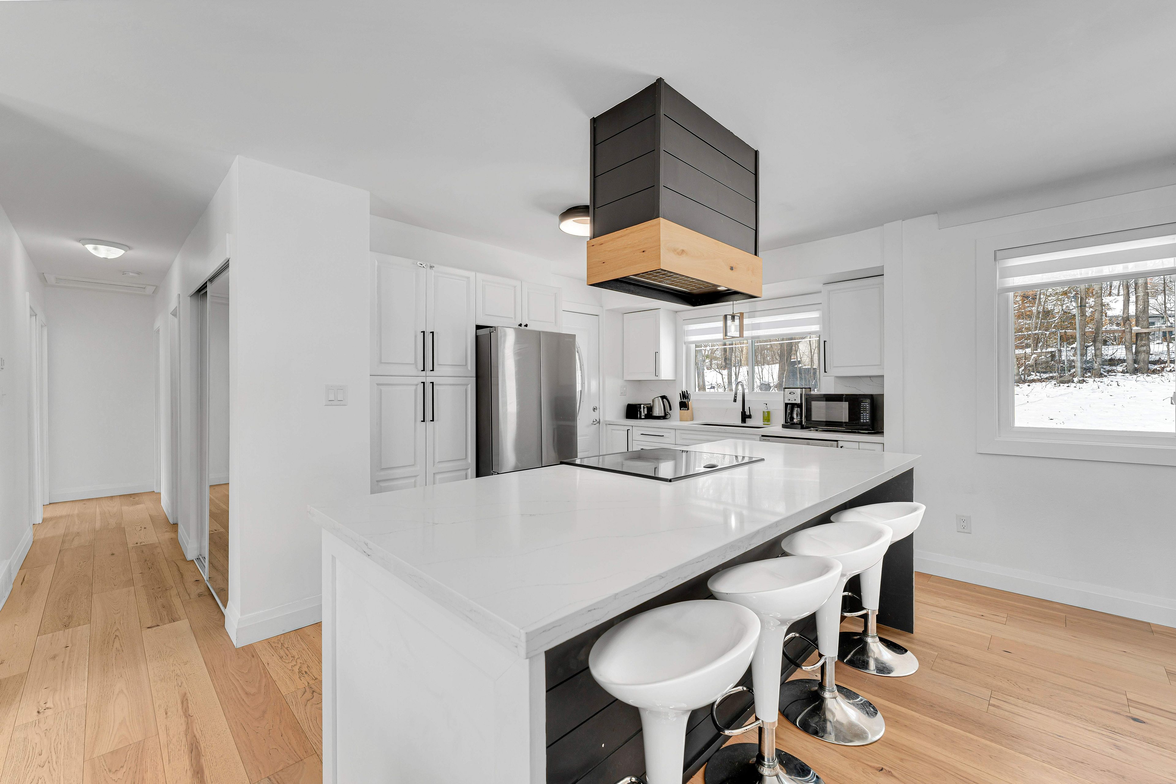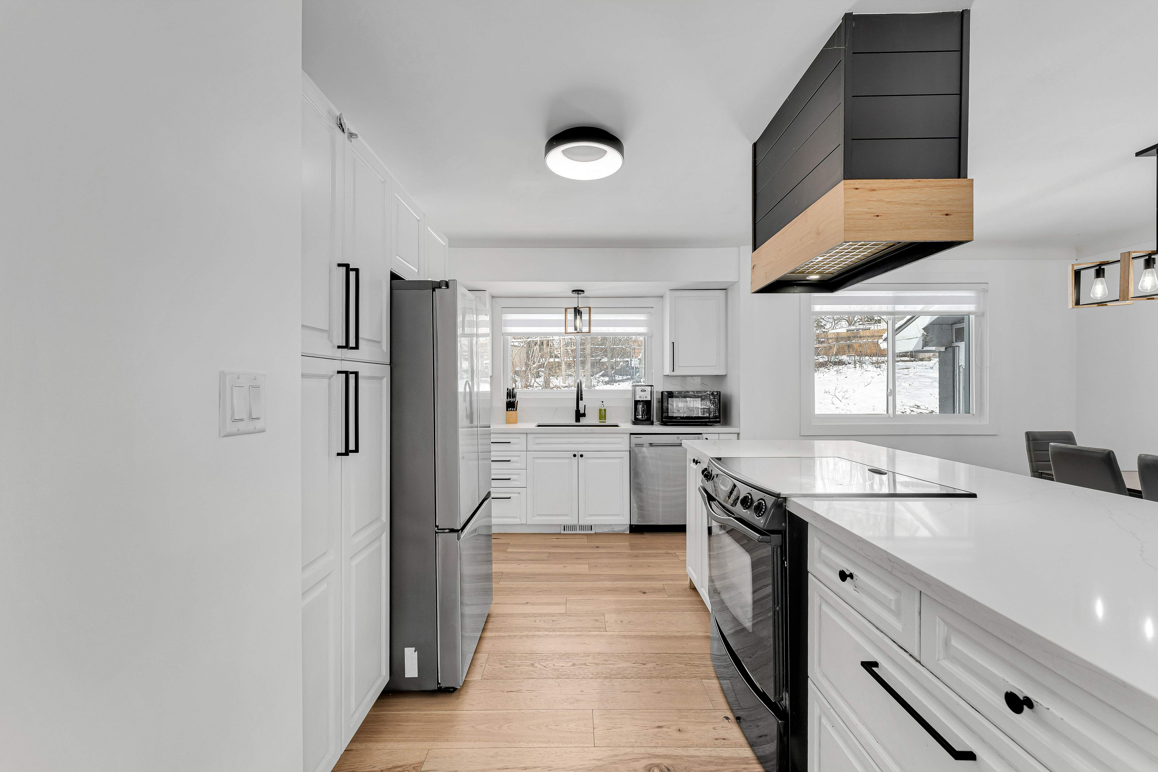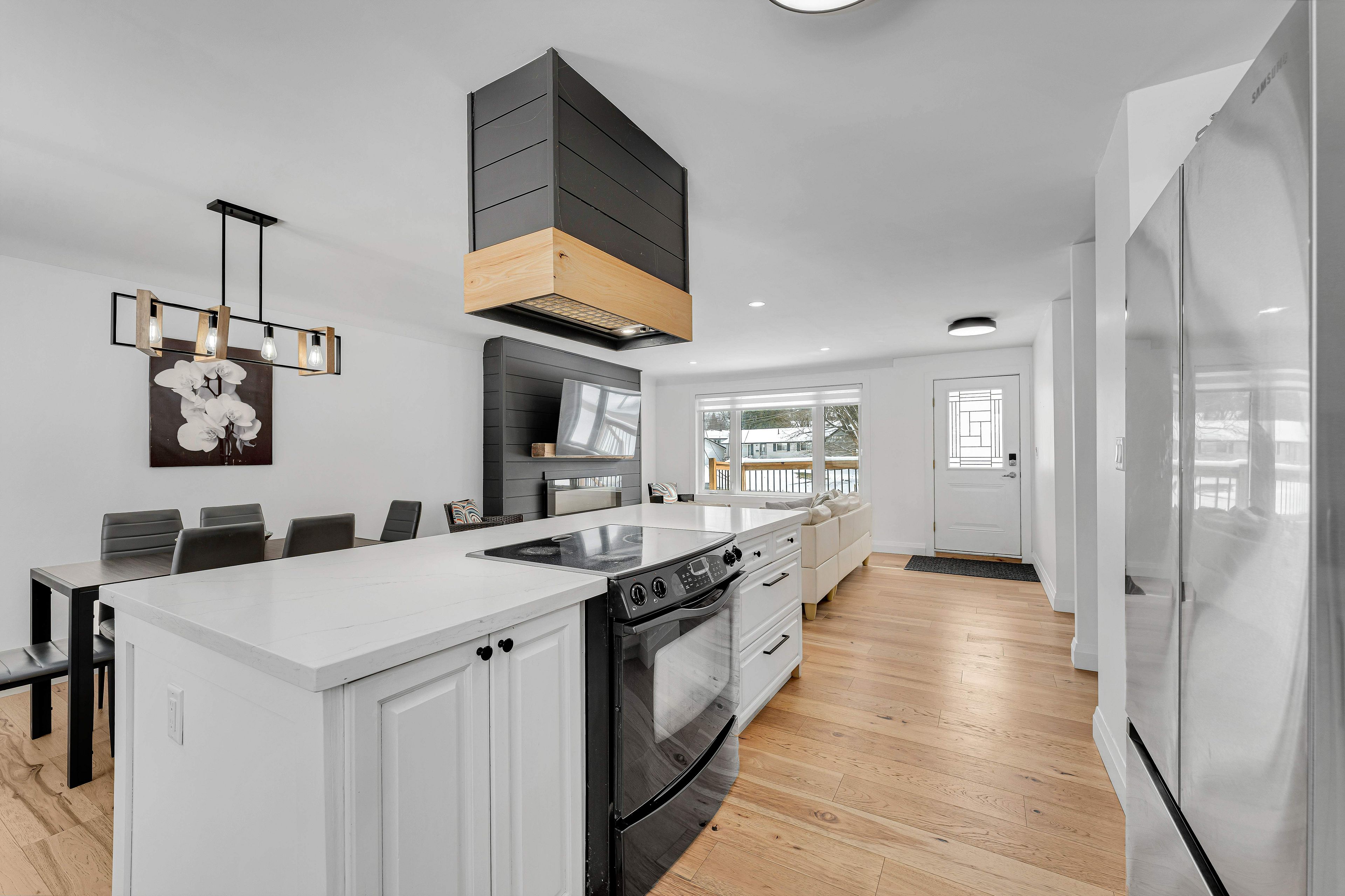 • Impressive kitchen featuring quartz counters, oversized island, and designer range hood.
