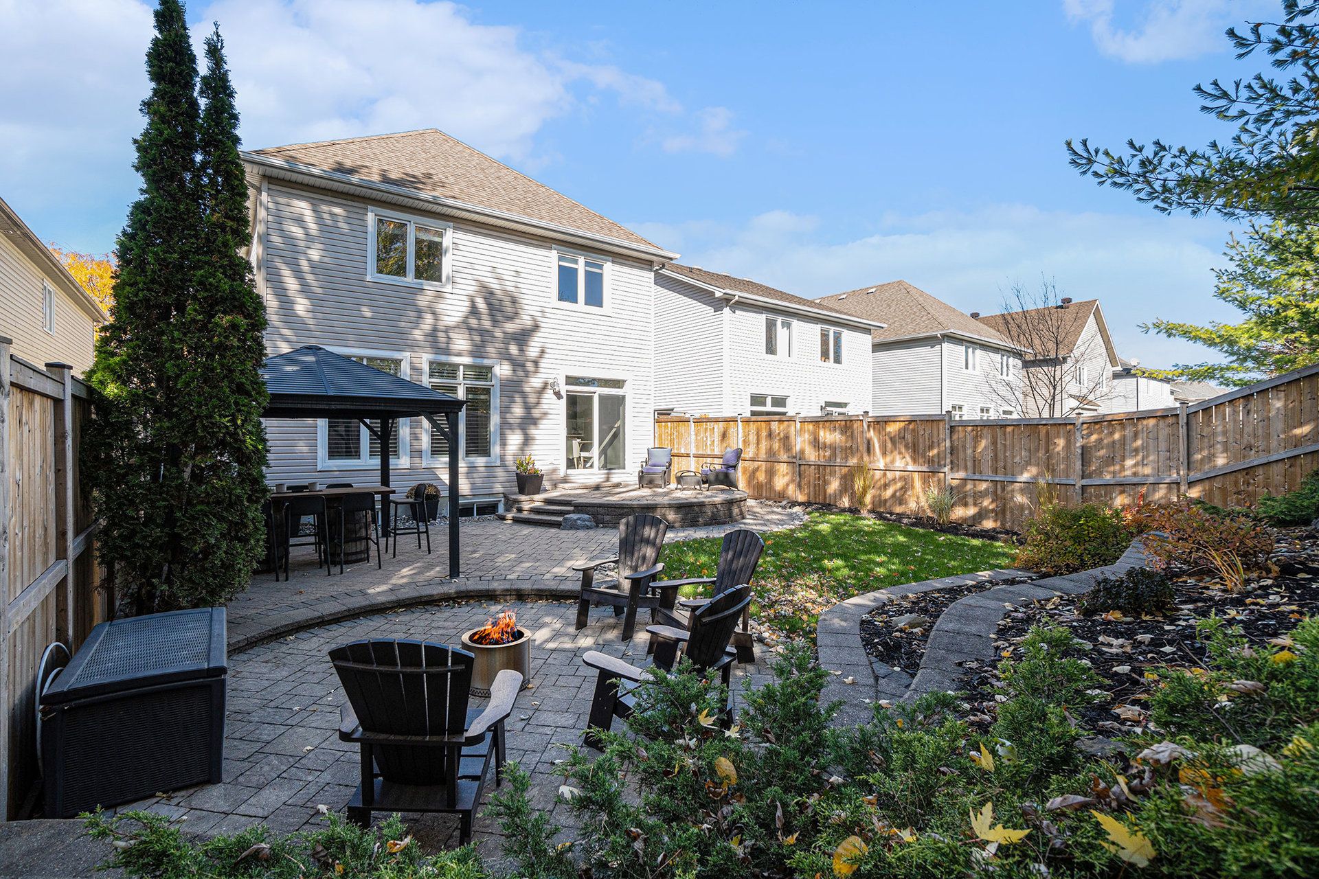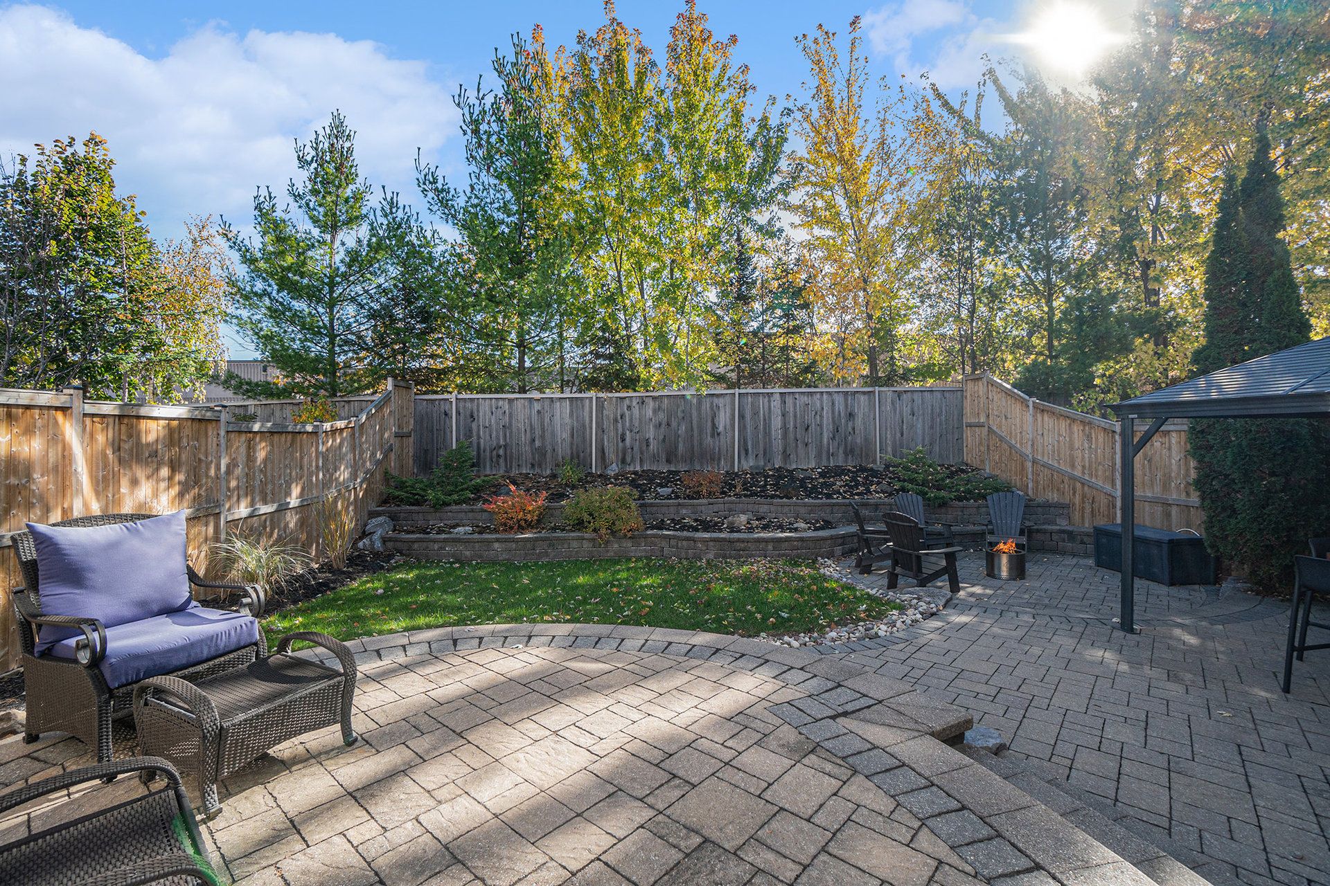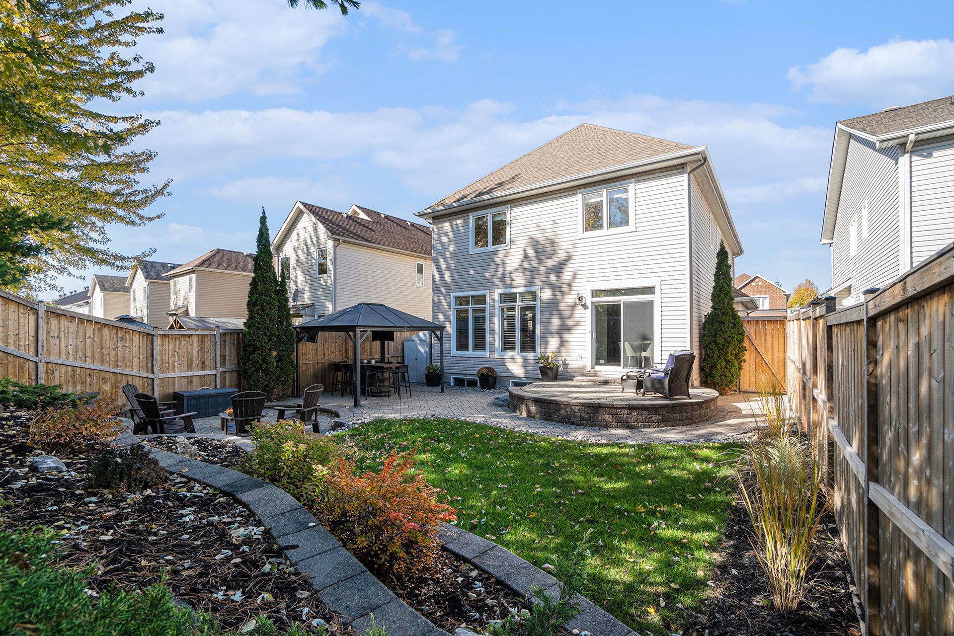 This exceptional 4-bedroom, 4-bathroom detached home stands out from every angle, offering a seamless blend of luxury, thoughtful design, and rare privacy with no rear neighbours. From the moment you arrive, the striking curb appeal makes a lasting impression, highlighted by a beautifully crafted stone walkway, high-end exterior lighting, and a covered front porch. Inside, a spacious foyer welcomes you with soft contemporary tones, rich dark hardwood floors, and refined finishes including crown moulding and california shutters throughout. The open-concept main level is designed for both comfort and style, featuring a stunning kitchen with deep-toned cabinetry, quartz countertops, a full wall of pantry storage, and a peninsula island with seating. A bright breakfast area provides direct access to the backyard. The living room offers a warm and inviting atmosphere, anchored by a custom stone fireplace wall with built-in shelving, and enhanced by smooth ceilings and pot lighting throughout. A well-appointed main-floor office offers dual workstations, ideal for productivity at home. Upstairs, the primary bedroom serves as a relaxing retreat with a cozy window bench, walk-in closet, and spa-inspired ensuite. Three additional bedrooms, a full bathroom, and a generous laundry room with built-in storage complete the upper level. The fully finished basement is designed for entertaining, featuring a 9-foot wet bar with a restaurant-style feel, commercial-grade draft beer fridge and bar fridge, a third full bathroom, and a spacious recreation area. Outdoors, the private backyard offers a peaceful escape with tiered landscaping and mature greenery. The patio features a gazebo-covered entertainment area with dedicated lounge space and a full electrical setup. Located in the desirable jackson trails community, this home is ideally situated close to catholic and public schools, parks, walking paths, shopping, and dining, with convenient access to highway 417.