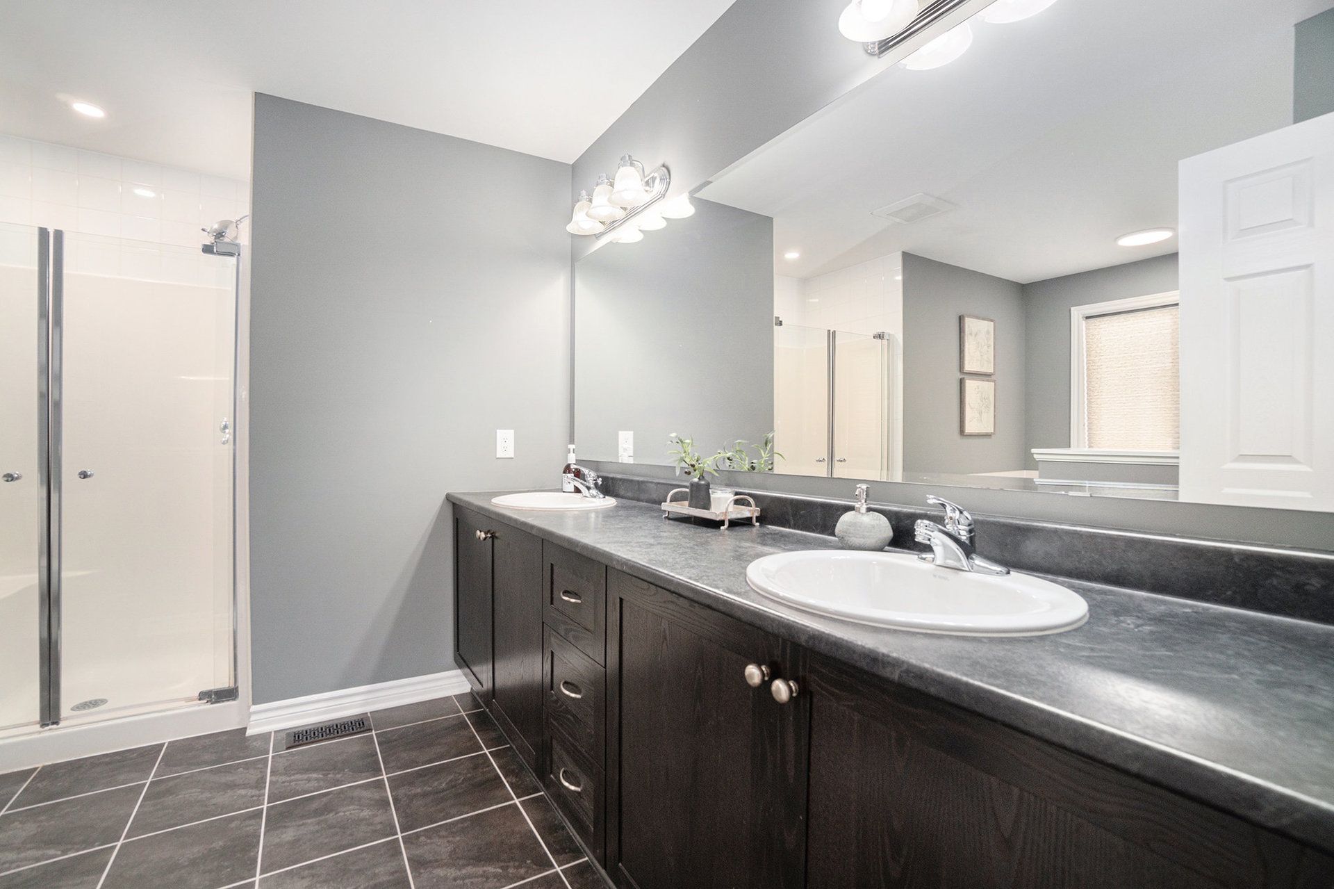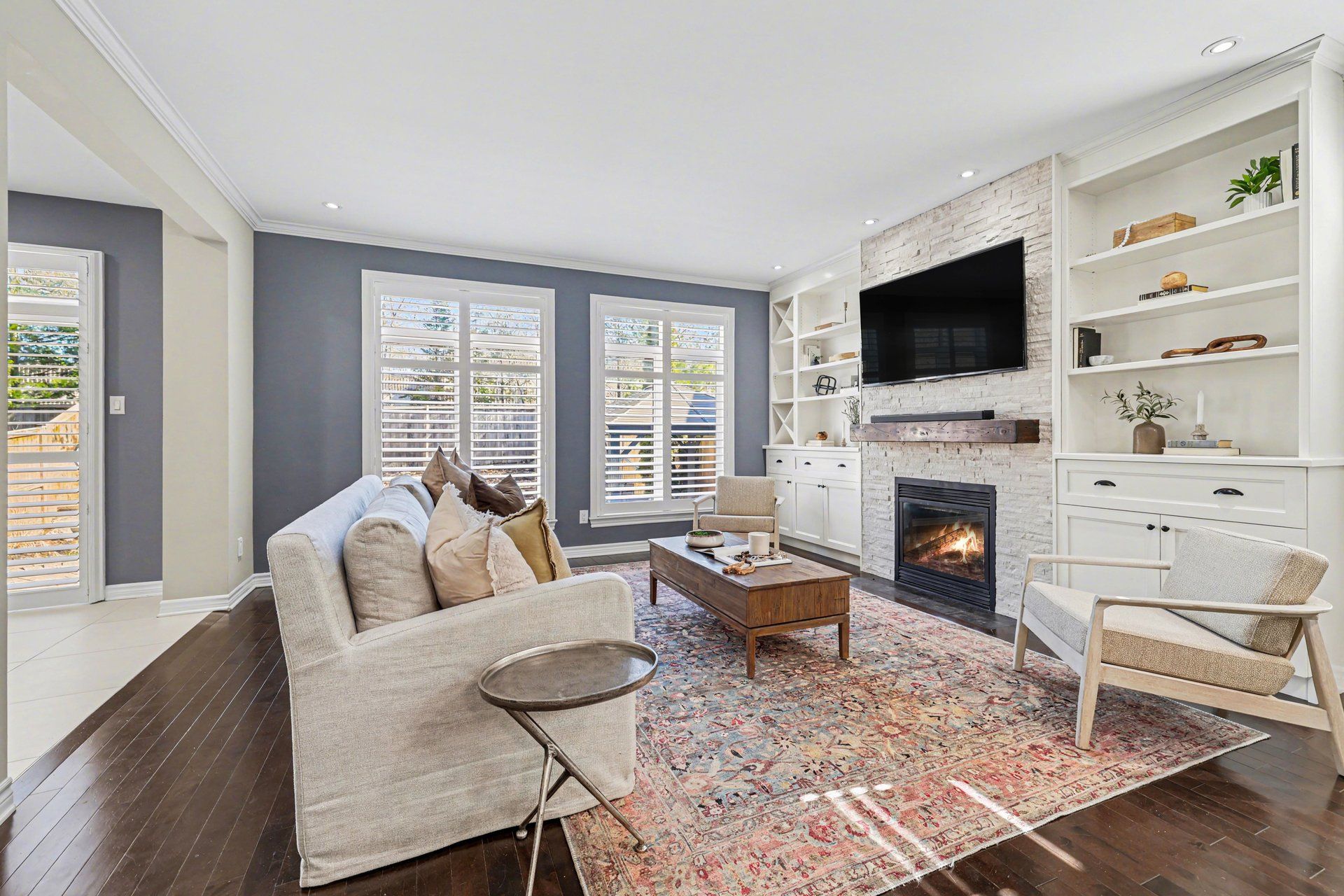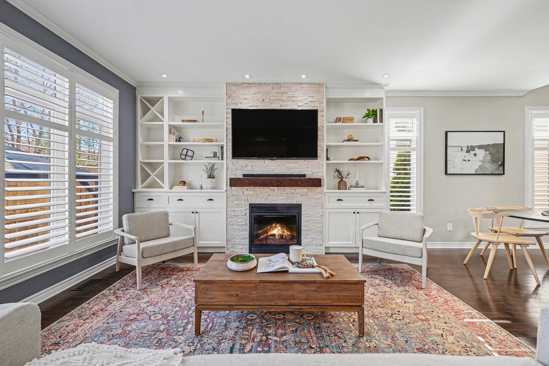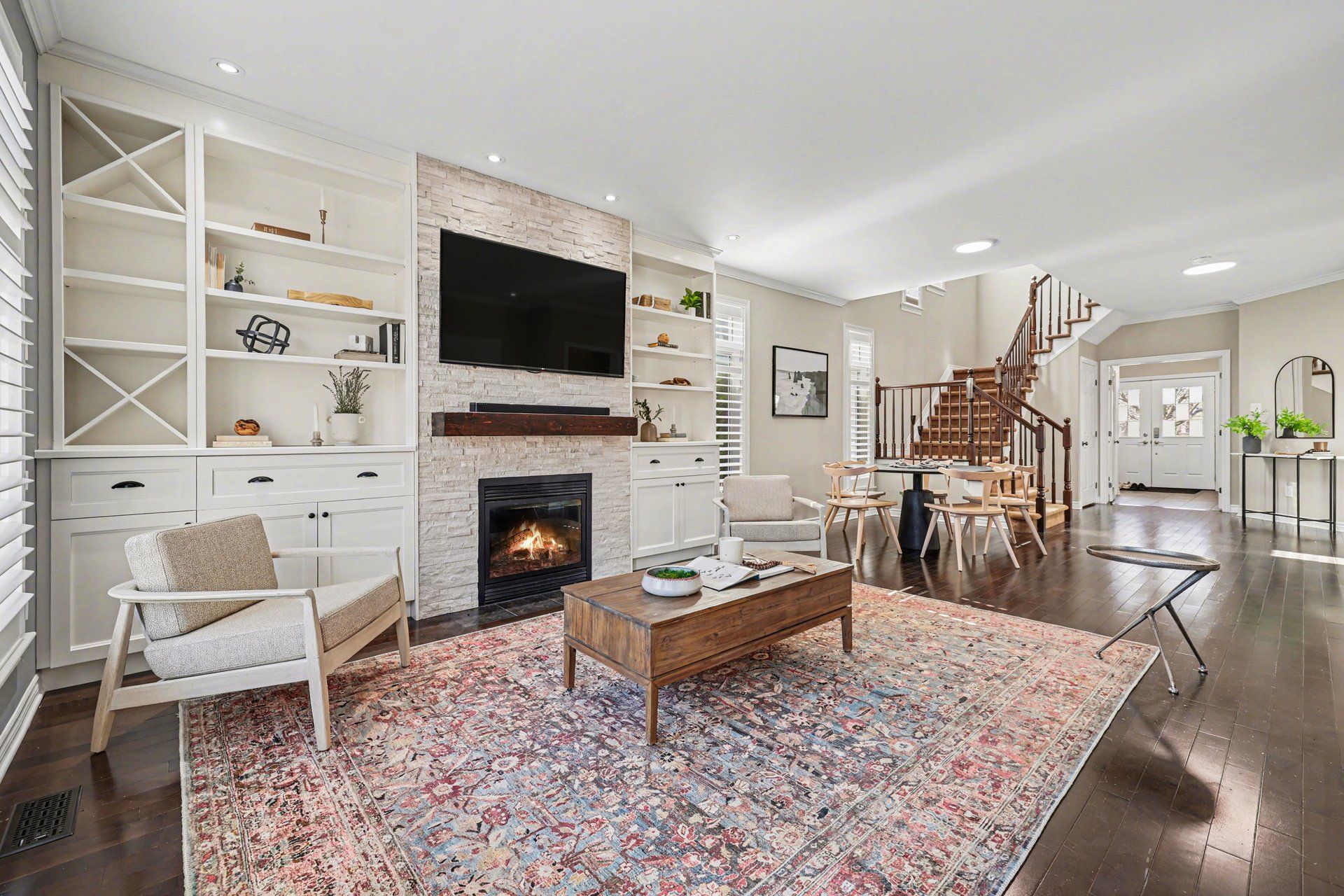 This exceptional 4-bedroom, 4-bathroom detached home stands out from every angle, offering a seamless blend of luxury, thoughtful design, and rare privacy with no rear neighbours. From the moment you arrive, the striking curb appeal makes a lasting impression, highlighted by a beautifully crafted stone walkway, high-end exterior lighting, and a covered front porch. Inside, a spacious foyer welcomes you with soft contemporary tones, rich dark hardwood floors, and refined finishes including crown moulding and california shutters throughout. The open-concept main level is designed for both comfort and style, featuring a stunning kitchen with deep-toned cabinetry, quartz countertops, a full wall of pantry storage, and a peninsula island with seating. A bright breakfast area provides direct access to the backyard. The living room offers a warm and inviting atmosphere, anchored by a custom stone fireplace wall with built-in shelving, and enhanced by smooth ceilings and pot lighting throughout. A well-appointed main-floor office offers dual workstations, ideal for productivity at home. Upstairs, the primary bedroom serves as a relaxing retreat with a cozy window bench, walk-in closet, and spa-inspired ensuite. Three additional bedrooms, a full bathroom, and a generous laundry room with built-in storage complete the upper level. The fully finished basement is designed for entertaining, featuring a 9-foot wet bar with a restaurant-style feel, commercial-grade draft beer fridge and bar fridge, a third full bathroom, and a spacious recreation area. Outdoors, the private backyard offers a peaceful escape with tiered landscaping and mature greenery. The patio features a gazebo-covered entertainment area with dedicated lounge space and a full electrical setup. Located in the desirable jackson trails community, this home is ideally situated close to catholic and public schools, parks, walking paths, shopping, and dining, with convenient access to highway 417.