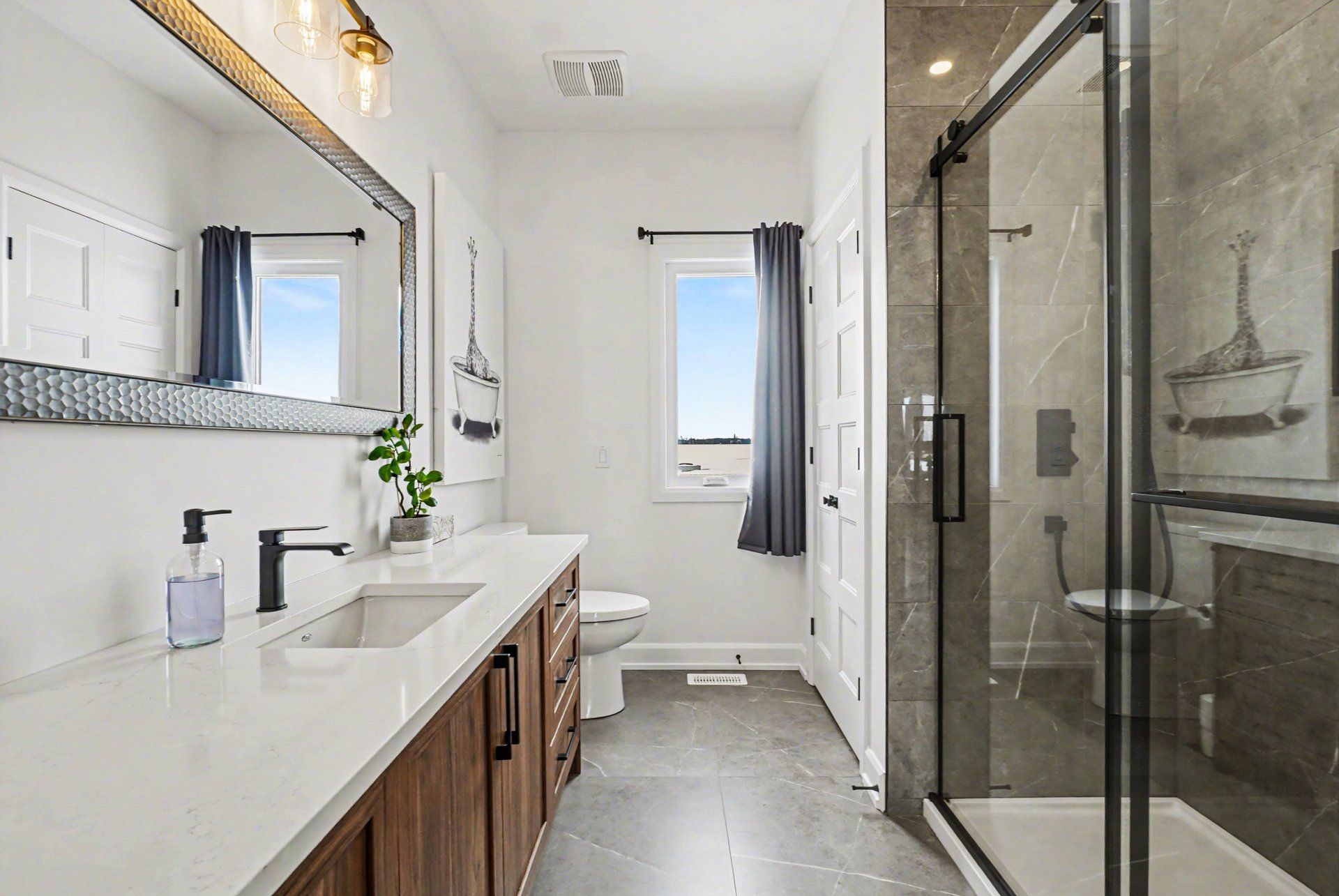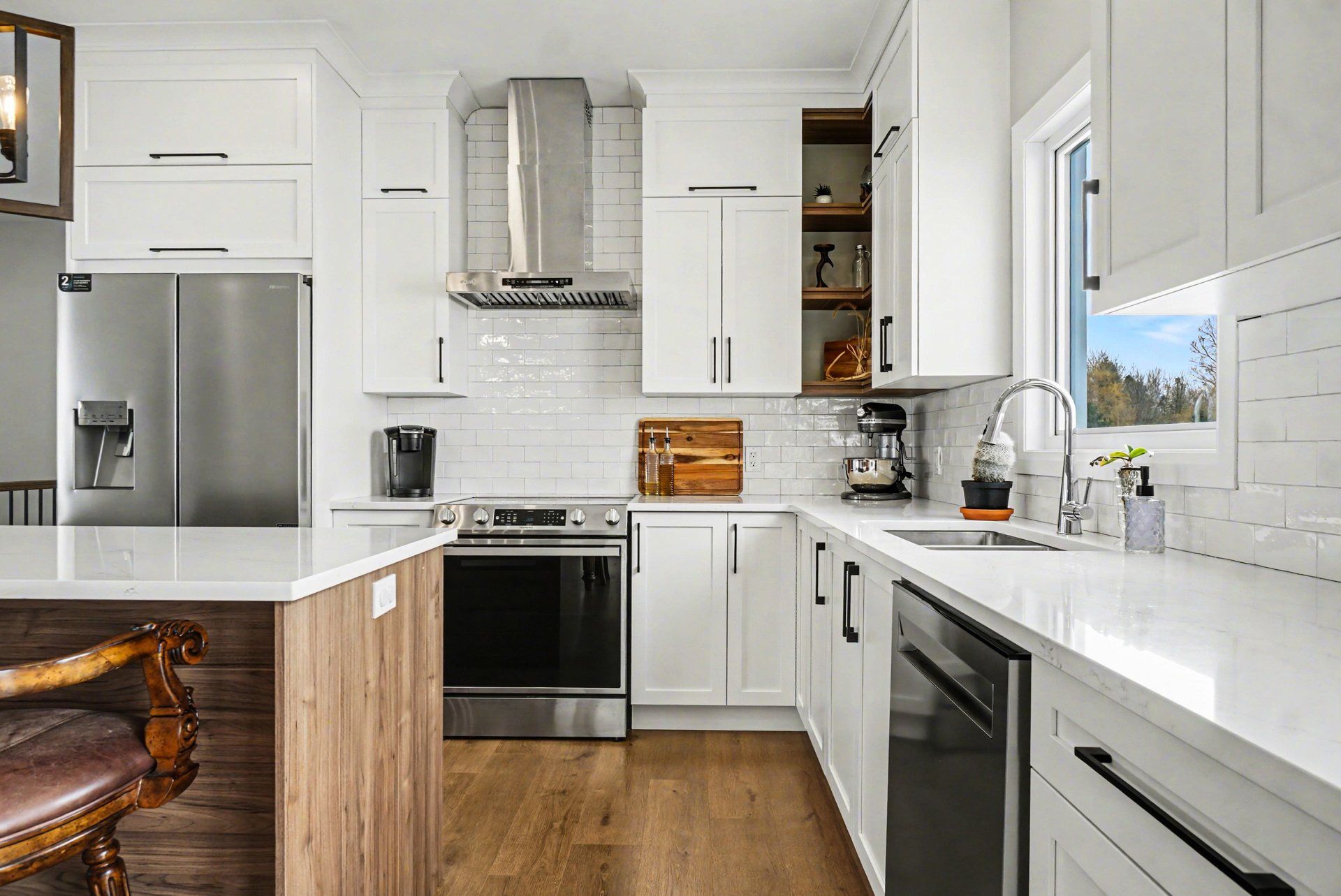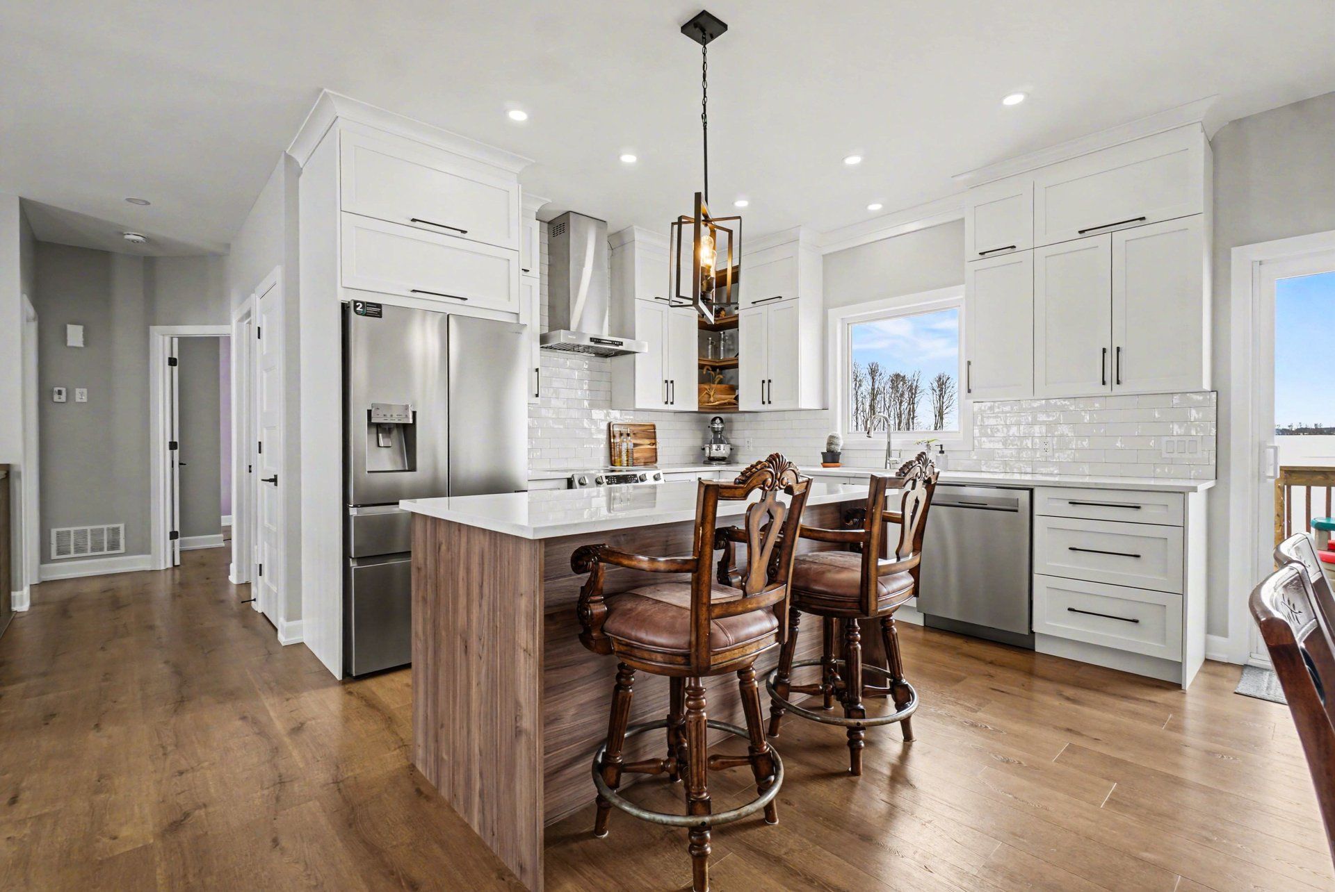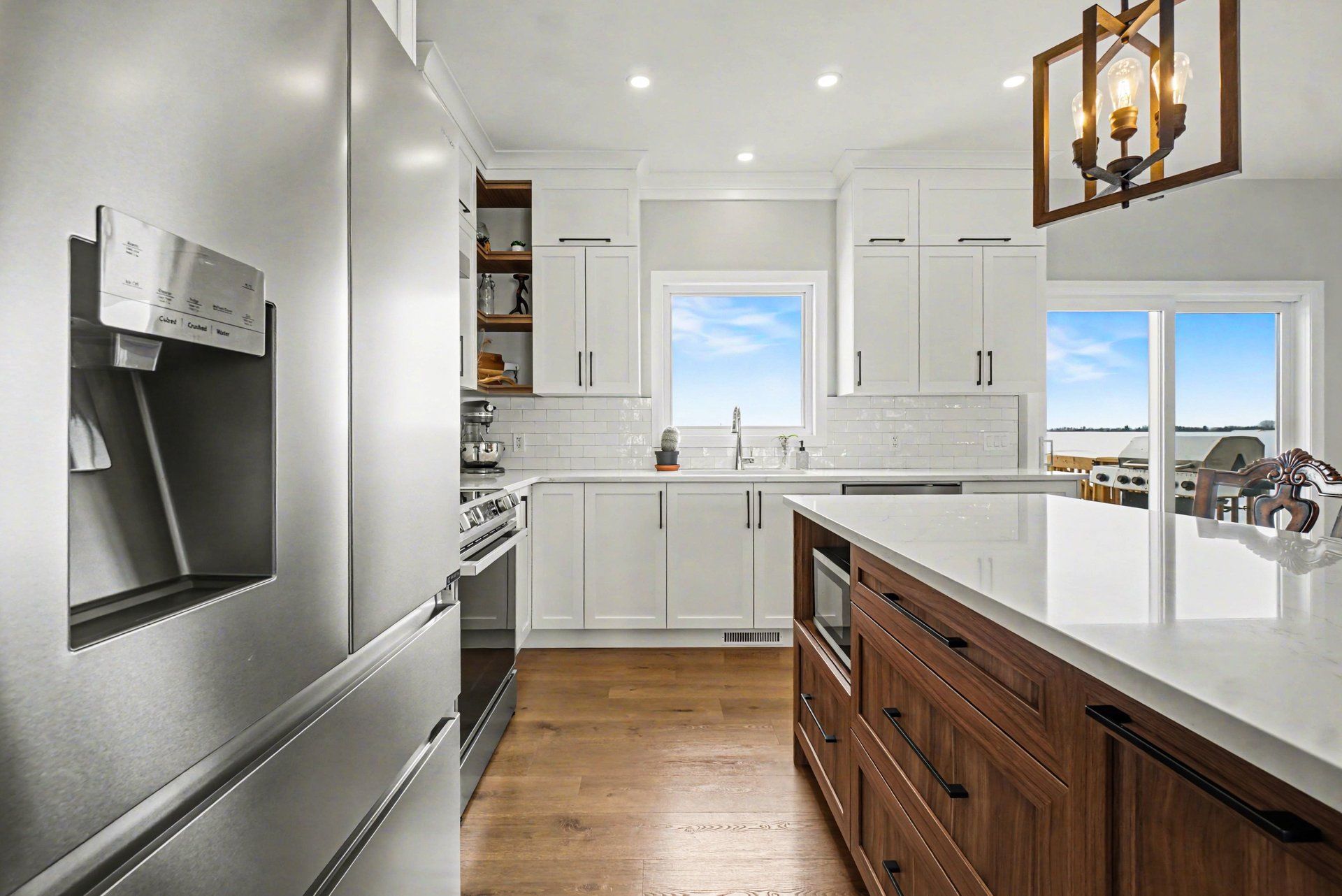 • Beautifully designed kitchen with oversized island, quartz countertops, and ample storage.