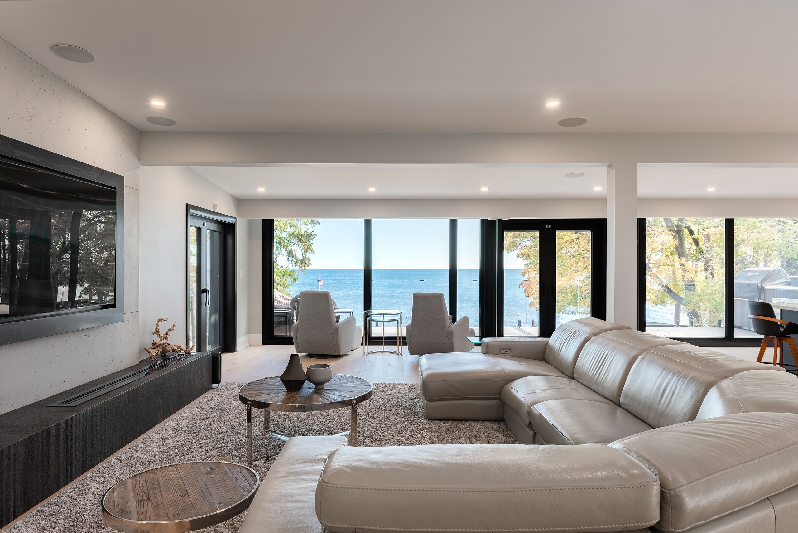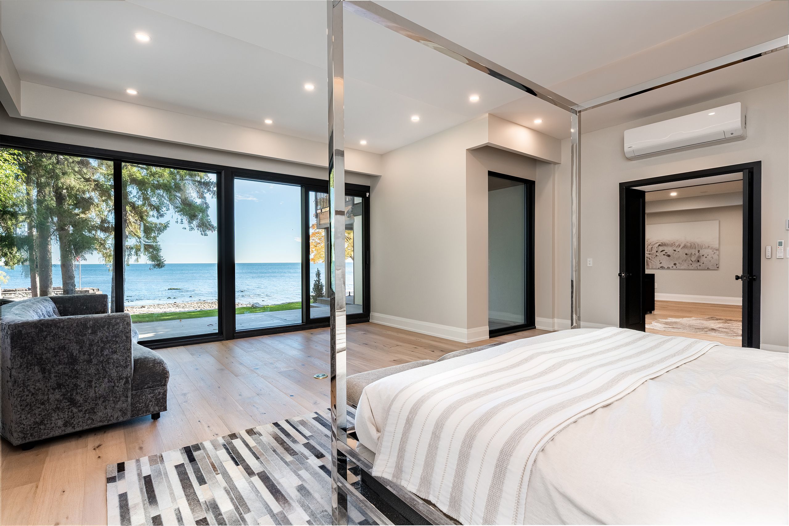 Natural serenity meets modern design at 121 edgecliffe place. Set on a rare 29,000 sq. Ft. Pie-shaped lakefront lot where appleby creek meets lake ontario, this exceptional property offers 105 feet of direct waterfront and 130 feet along the creek with riparian rights, creating an irreplaceable natural setting in the city. This fully renovated home offers over 5,200 sq. Ft. Of finished living space with floor-to-ceiling windows that draw the lake and landscape into every room. The open-concept main level features 12-foot peaked ceilings, engineered light hardwood, and dark-framed windows that frame panoramic southern views. A chef's kitchen anchors the space with a large island and top-tier appliances, ideal for entertaining. The walkout lower level accommodates four bedrooms, each with its own ensuite and ductless air conditioning unit. The primary suite opens directly to the lakeside deck, featuring a spa-inspired ensuite with dual rain showers and a massive walk-in closet with custom cabinetry. Radiant in-floor heating extends throughout the home for year-round comfort. Multiple outdoor living spaces blur the line between indoors and out. A covered lower deck and expansive upper terrace with built-in bbq maximize lakefront enjoyment and capture the home's stunning setting. Modern. Peaceful. One of a kind on the water.