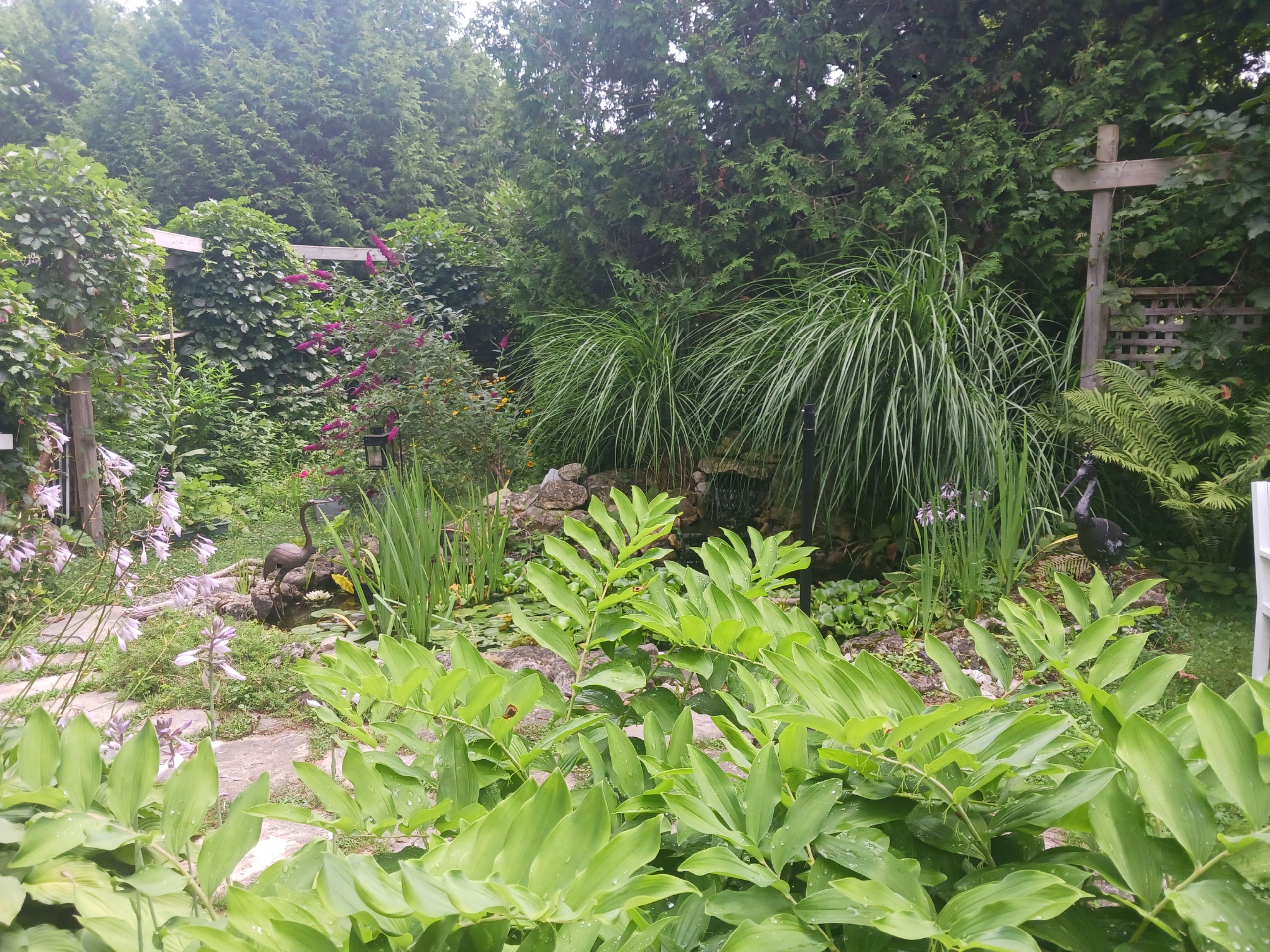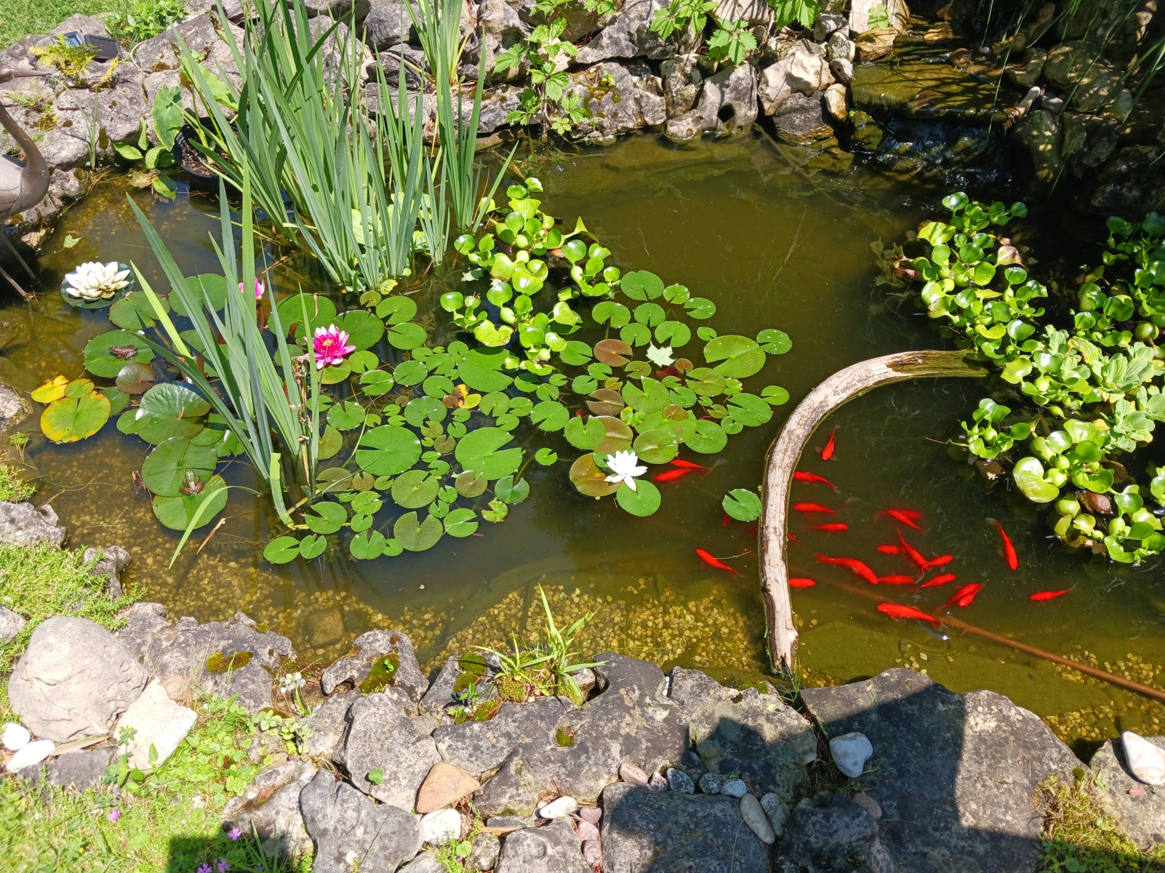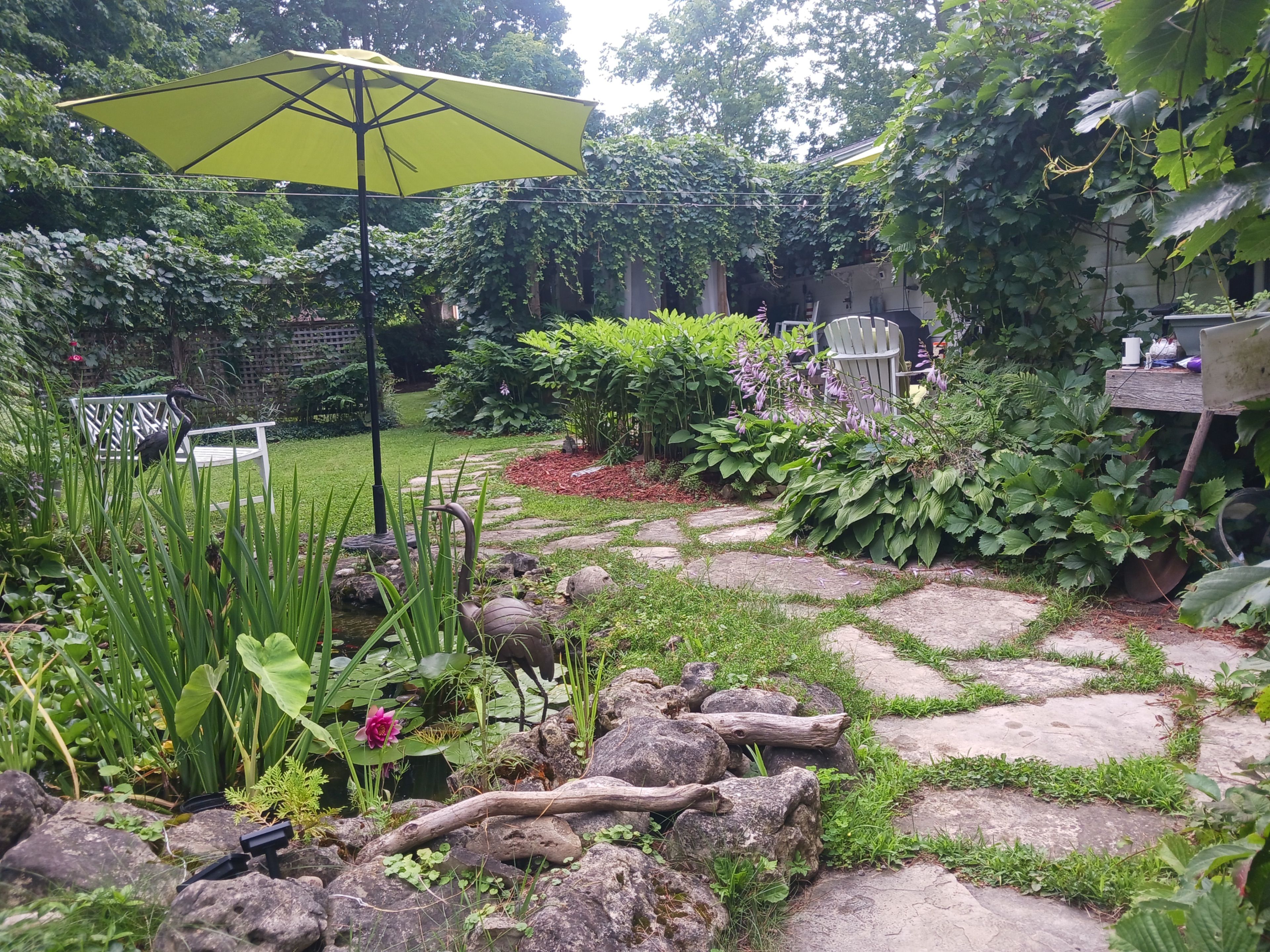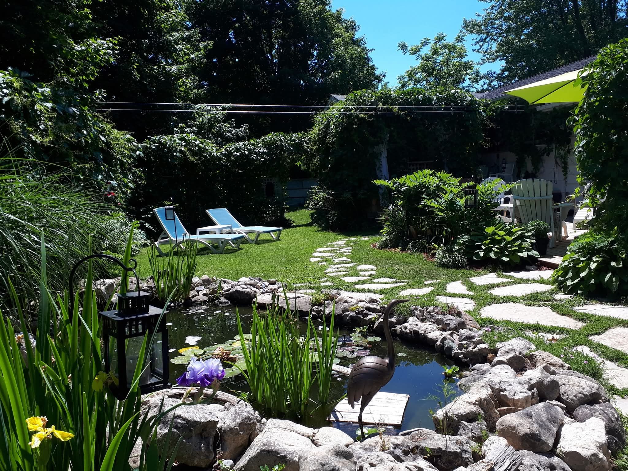 • Backyard features mature trees, gardens, and a charming koi pond.