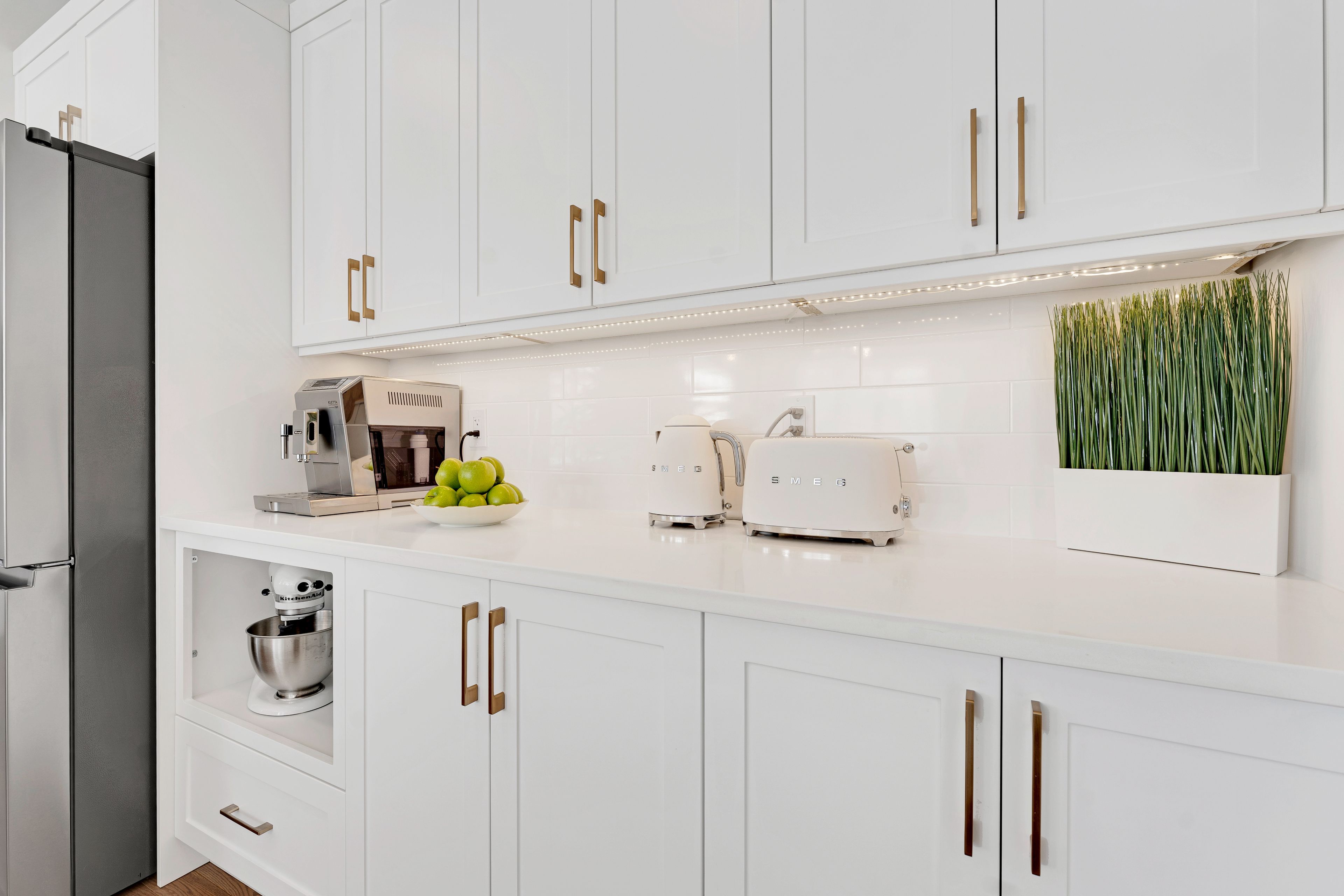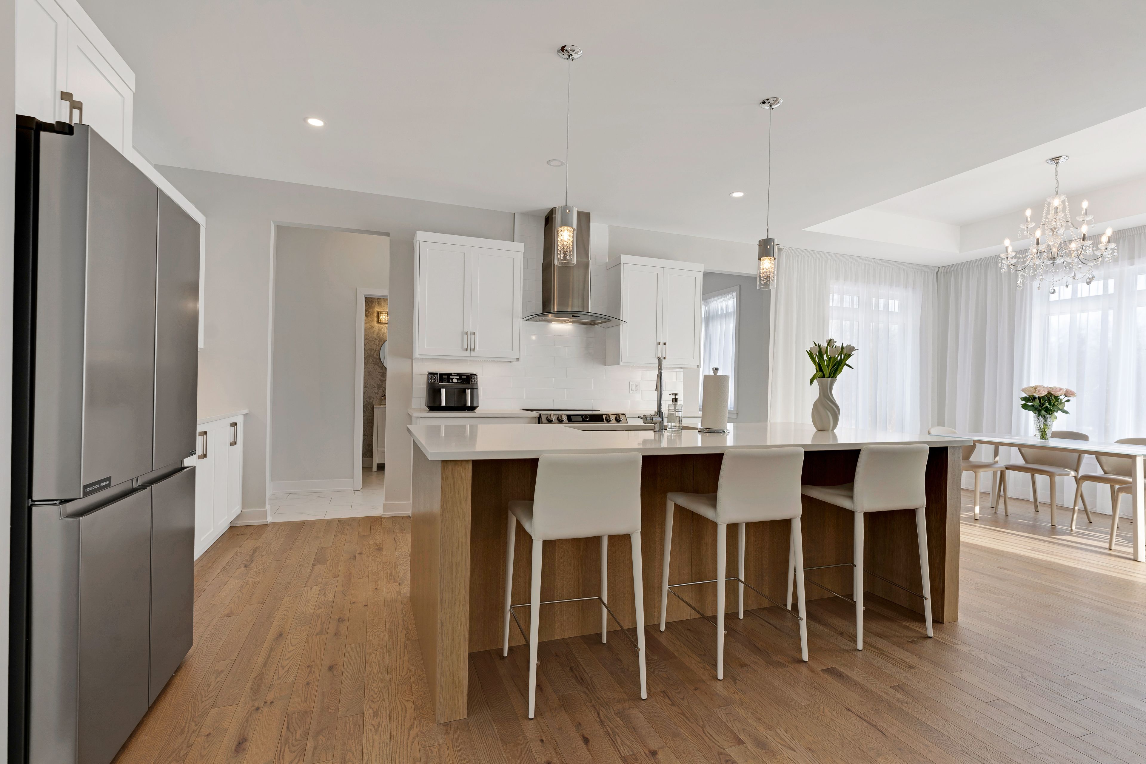 • Modern kitchen with quartz countertops and a chef's island breakfast bar.