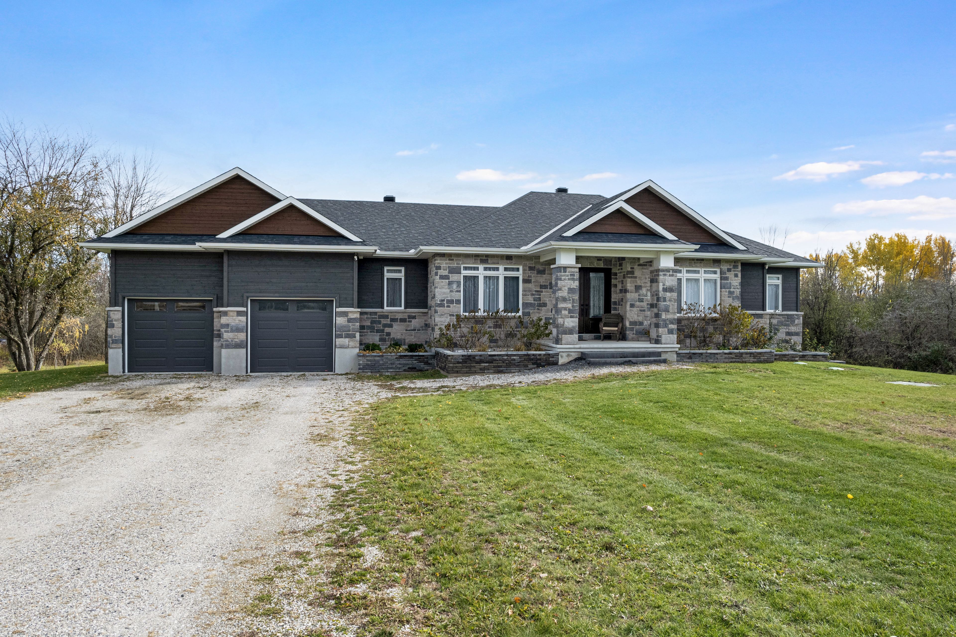Elegant walkout bungalow built in 2022, with impressive balance of architecture style and modern contemporary design. Front cortona stone with accents of quality maibec wood siding both complement each other while blending into the surrounding two acres. Front porch graciously welcomes you with set of beveled glass doors that open into big bright foyer and double closet. The open floor plan is a palette of calming soft colours and full of natural light flowing in from all the tall windows. Modern hardwood, luxury vinyl and ceramic flooring through this spacious 3+2 bedroom, 3. 5 bathroom home. Living room has showcase recessed shelving next to propane fireplace that is the ideal gathering place for family and friends. Dining area defined by attractive drop ceiling plus wrap-around windows and patio doors to deck. You'll love the kitchen with its two-tone cabinetry, gold-accent hardware, quartz countertops and subway tile backsplash; grand chef island-breakfast bar fits 4-5 comfortably. Primary suite retreat includes quality blackout curtains and full wall of closets; luxurious ensuite quartz vanity, makeup nook, touch-light mirrors, soaker tub and glass shower with luxury body-spa showerhead. Two more large bedrooms. Main bathroom quartz vanity, touch-light mirror and clock display; shower has exotic tile and body-spa showerhead. Main floor laundry room with cabinets and window. Lower level features luxury vinyl floors and pot lights. Rec room patio doors open to outdoors. Family room has area for entertainment centre. Den provides flex space, could be hobby room or office. Lower level also has two more bedrooms; one includes walk-in closet. Lower level 3-pc bathroom quartz vanity, touch-light mirror and soaker tub, both lower and main floors access attached double garage with its storage loft and yard door. Architectural roof shingles. And, under tarion warranty. Located on township paved road with school bus pickup. Hi-speed and cell service. 10 mins to perth.