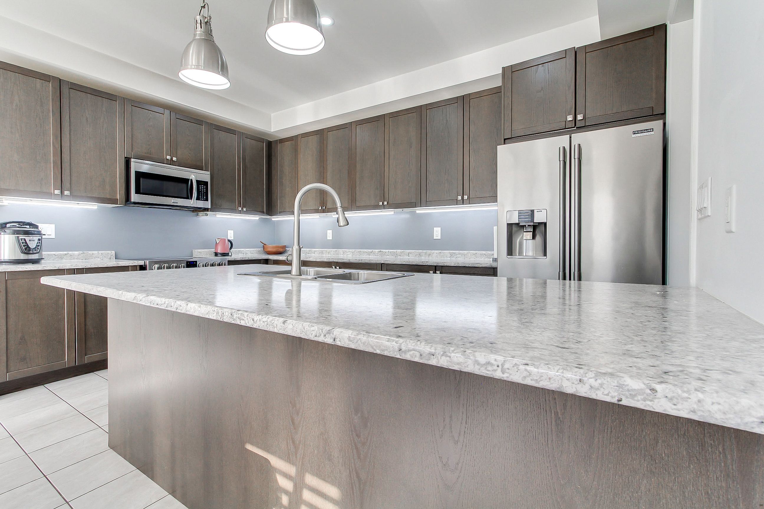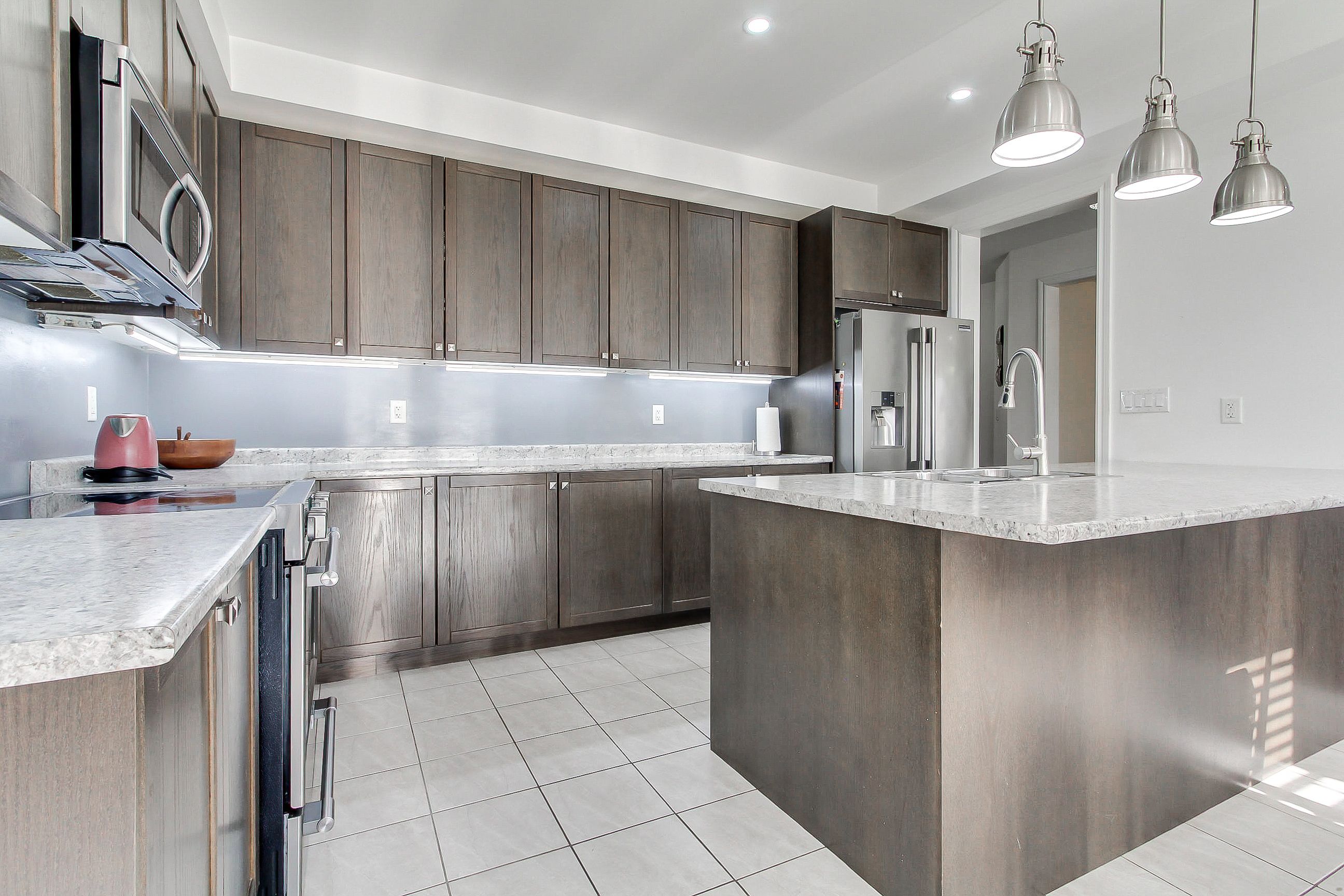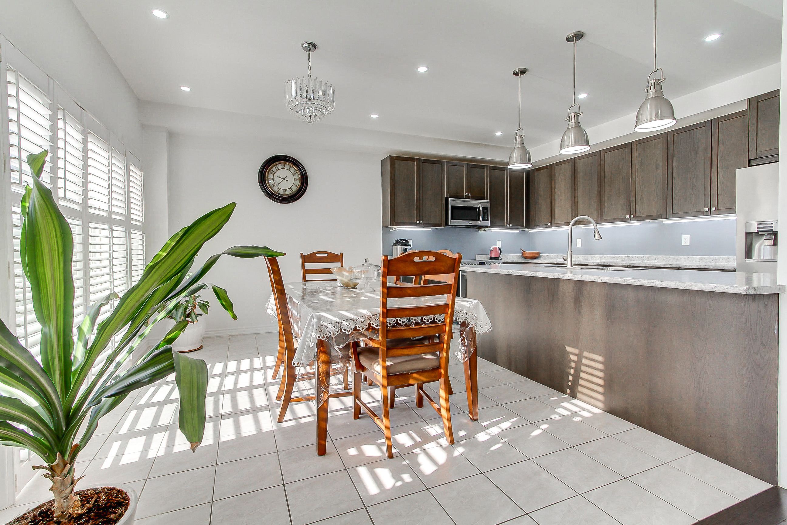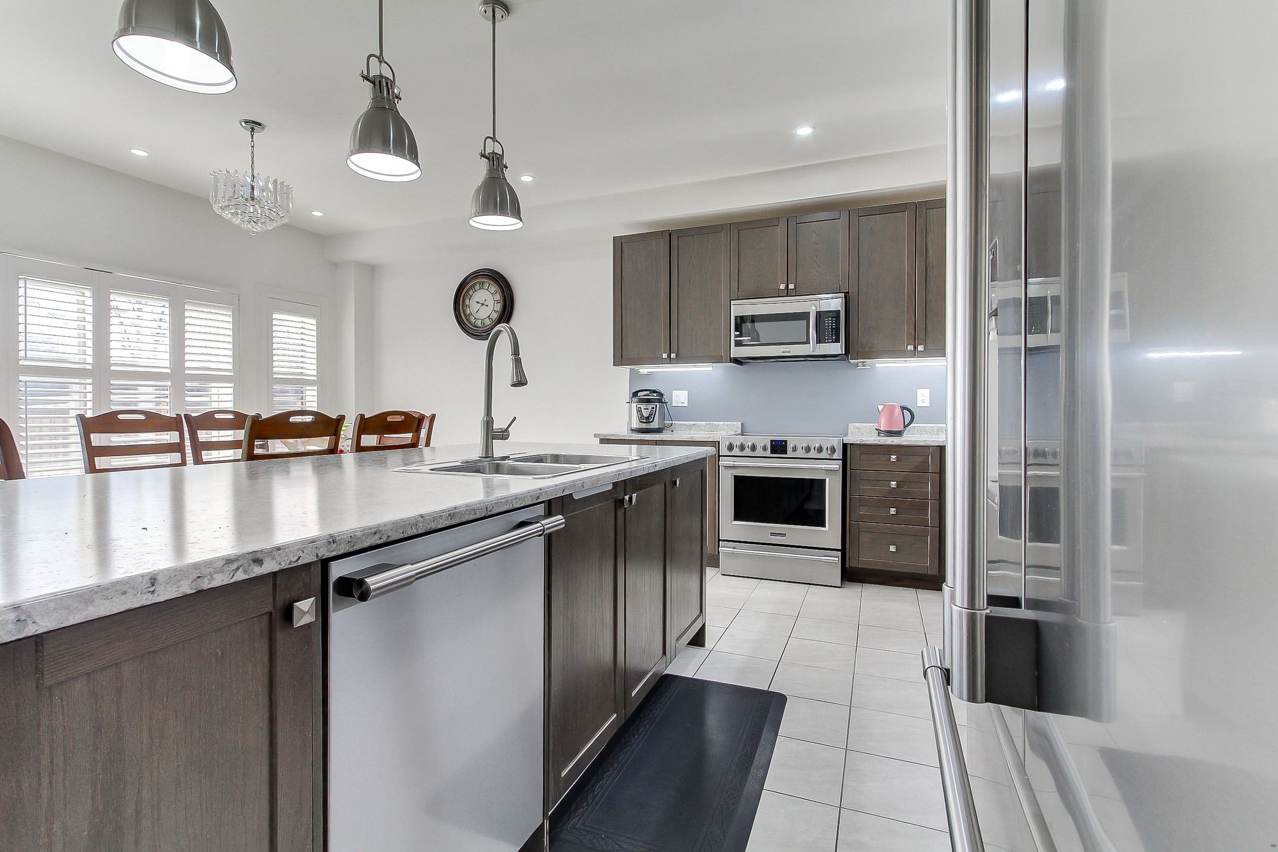 • Large eat-in kitchen with solid wood cabinetry and high-end appliances.