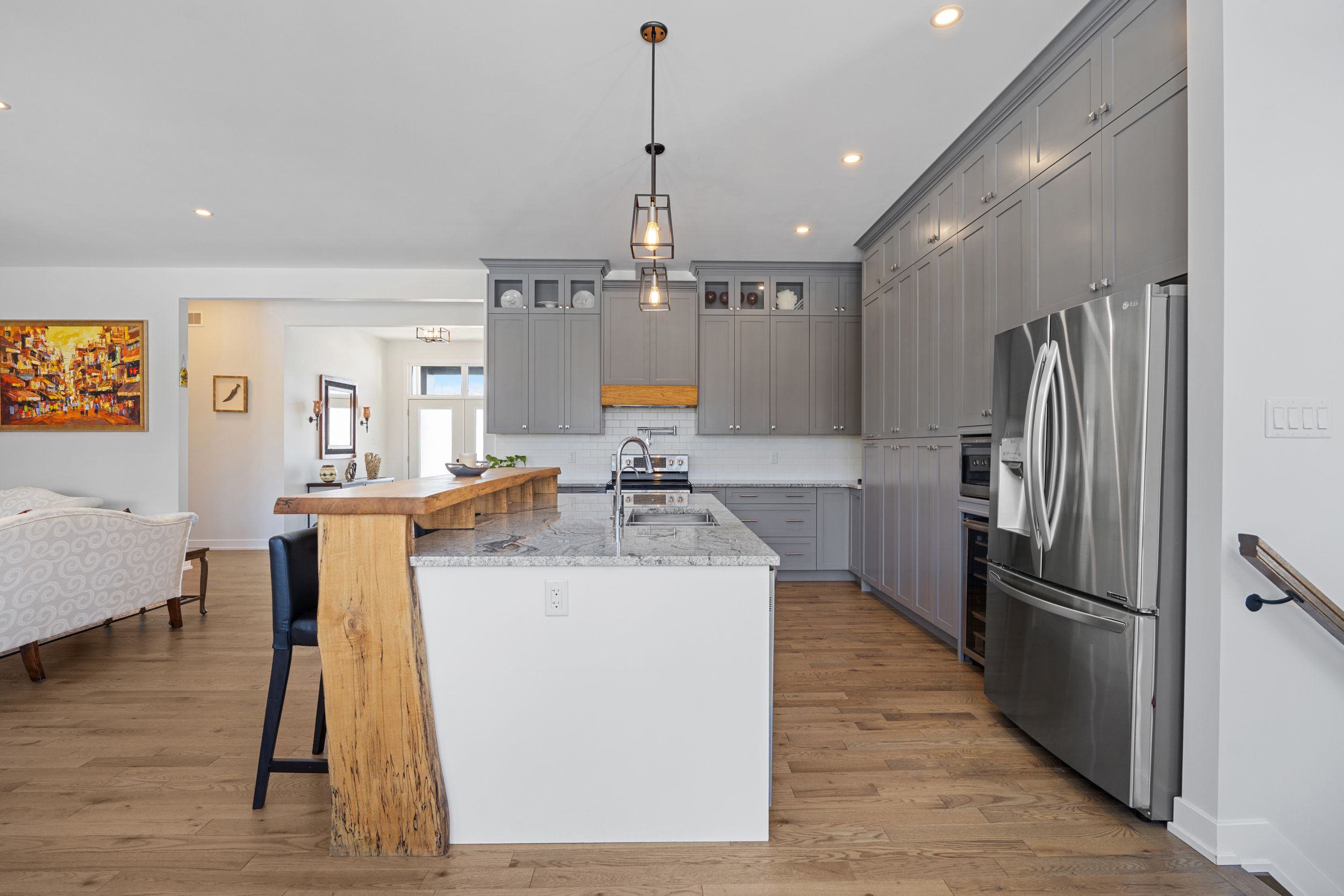 • Custom kitchen with granite counters, expanded cabinets, and a large island.