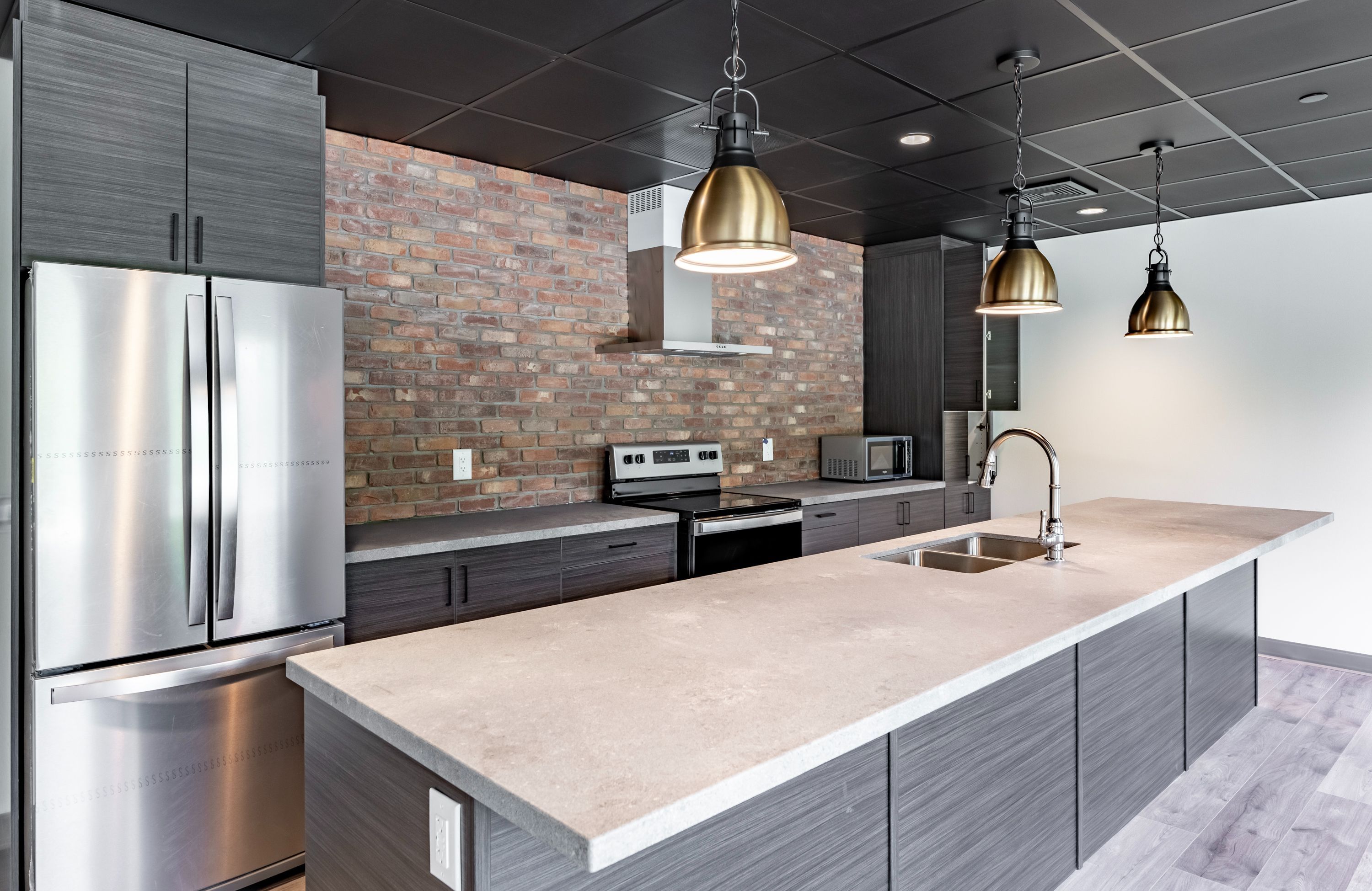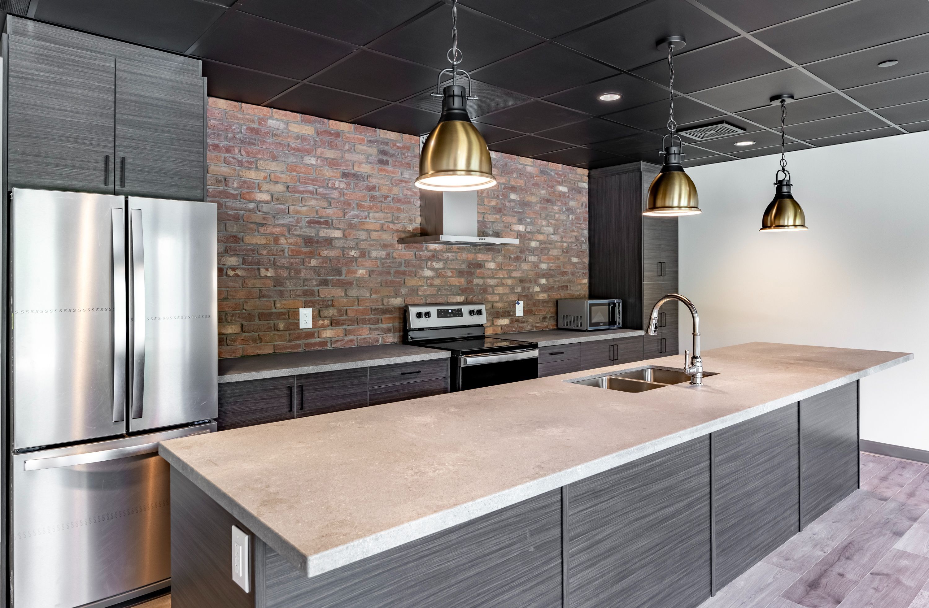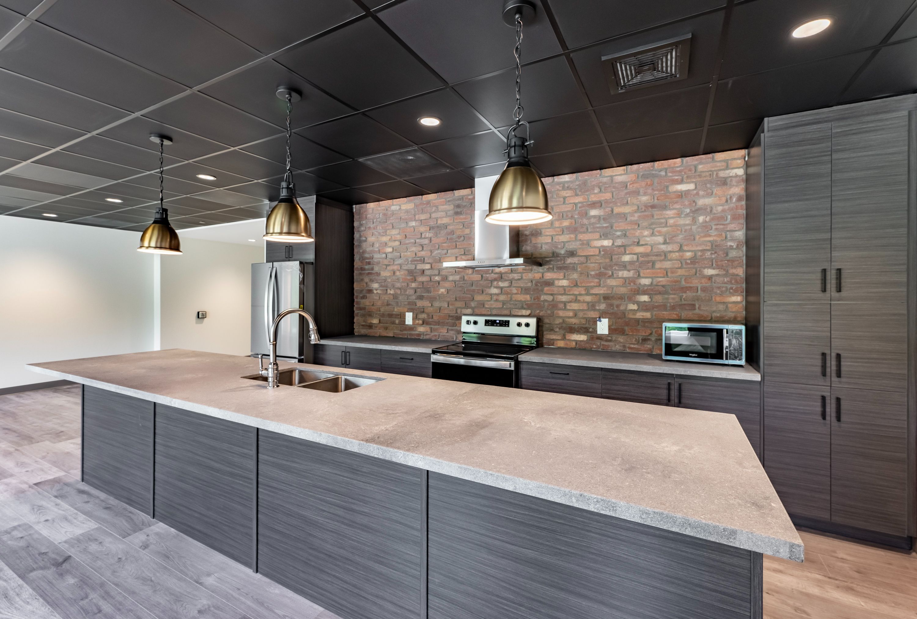 • Gorgeous kitchen with island and warm lighting for romantic dinners.