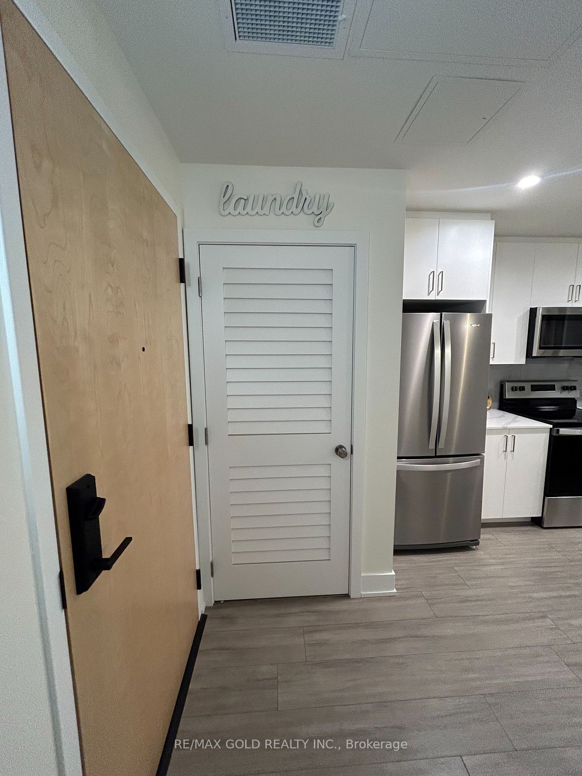 • Unique accent wall and rustic barn doors for added character.