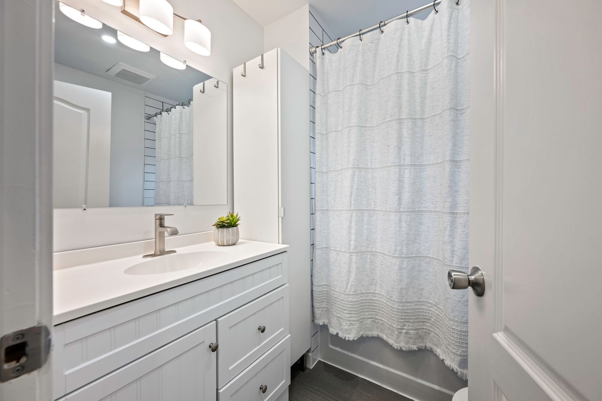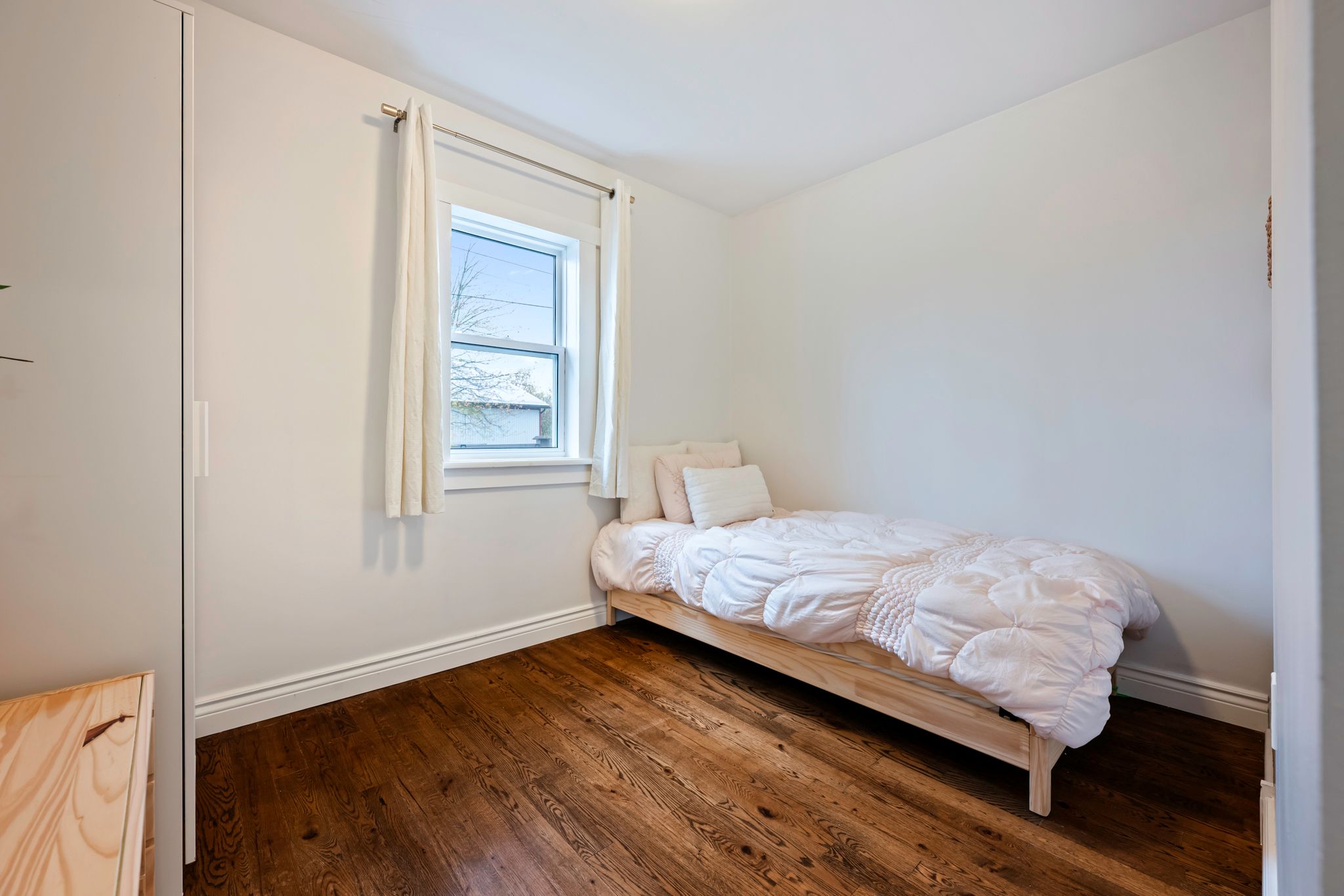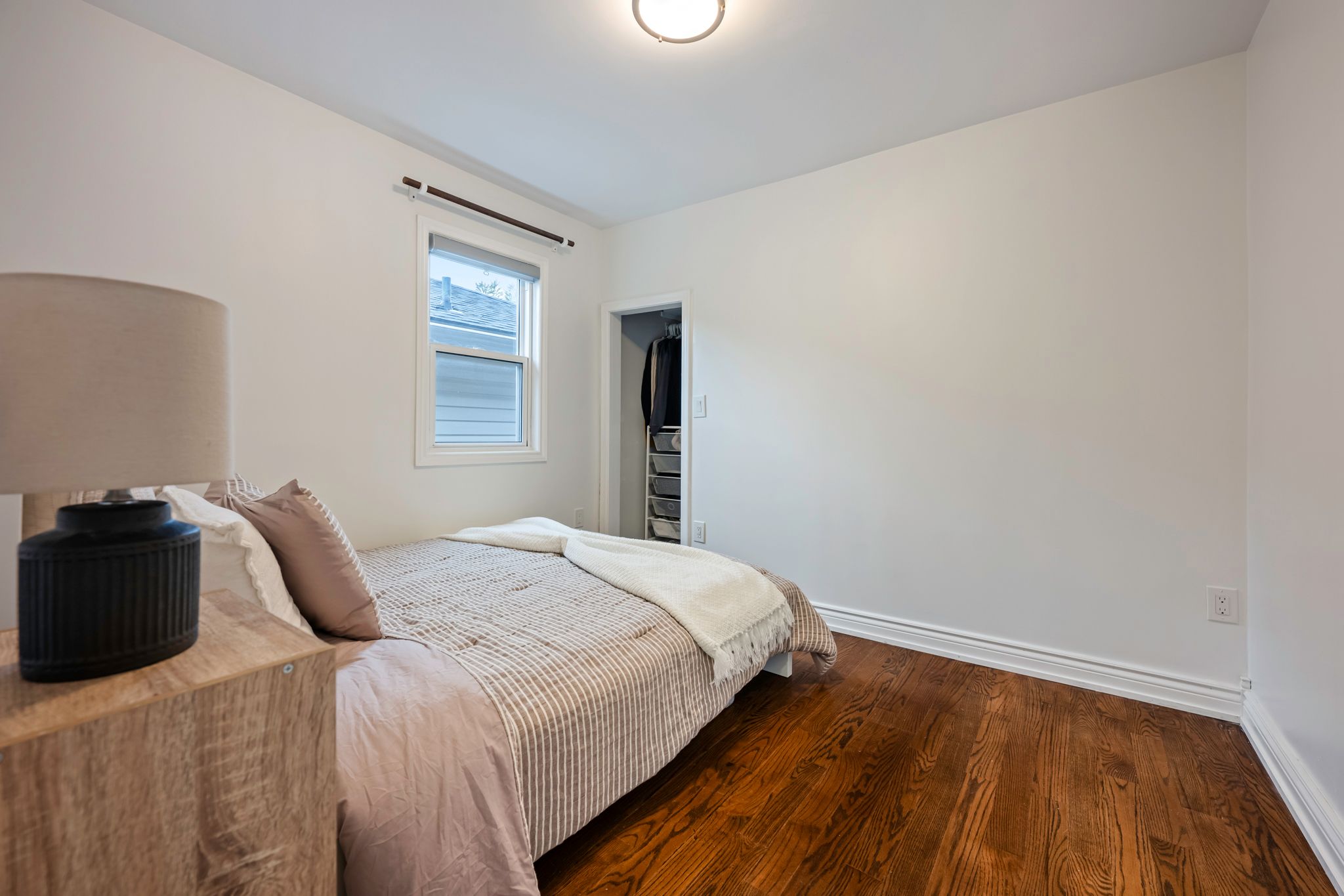 • Tastefully renovated bathroom with contemporary finishes and warm hardwood flooring.