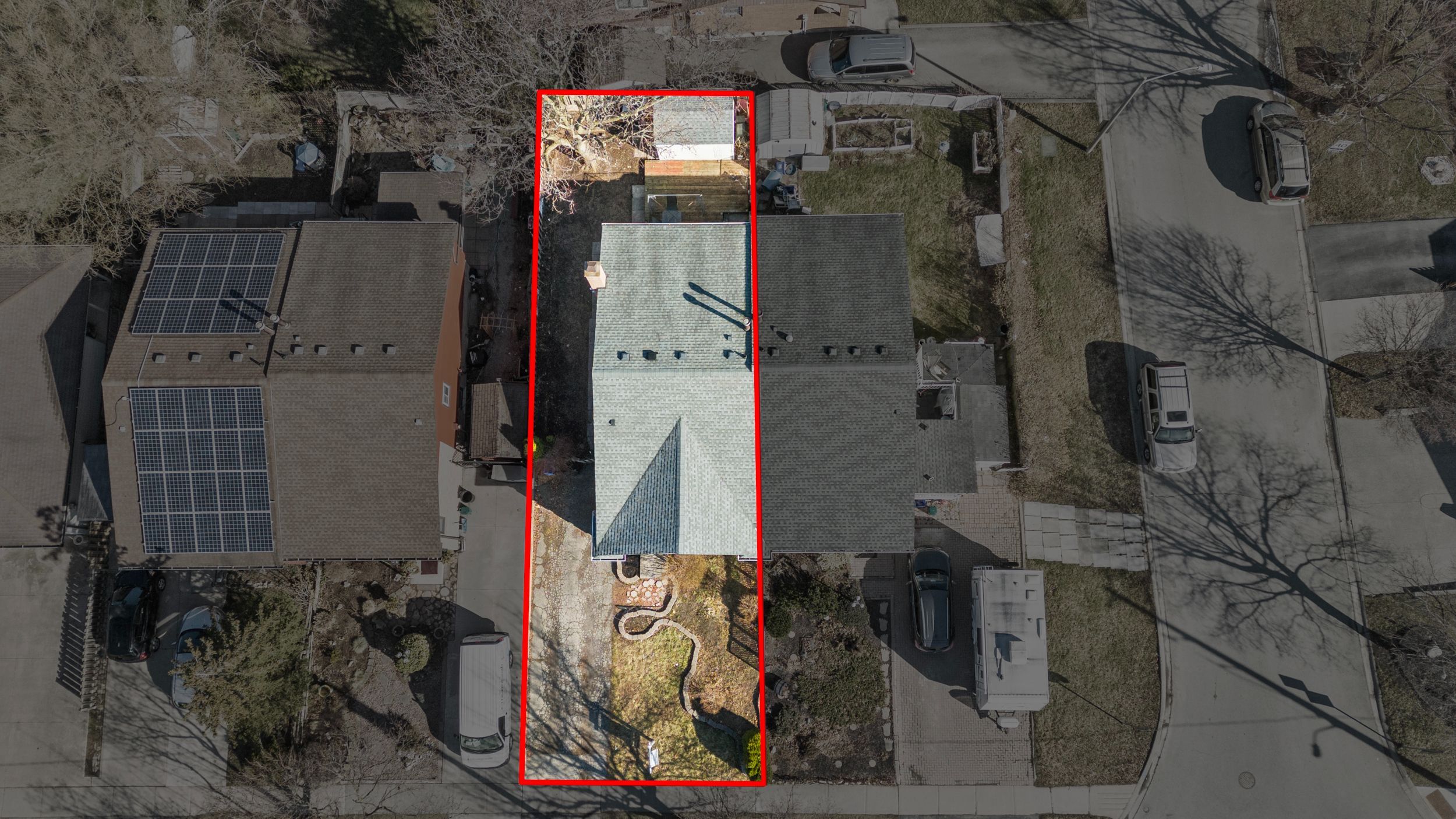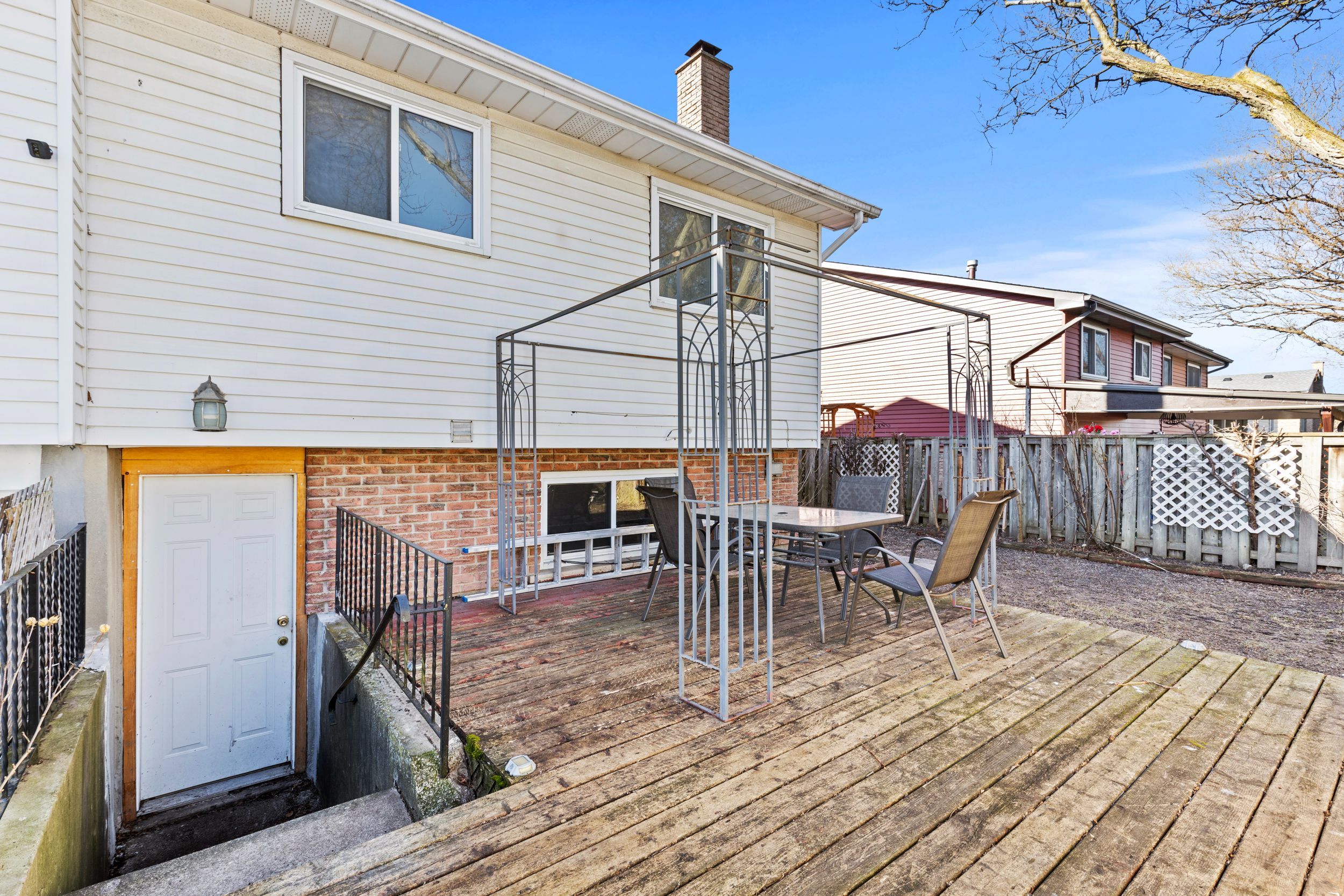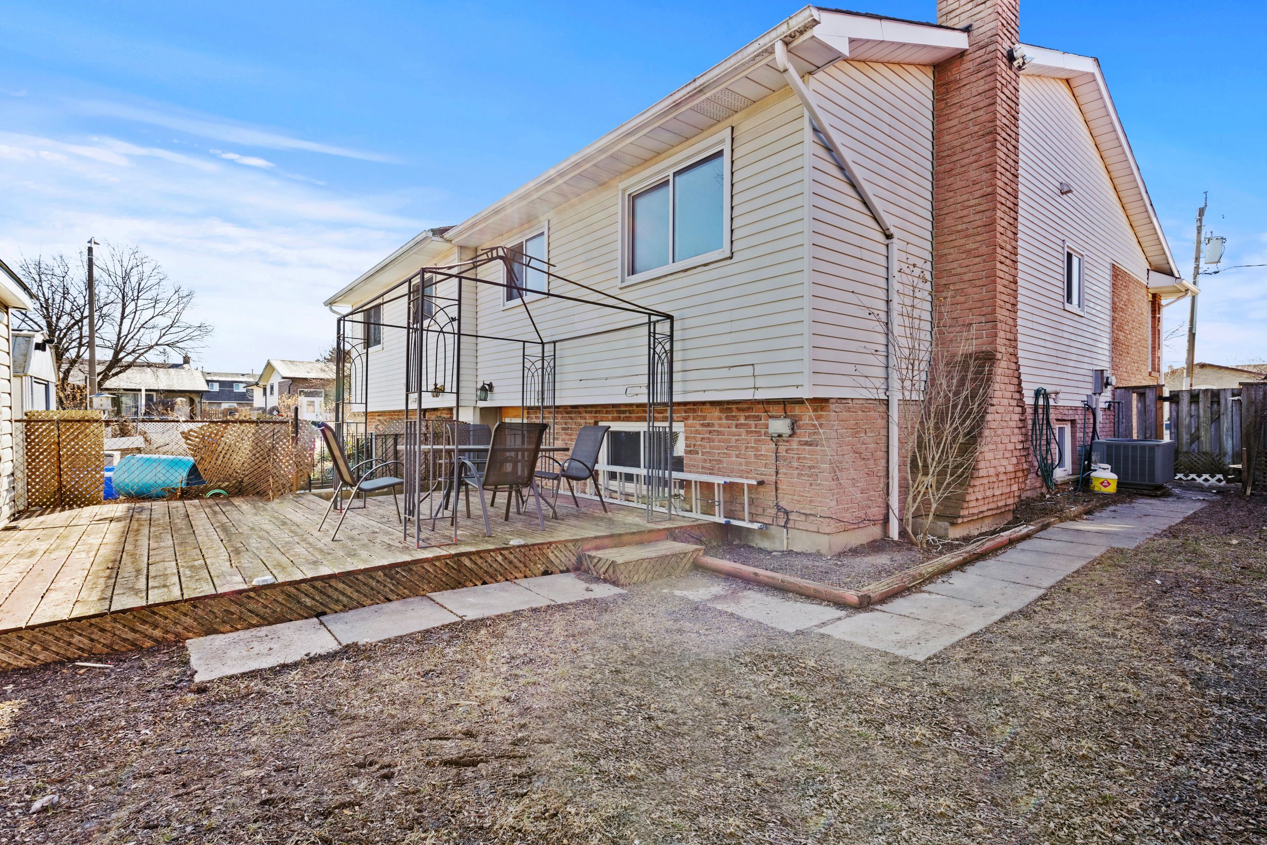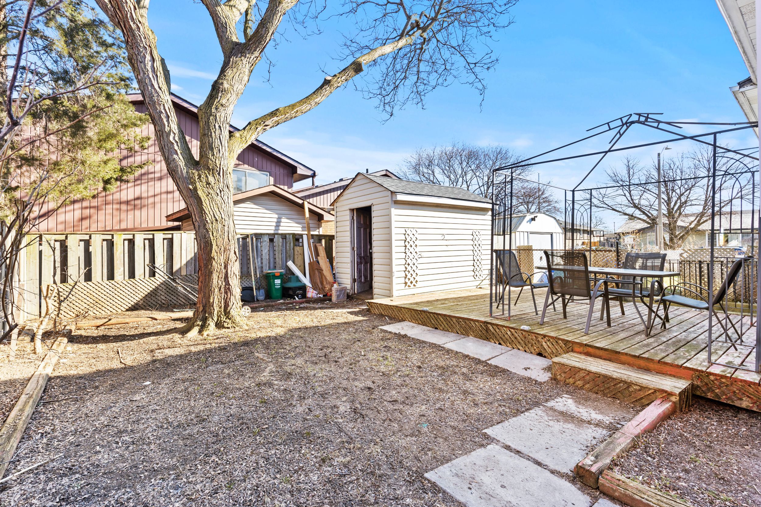 • Fully fenced backyard with a deck, garden space, and storage shed.