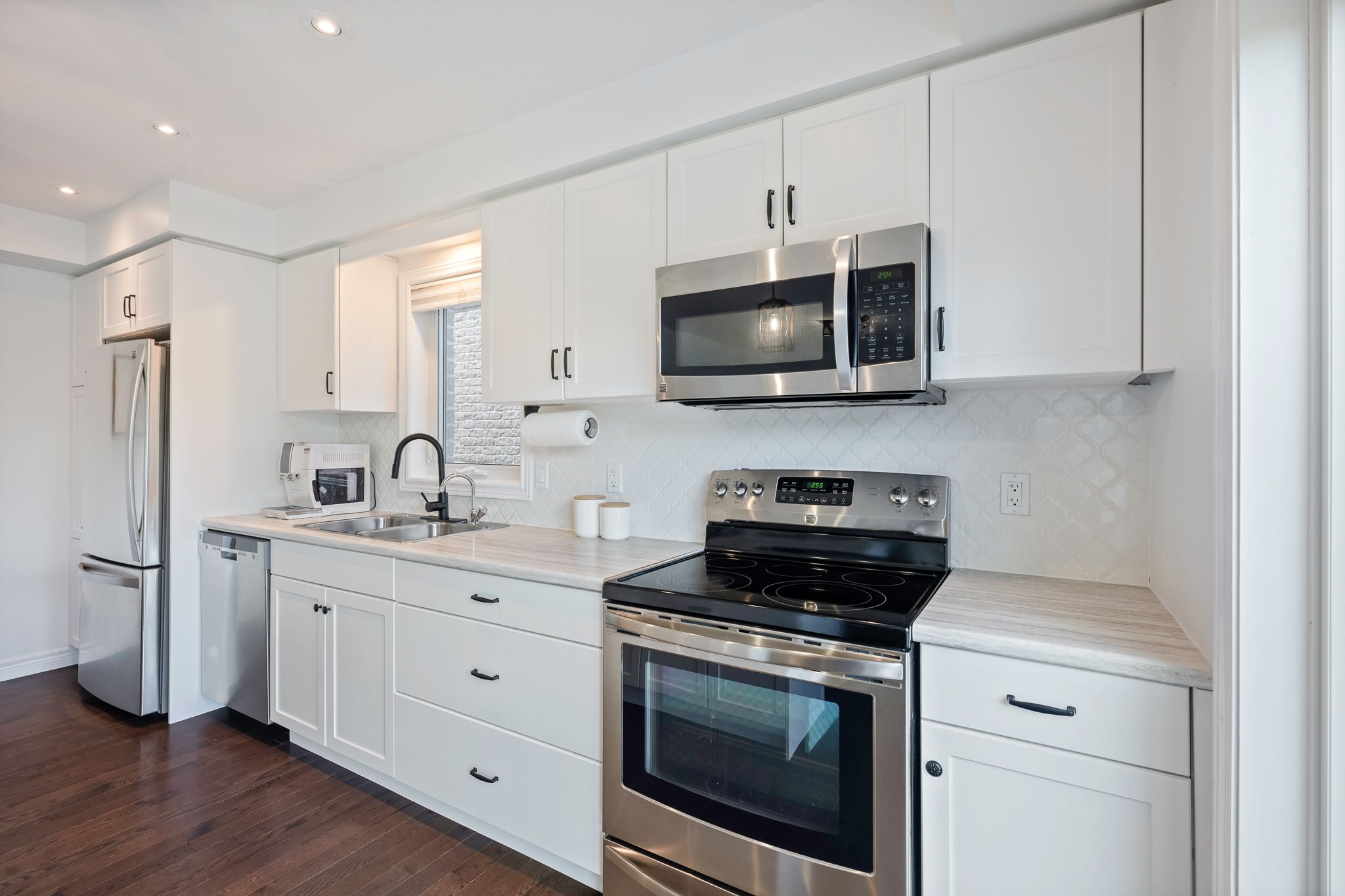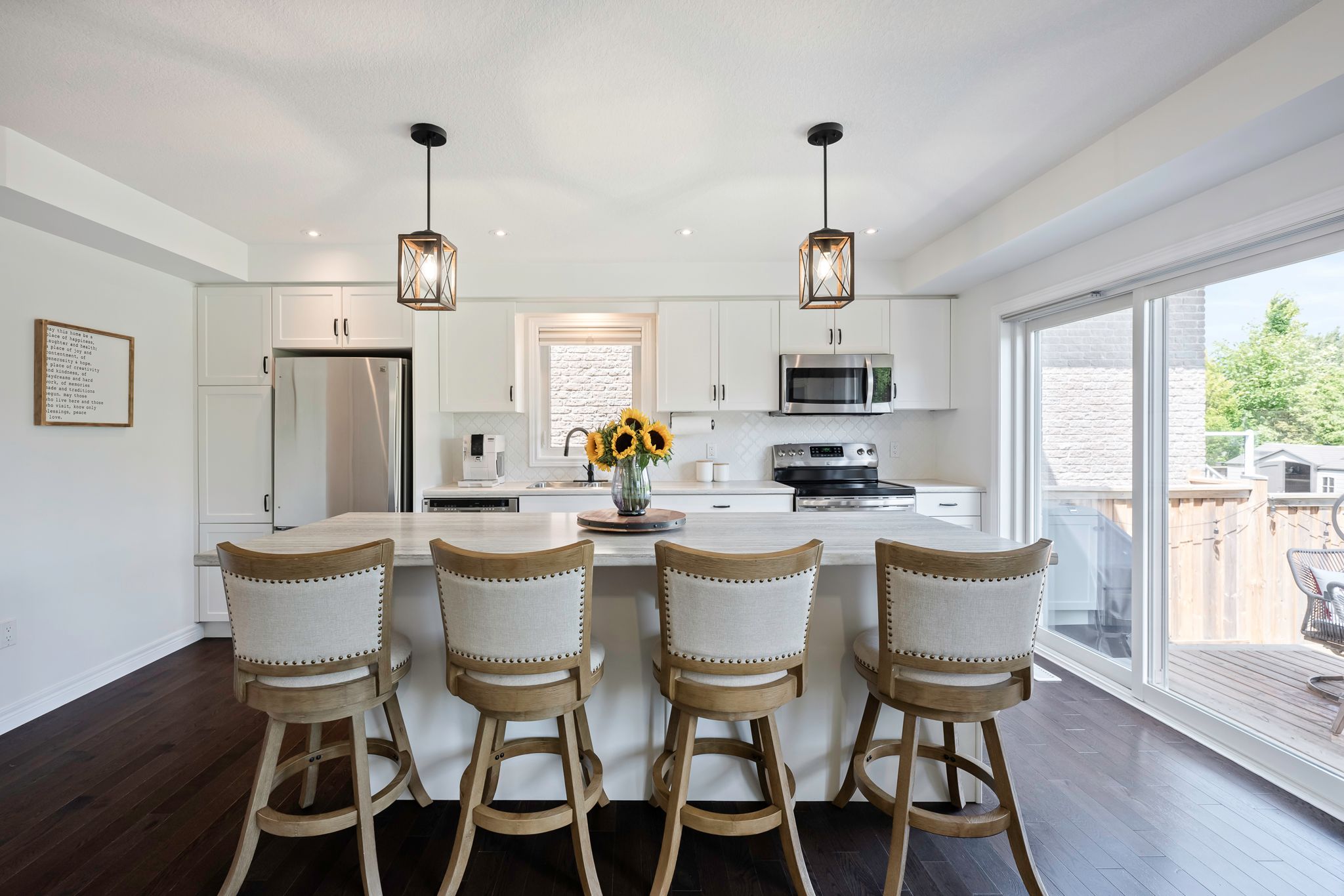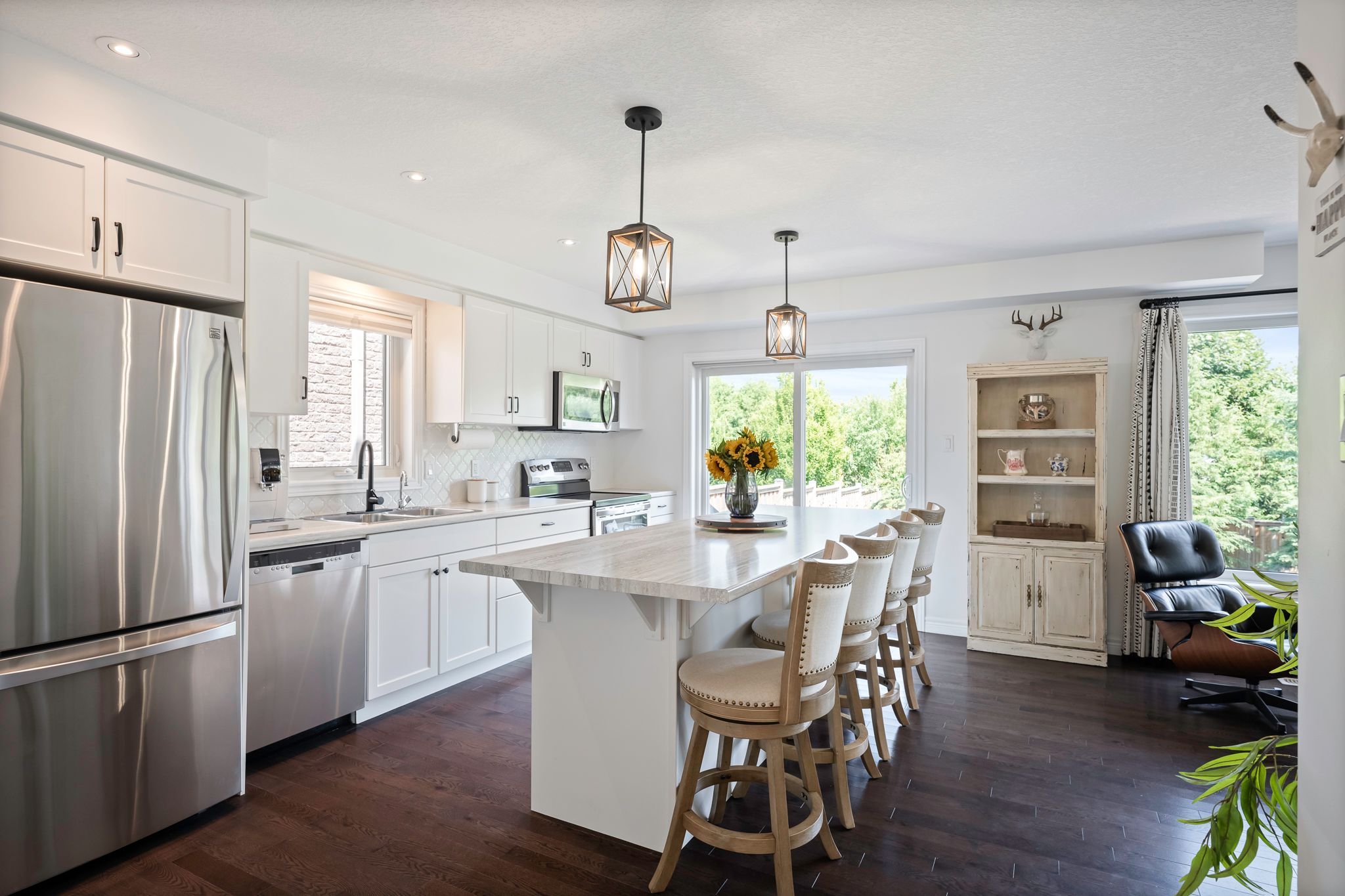 • Functional eat-in kitchen with stainless steel appliances and large island.