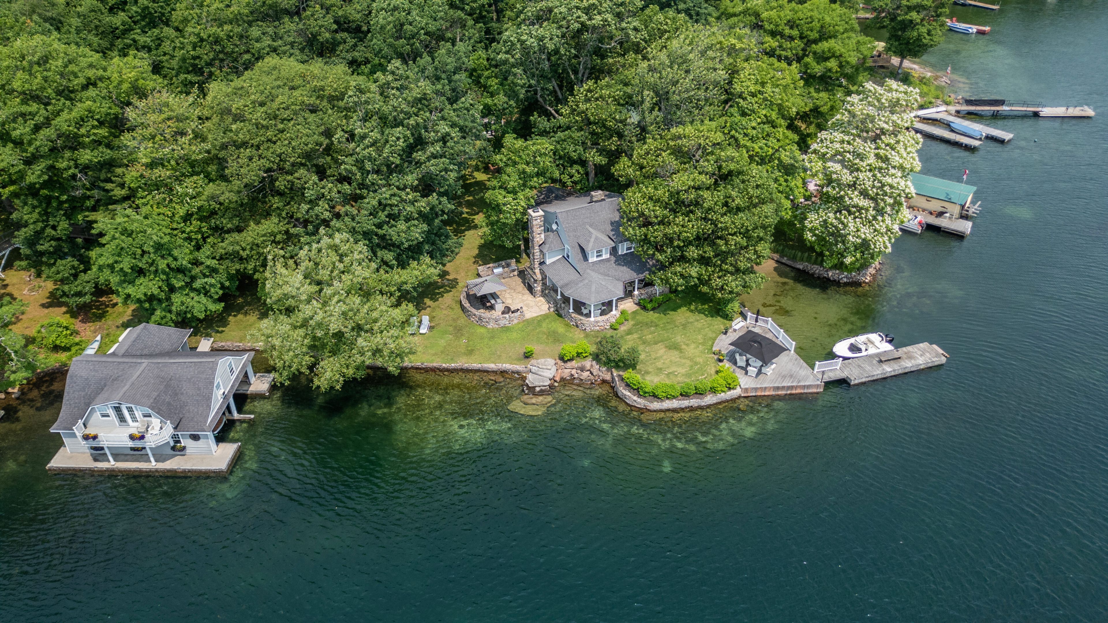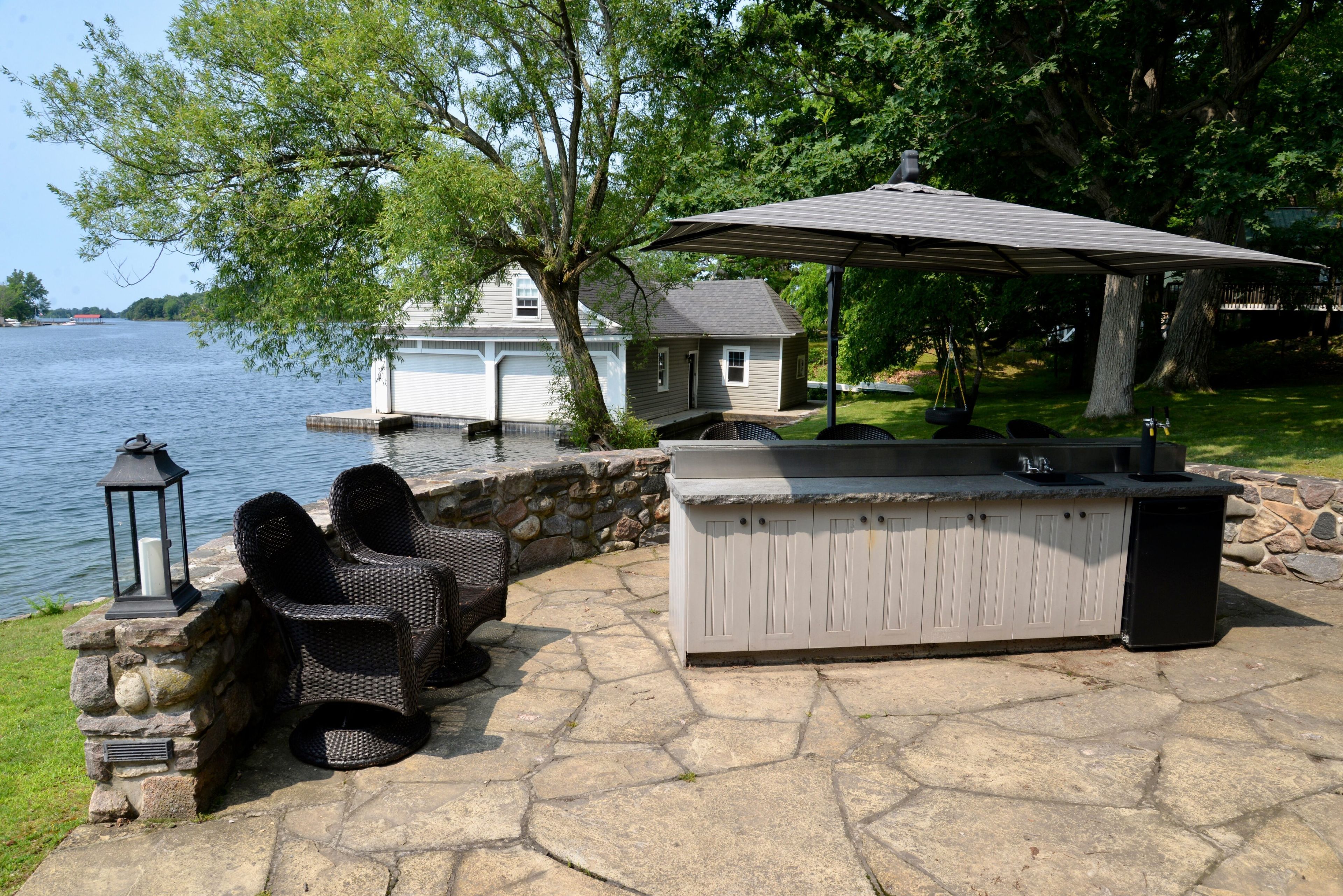 Experience the perfect blend of historic charm and relaxed waterfront living at this beautifully maintained 1903 summer home on picturesque tremont park island, just minutes from gananoque marina. Set on over 200 feet of pristine shoreline, this classic summer home offers multiple spaces to unwind and entertain. Begin your day lounging on the waterside deck, then move to the beautiful covered porch with views of children playing on your private beach. Whether you're soaking up the sun or enjoying the shade, this property offers a peaceful escape in every direction. Inside, the home exudes character starting with a grand stone fireplace anchoring the living room paired with exposed beams and immaculate pine floors that flow through the formal dining room and den. The recently renovated kitchen is a gathering place featuring granite counters, new appliances, spacious island with built-in stove, double drawer refrigerators, coffee bar, mini pantry, plus easy access to east facing deck. The main floor includes convenient laundry and 2 piece bath while upstairs you'll find 4 spacious bedrooms and 3 piece bath. Step outside to your expansive stone patio and outdoor kitchen equipped with built-in bbq and wet bar w/chiller tray for keeping drinks cool in summer months. A towering custom-built stone fireplace extends the patio season and creates a perfect setting for unforgettable evenings. Guests feel right at home with additional accommodations w/3 piece bath above the double-slip boathouse, recently reinforced with steel and concrete decks. A charming bunkie and storage shed provide additional versatility. This generational- style retreat is a rare find in one of canada's most sought-after destinations. Featuring extensive docking and timeless character, this is a unique opportunity to own a true piece of paradise in the heart of the thousand islands. There are no restrictions preventing non-canadians from buying this property.