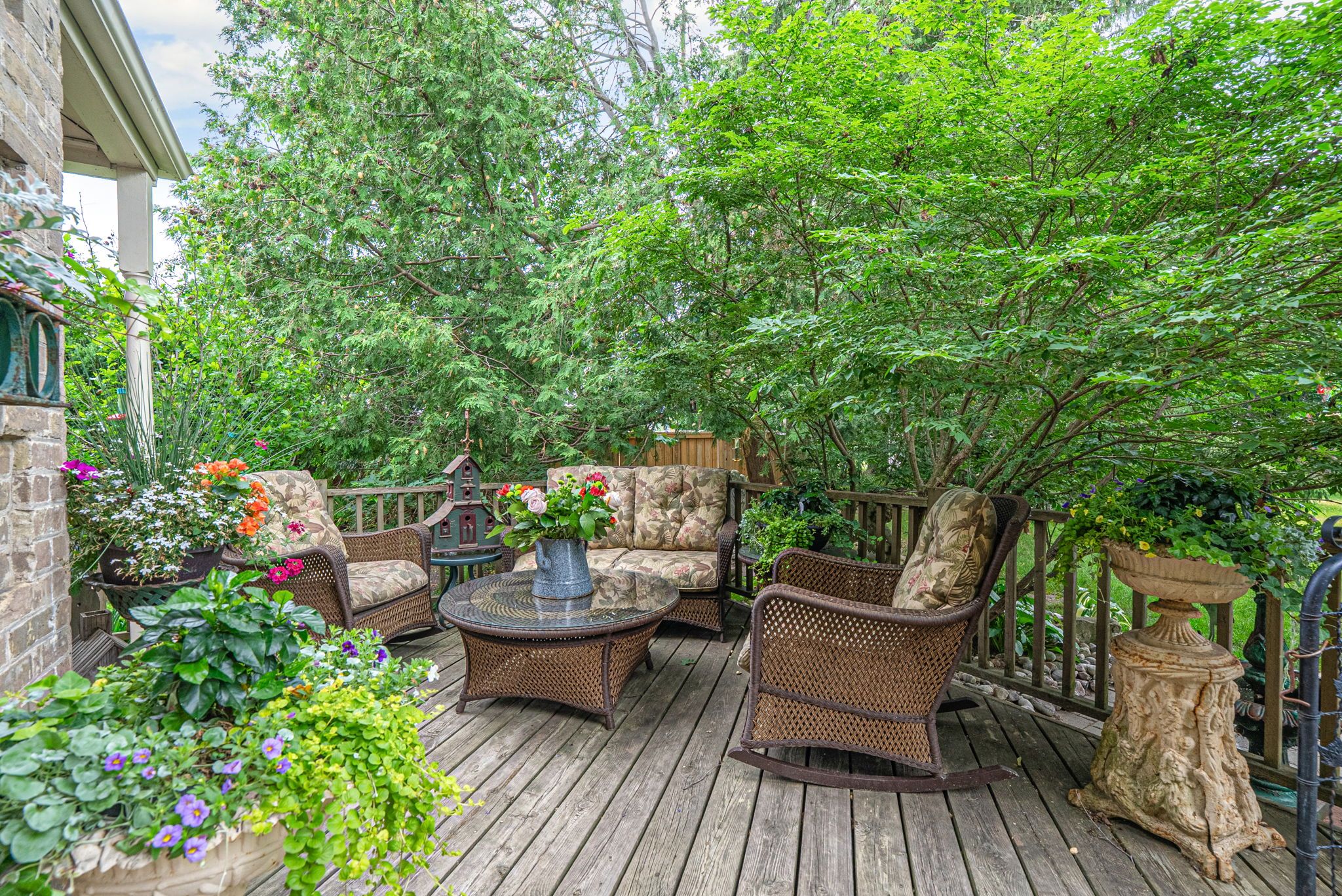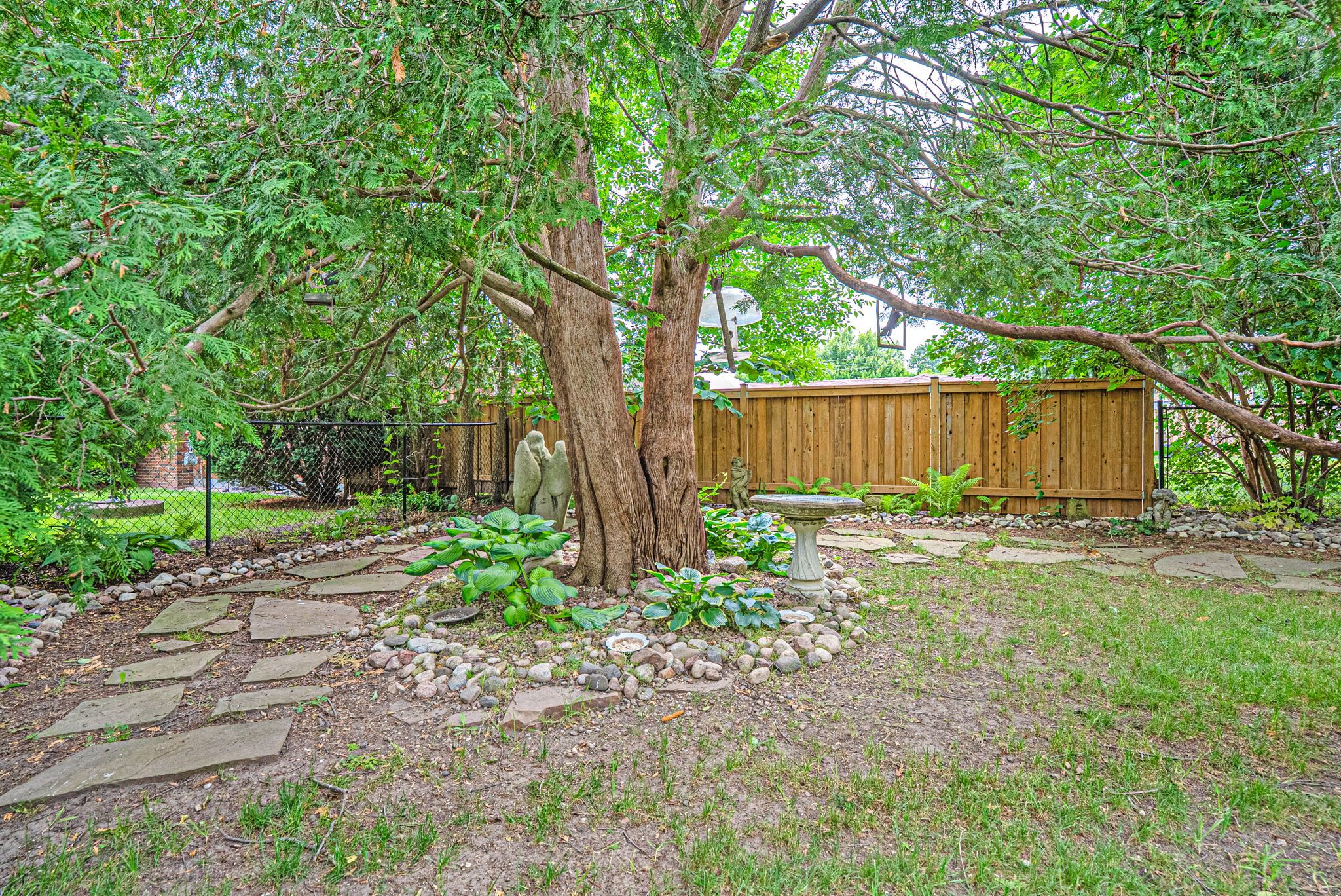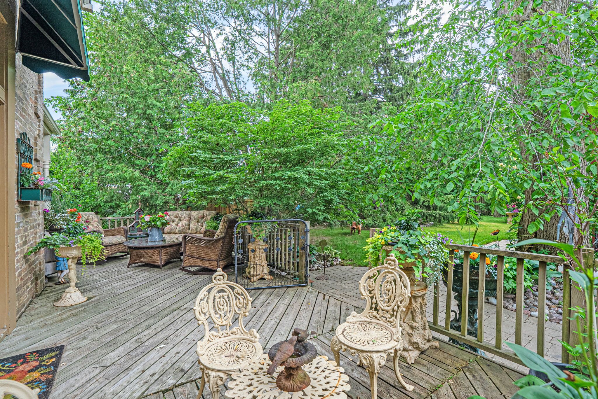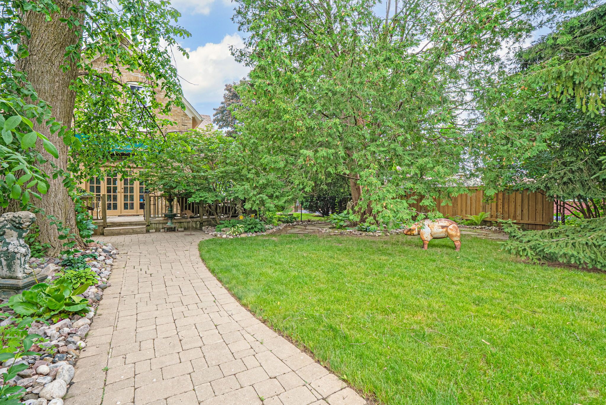 • Private backyard with mature trees and a large deck for relaxation.
