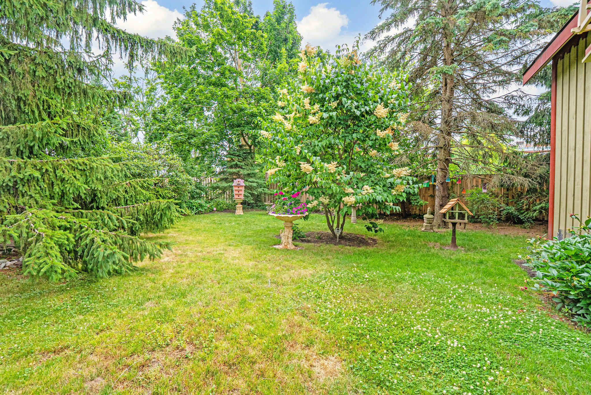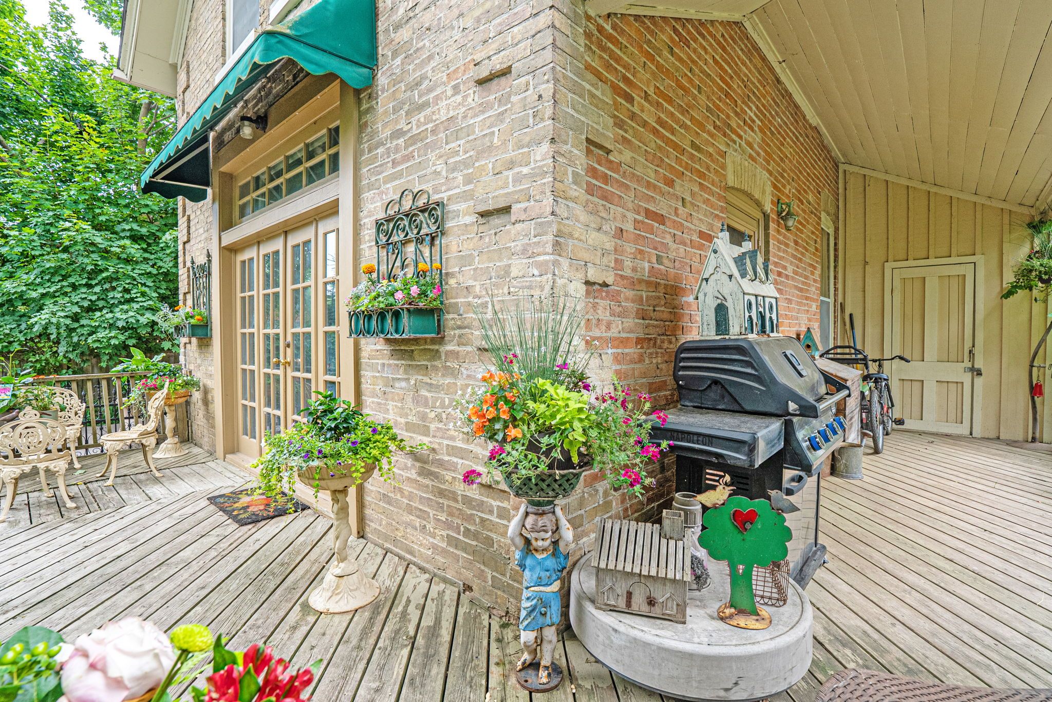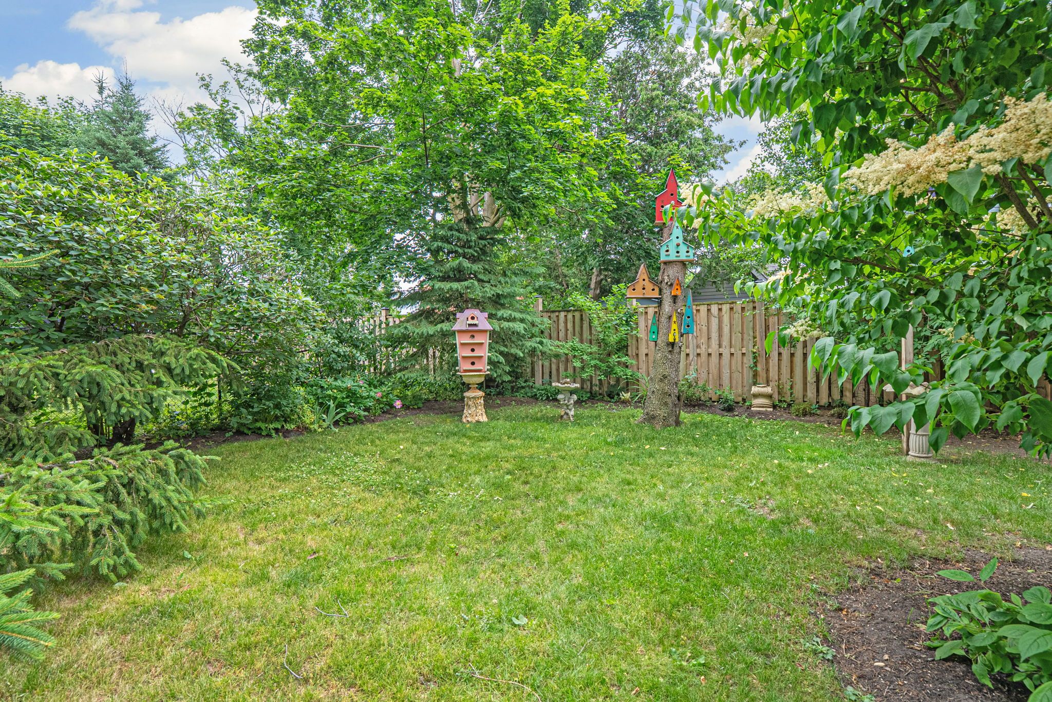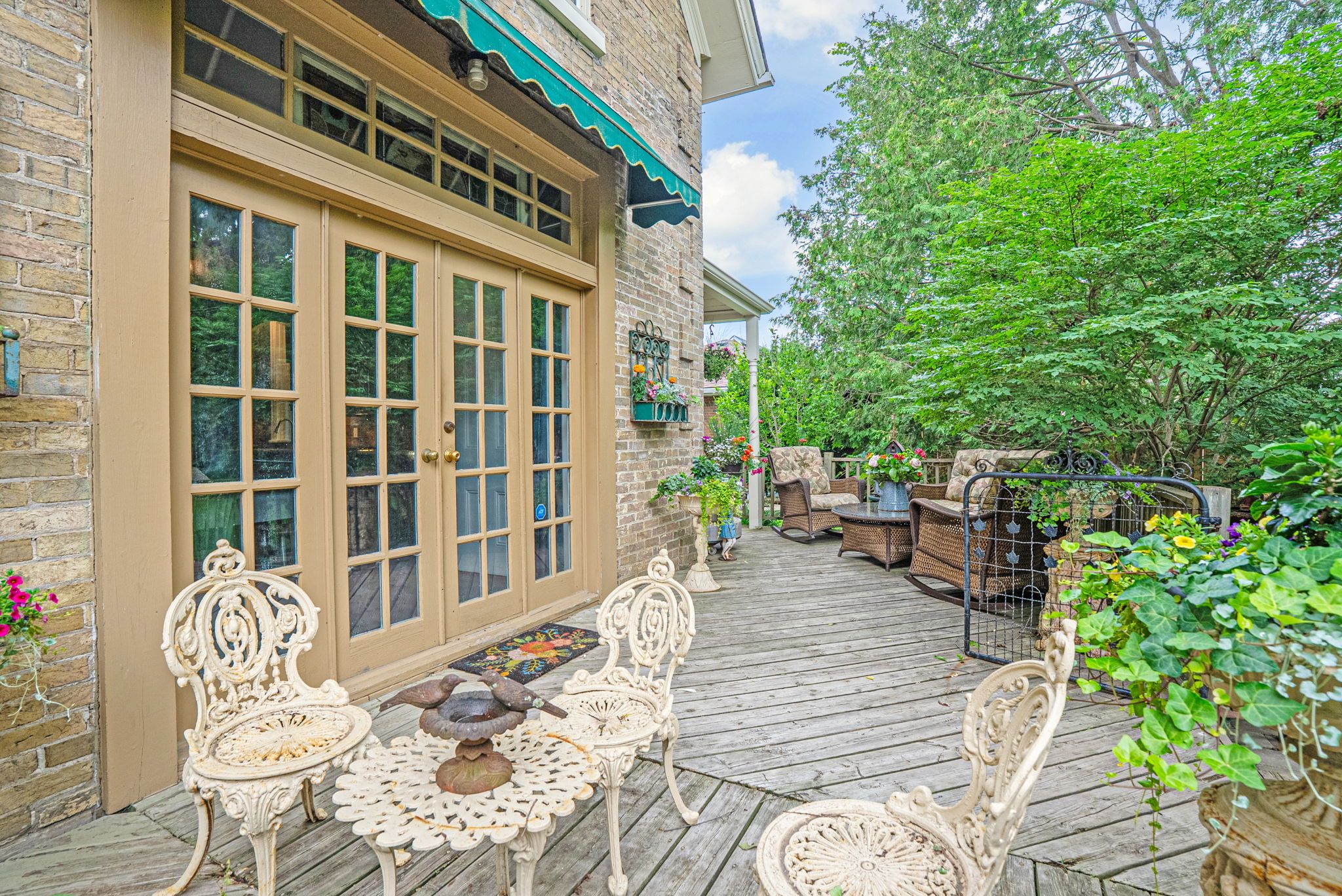• Private backyard with mature trees and a large deck for relaxation.