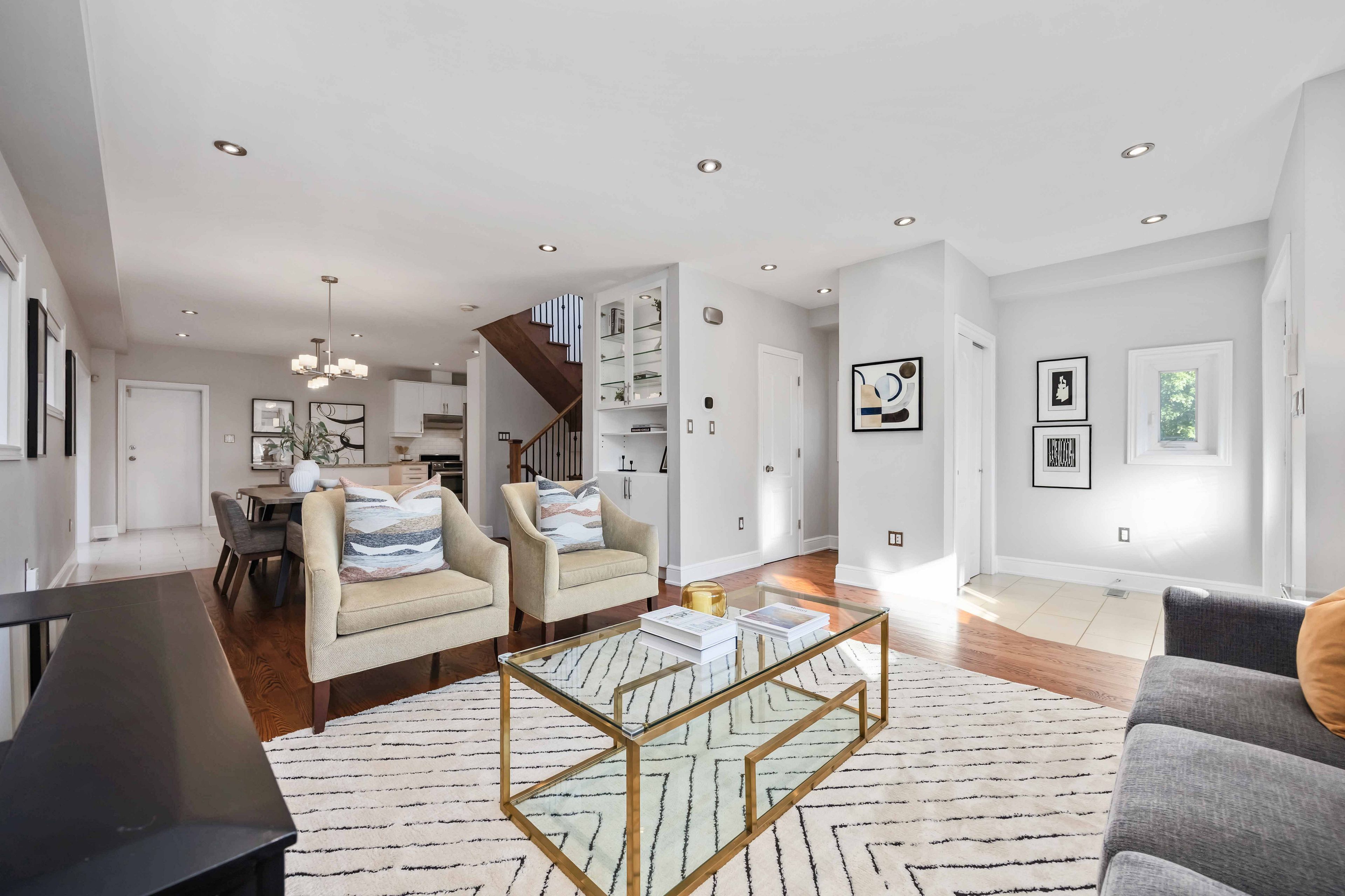 • Spacious open-concept living and dining area with natural light and hardwood floors.