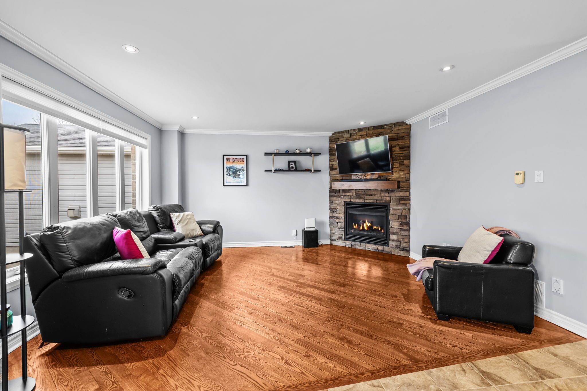 • Cozy living room features a stunning stone wall and gas fireplace.