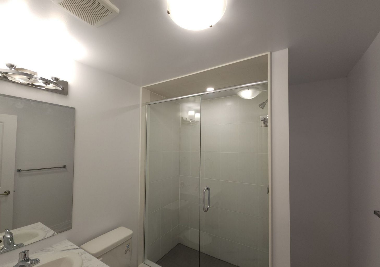 • Modern bathroom features a stylish glass shower.