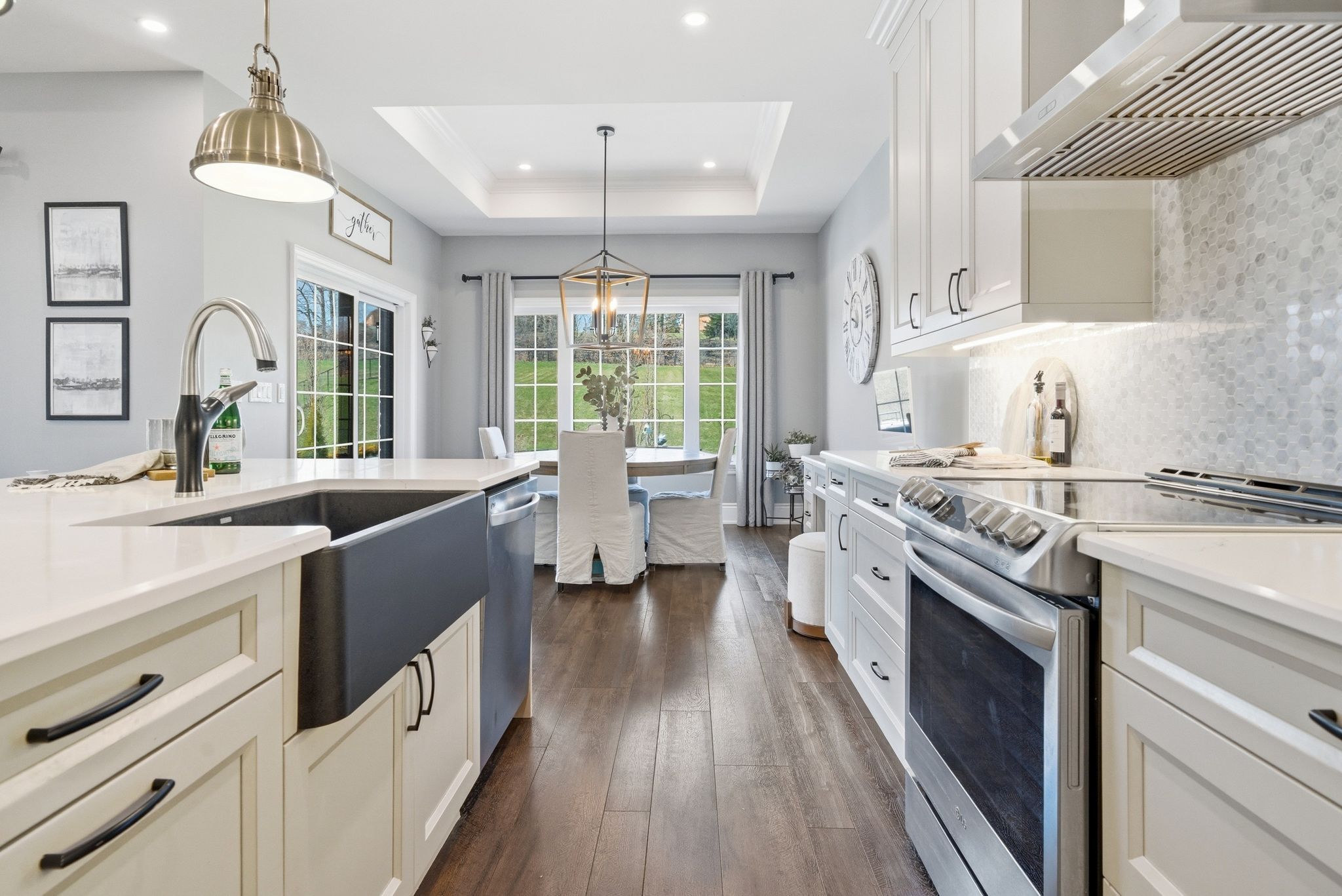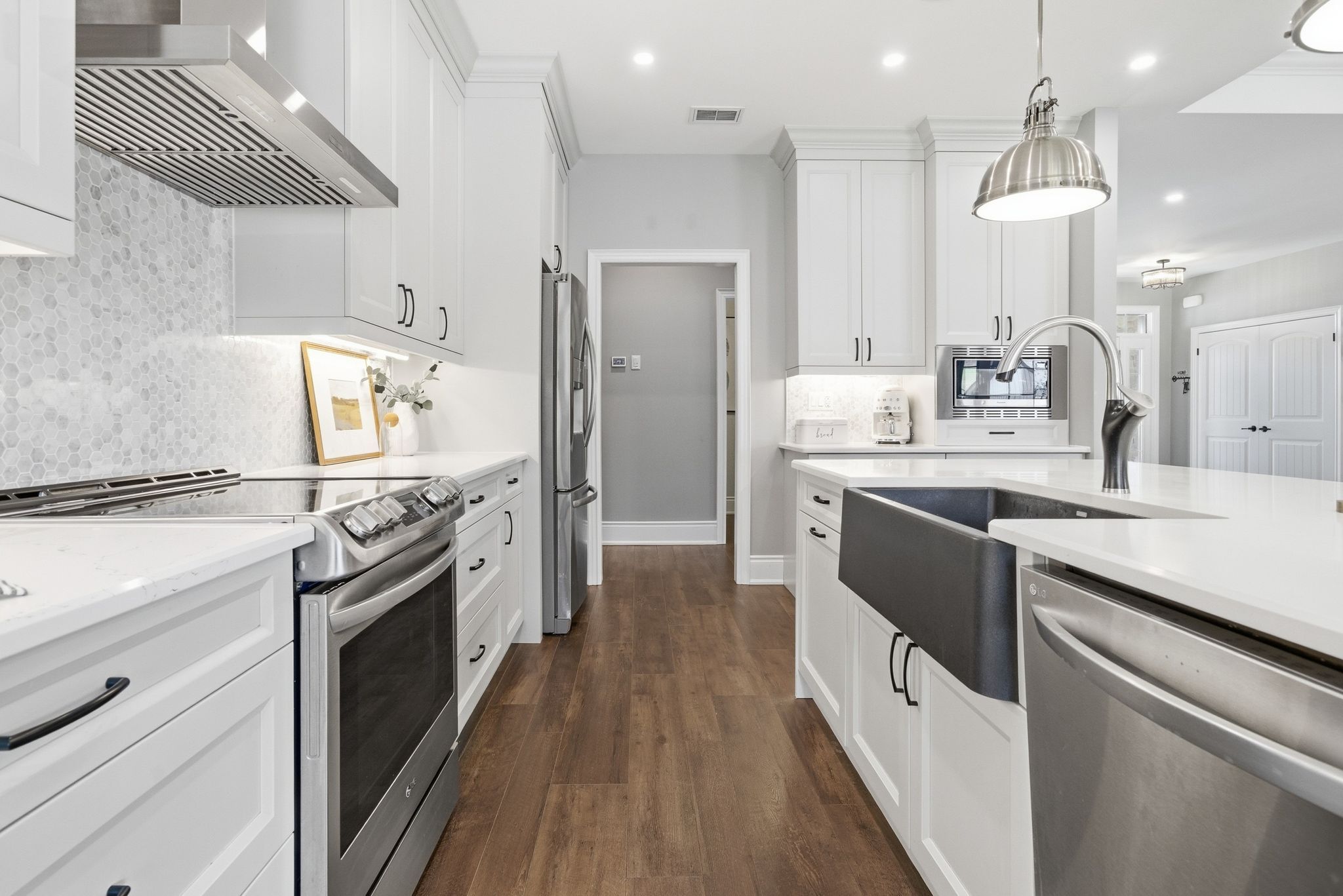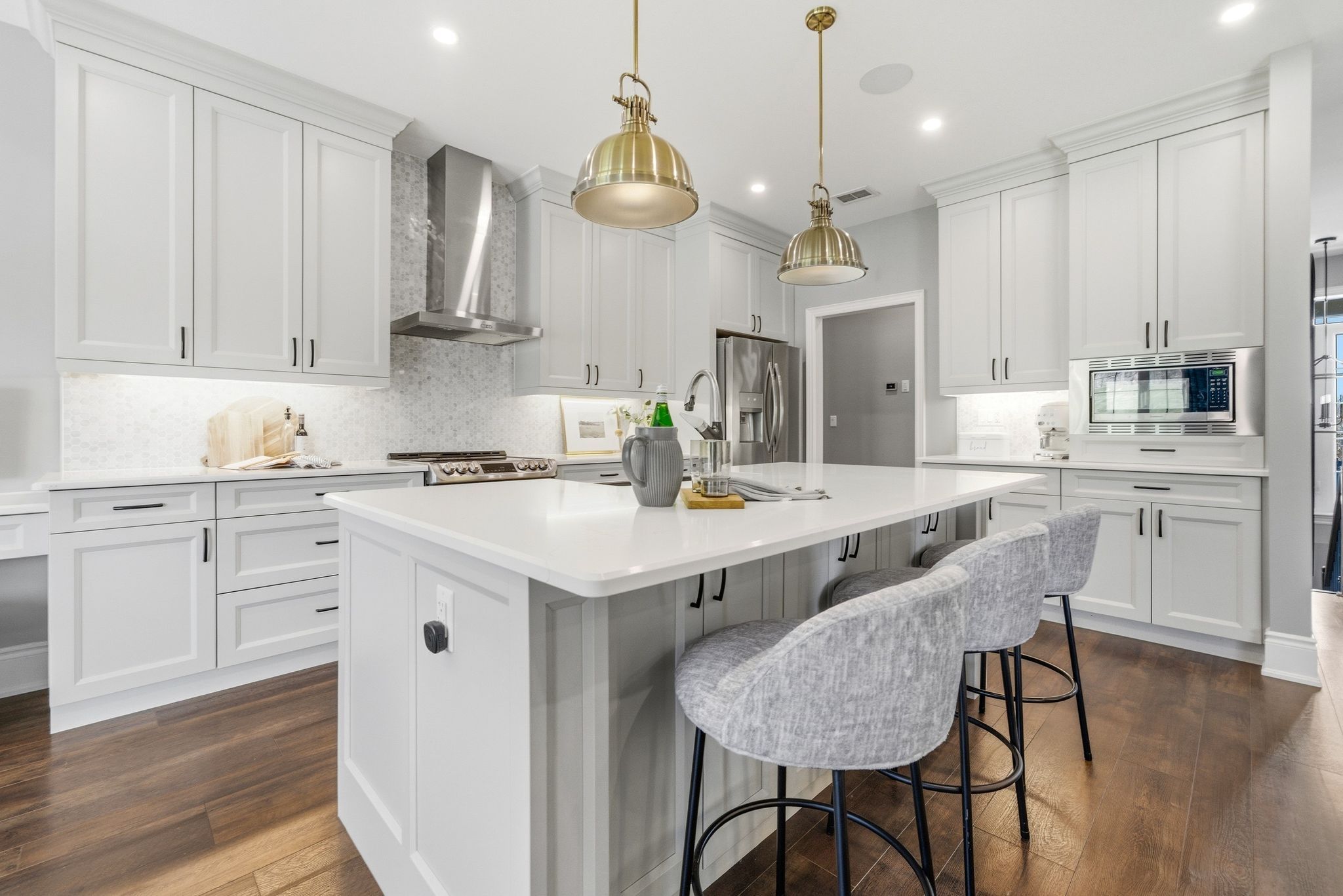 • Custom kitchen with quartz counters and top stainless steel appliances.