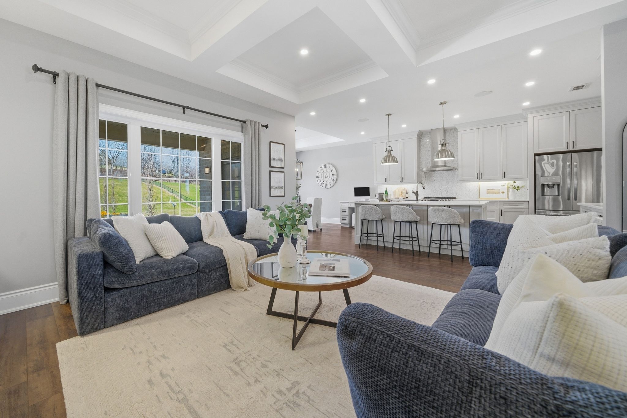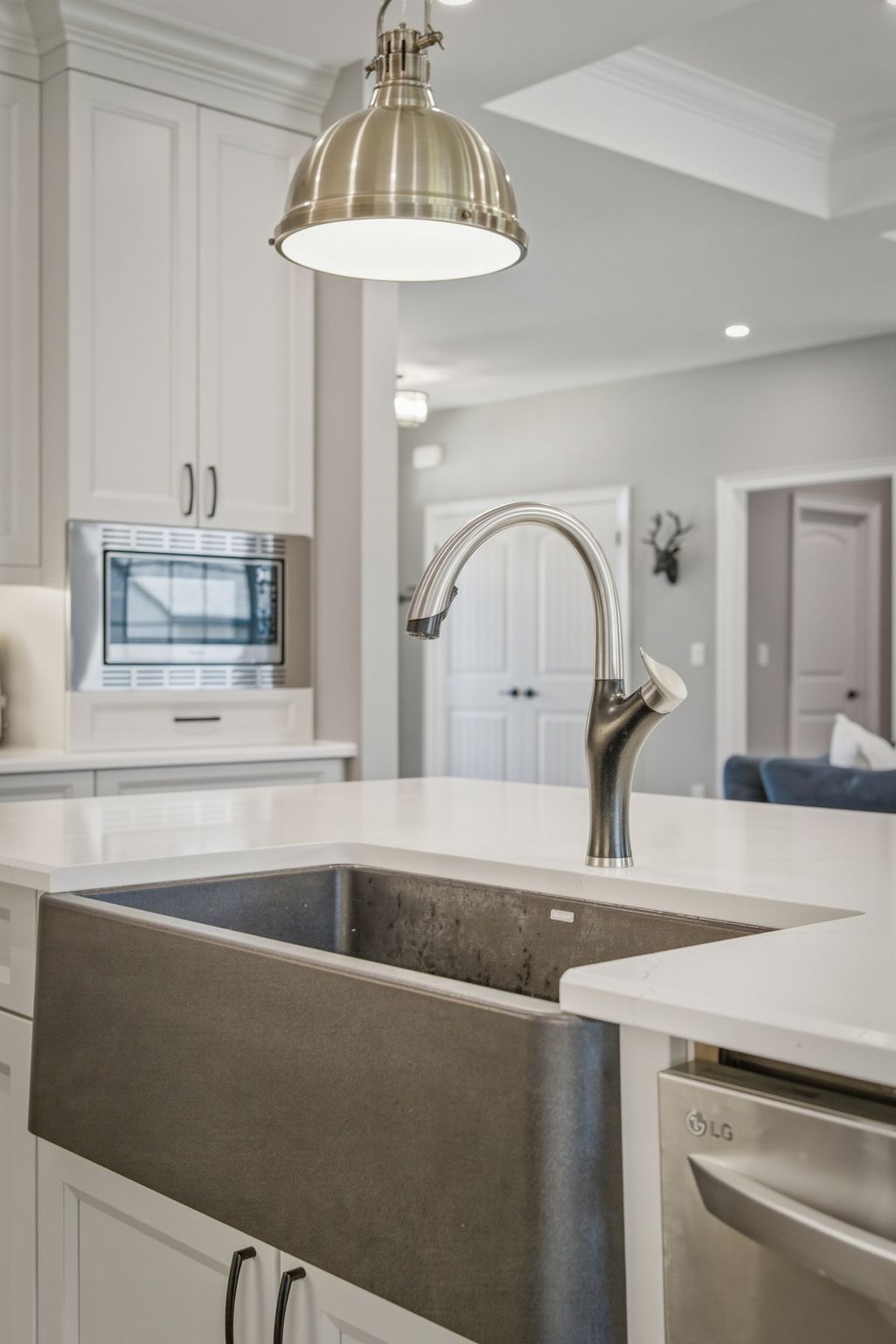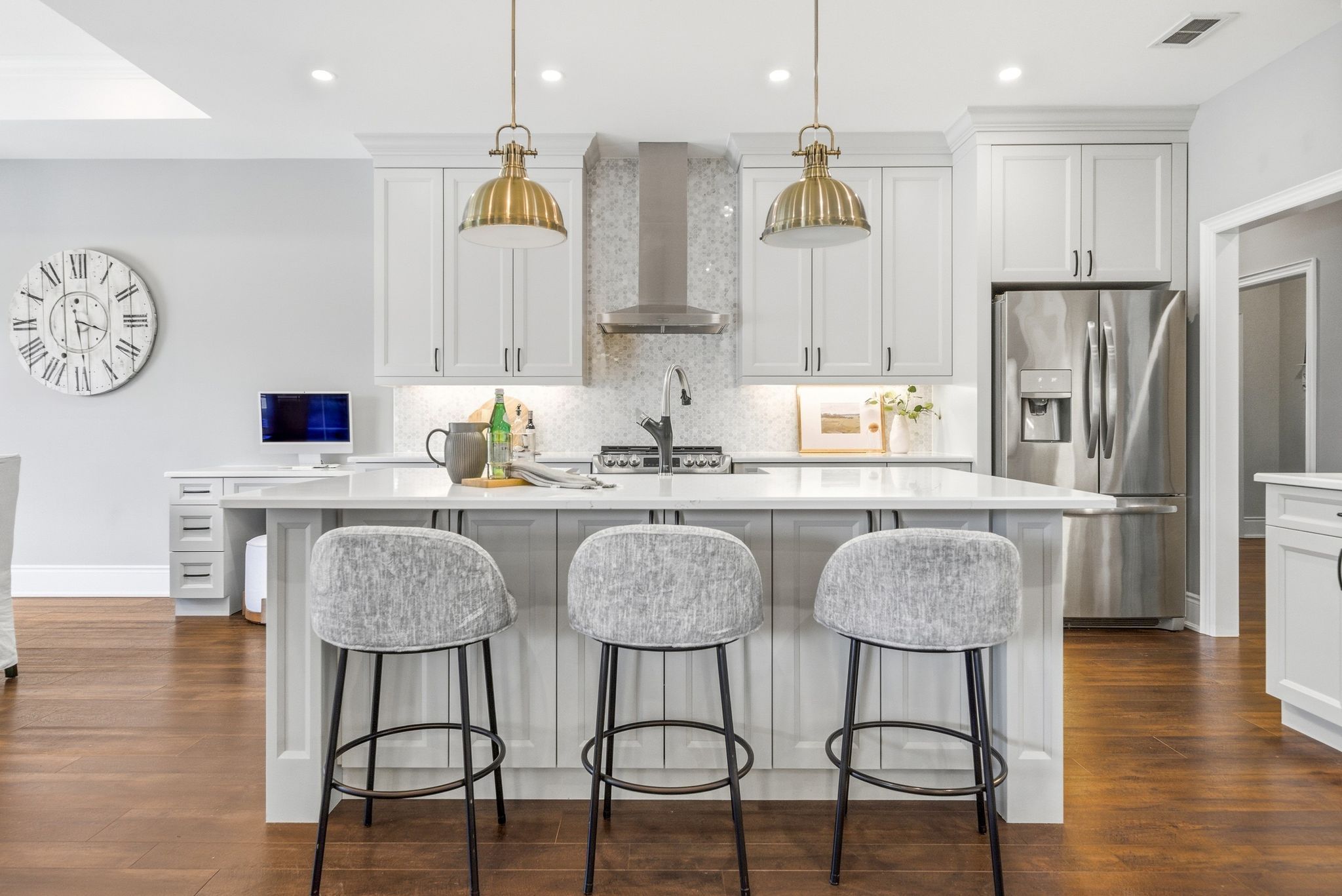 • Custom kitchen with quartz counters and top stainless steel appliances.