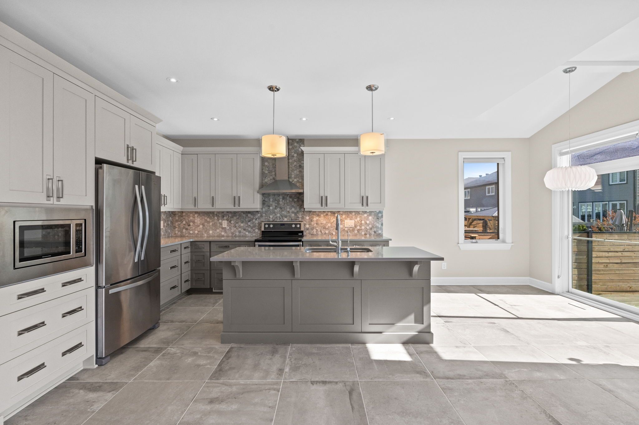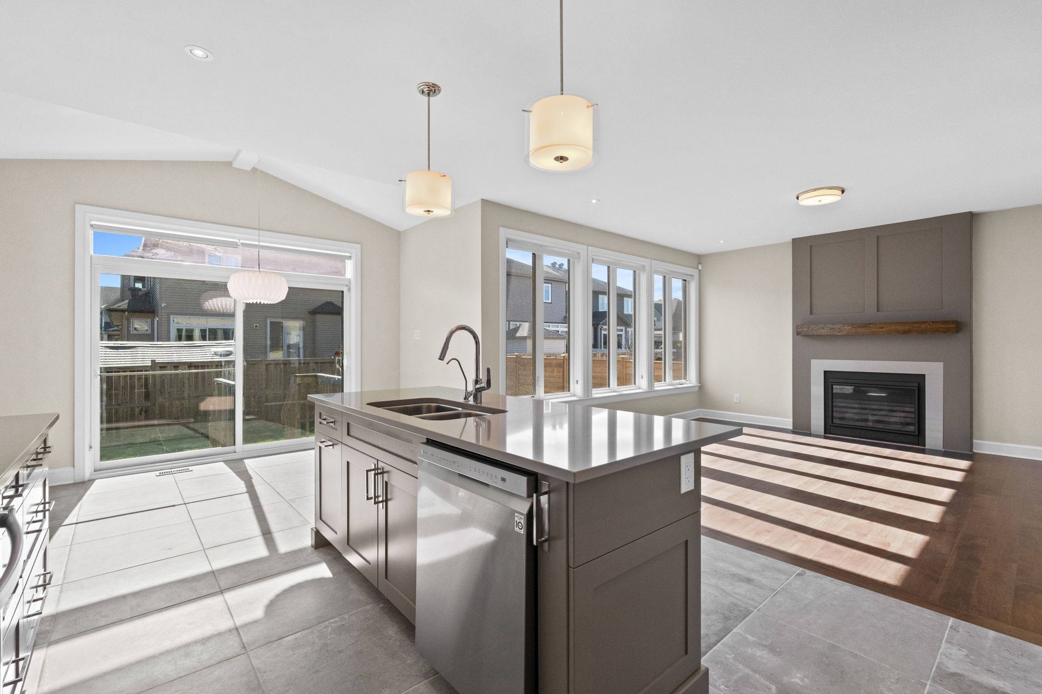 • Bright kitchen with vaulted ceilings and backyard views.