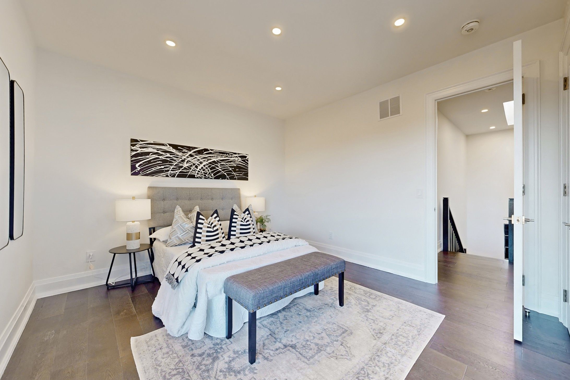 • Spacious main level with soaring ceilings and a striking floating staircase.