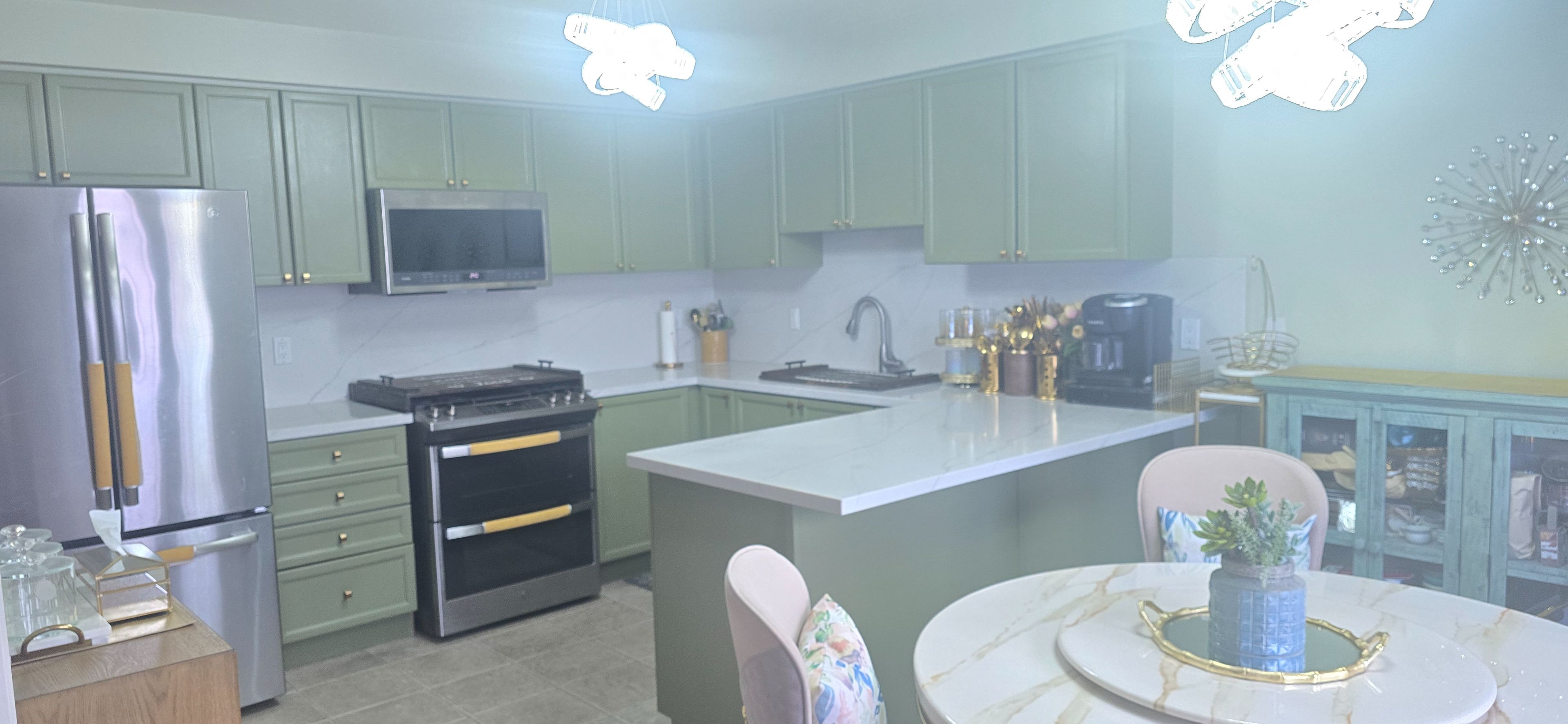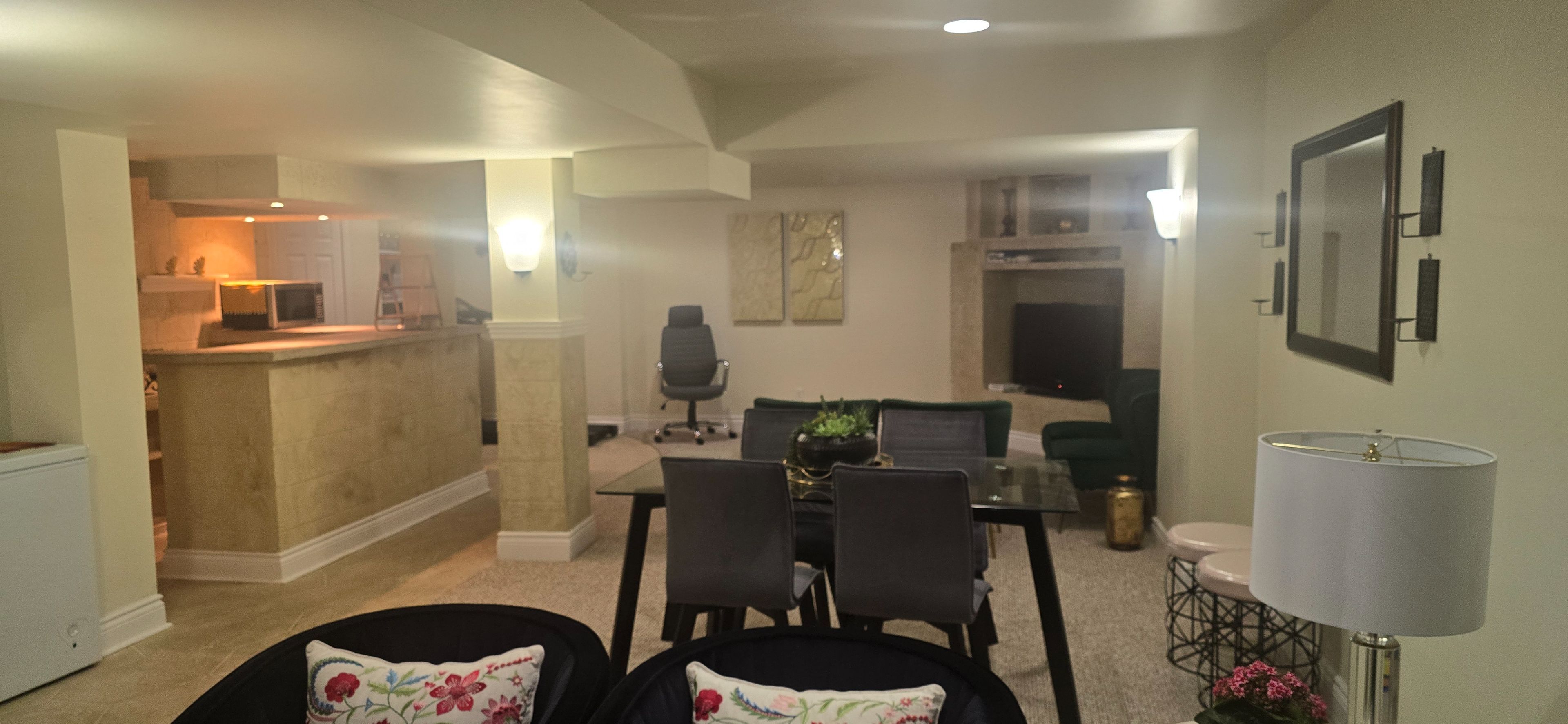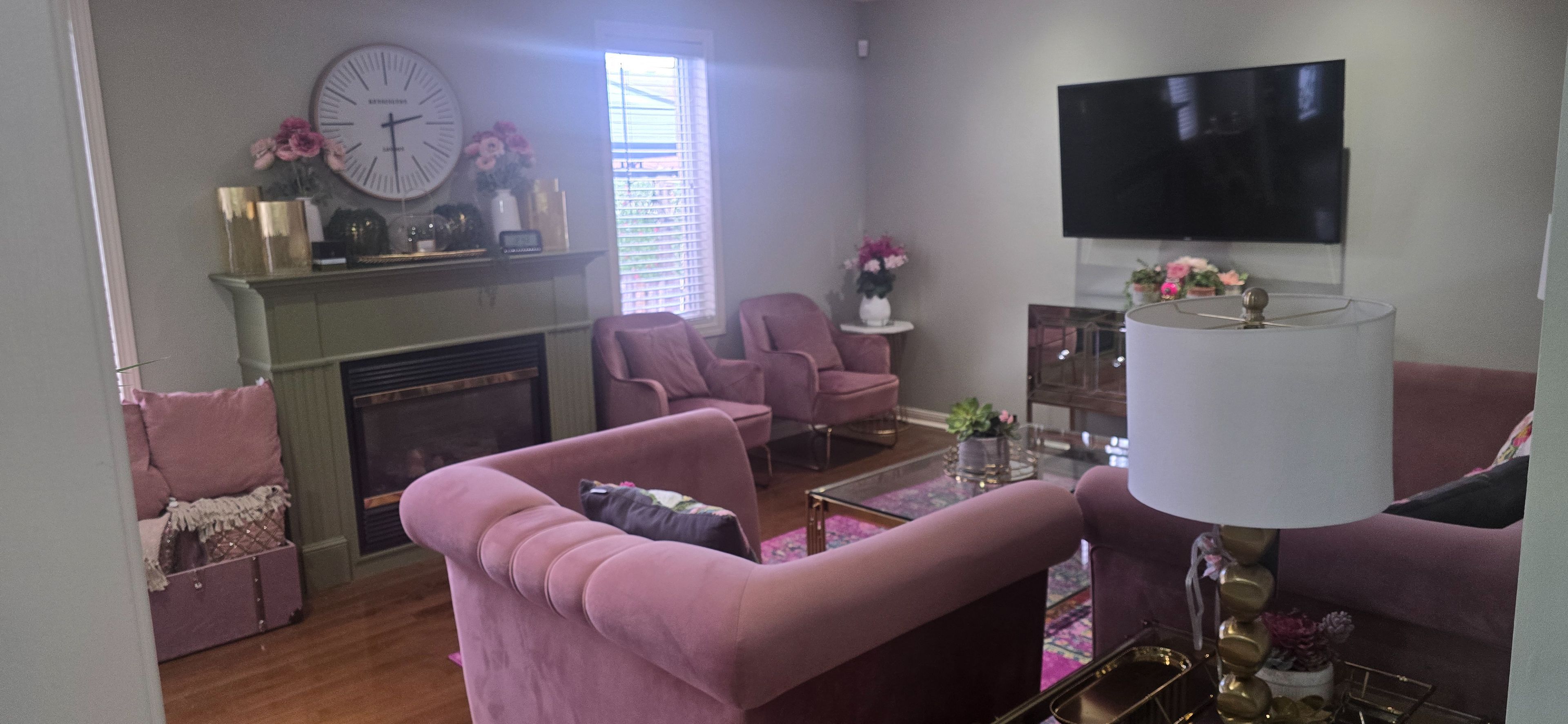 • Spacious family room featuring a fireplace and modern kitchen.