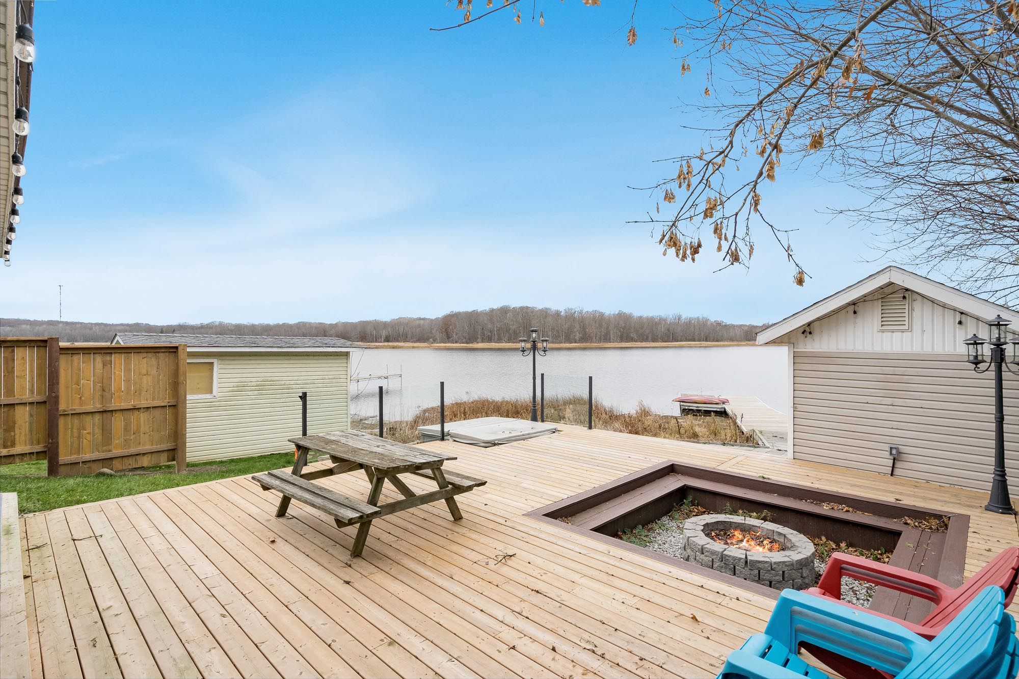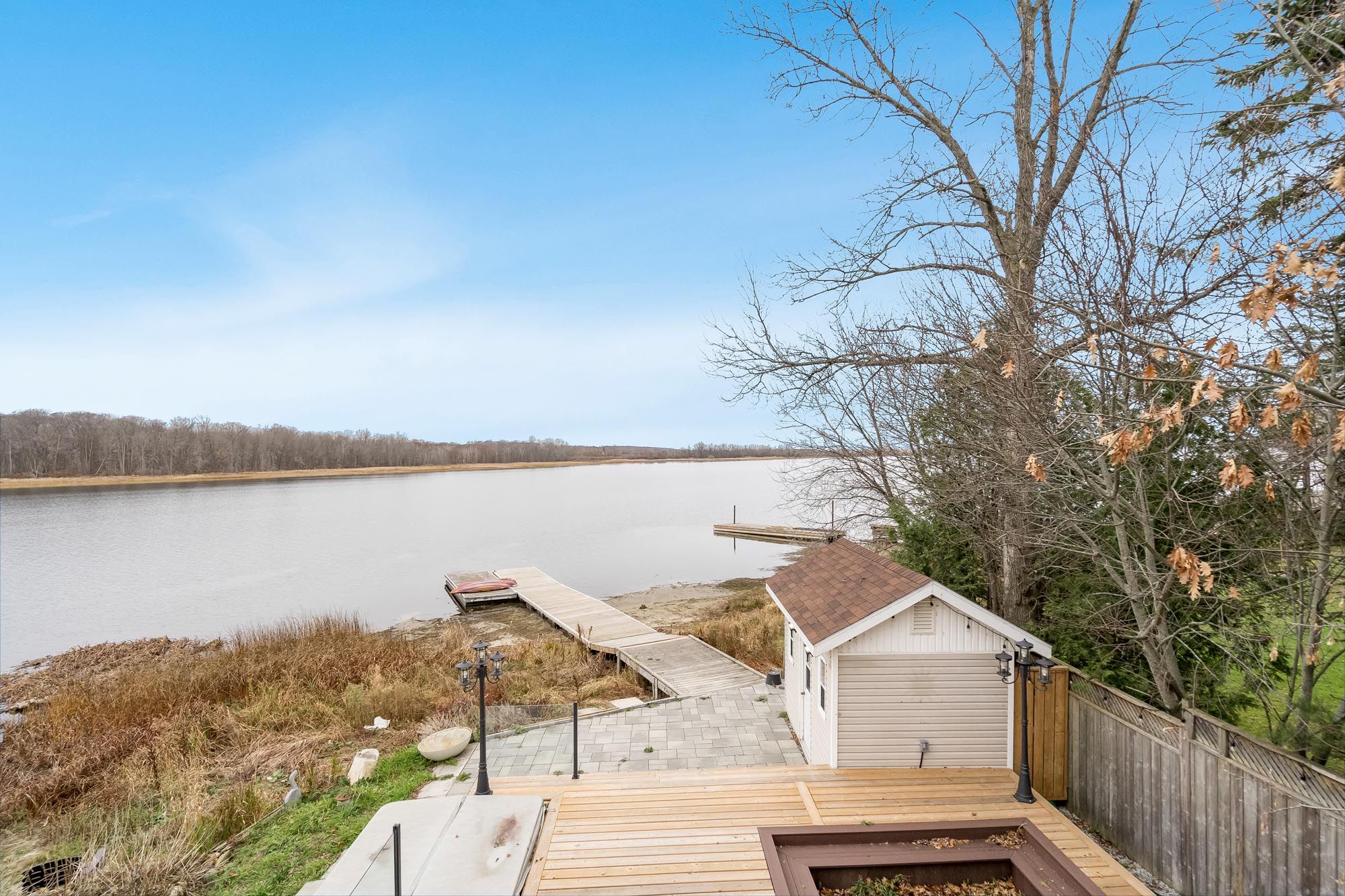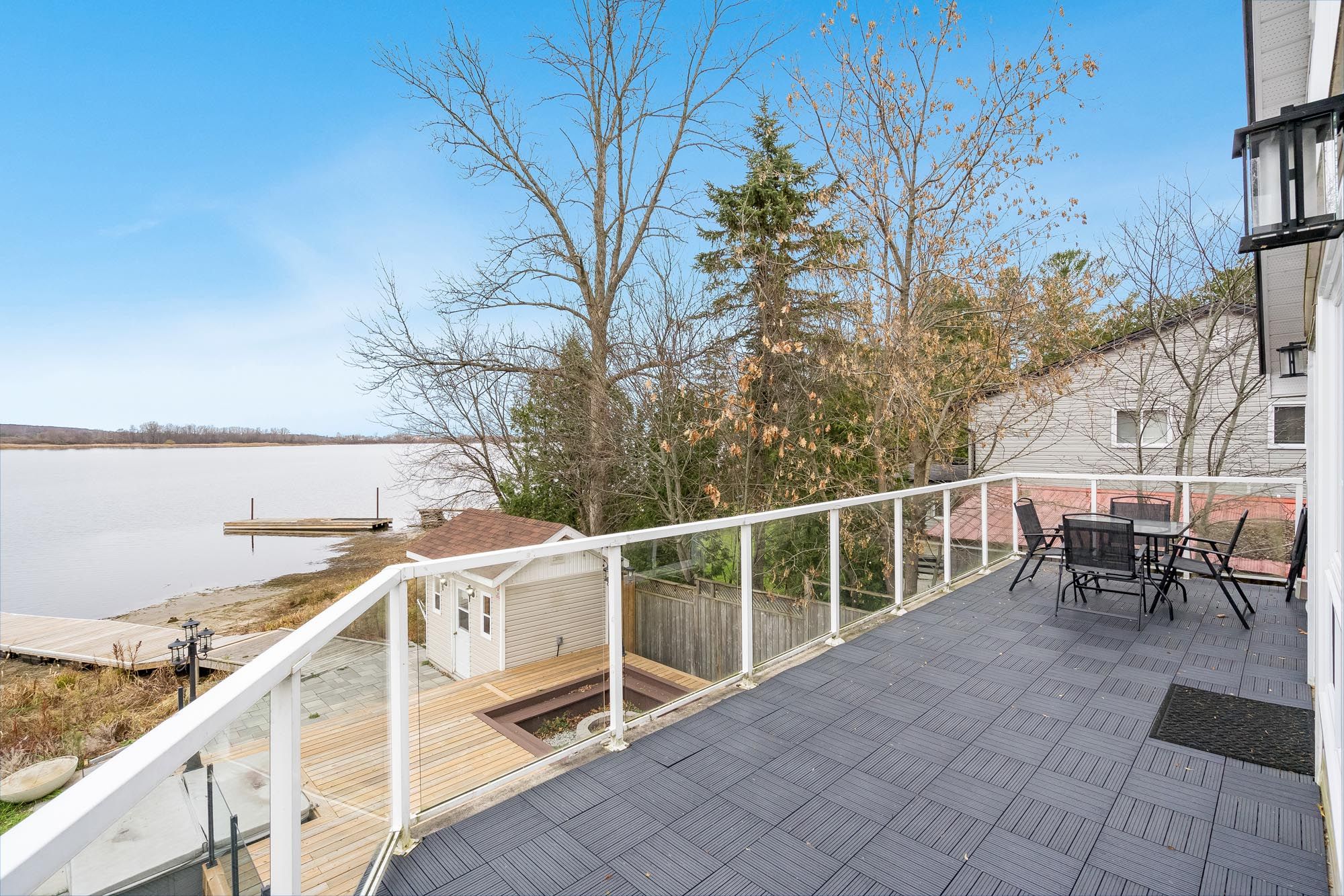 Top 5 reasons you will love this home: 1) stunning panoramic views of peaceful hogg bay await a fishing enthusiast and those seeking direct access to georgian bay in this beautifully updated, move-in-ready four-season home 2) wood vaulted ceilings and an open-concept main level blend rustic charm with modern updates, creating a welcoming and stylish retreat 3) each bedroom offers a private, updated ensuite for a luxurious experience, ideal for families and hosting guests 4) outdoors, you'll discover a wraparound deck with sleek glass railings, a cozy firepit, a refreshing outdoor shower, a private guest bunkie, and a dock for seamless access to the water 5) conveniently located in victoria harbor, with nearby amenities just a short drive away and within easy reach of highway 12 access. 1,669 fin. Sq. Ft.