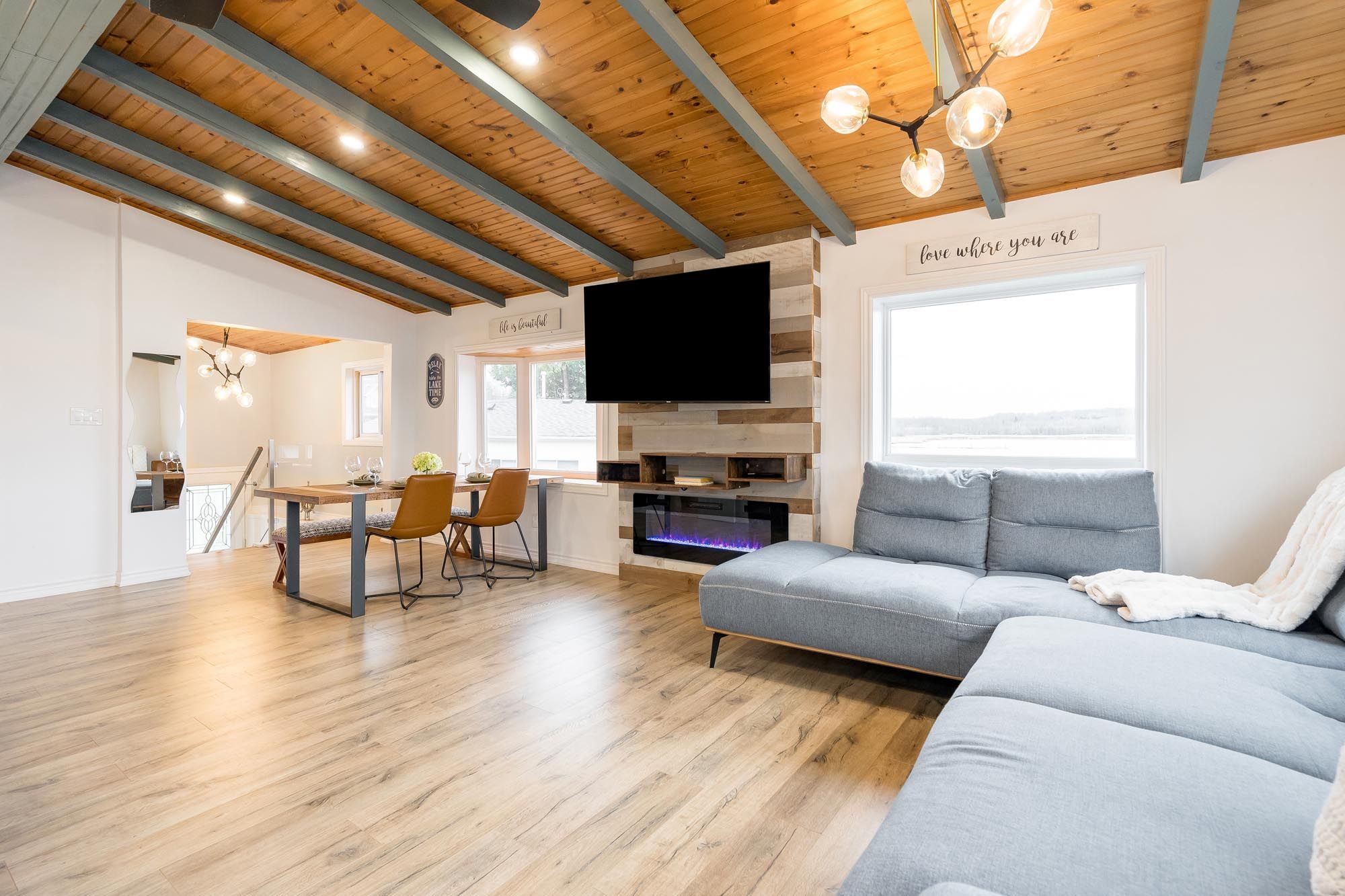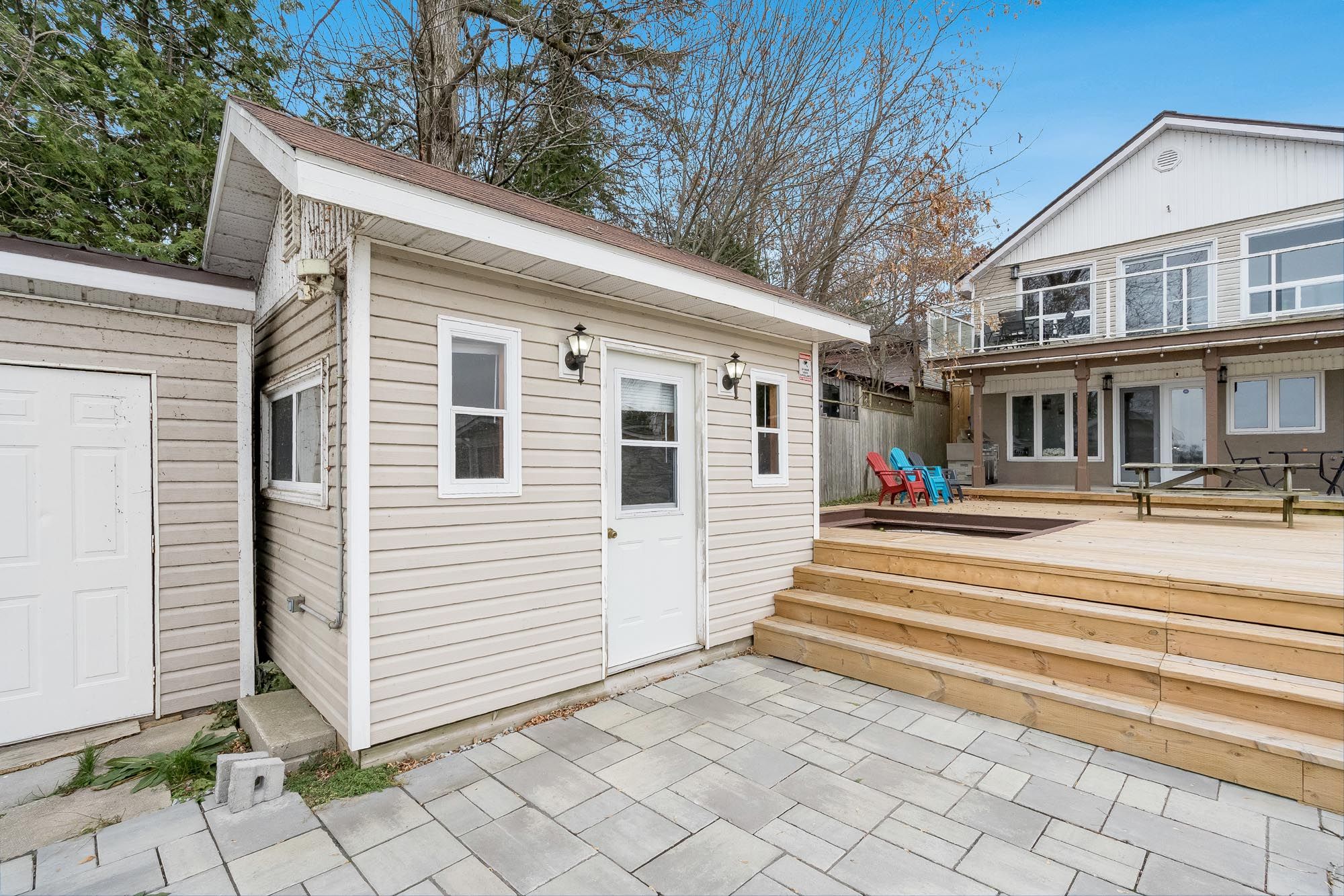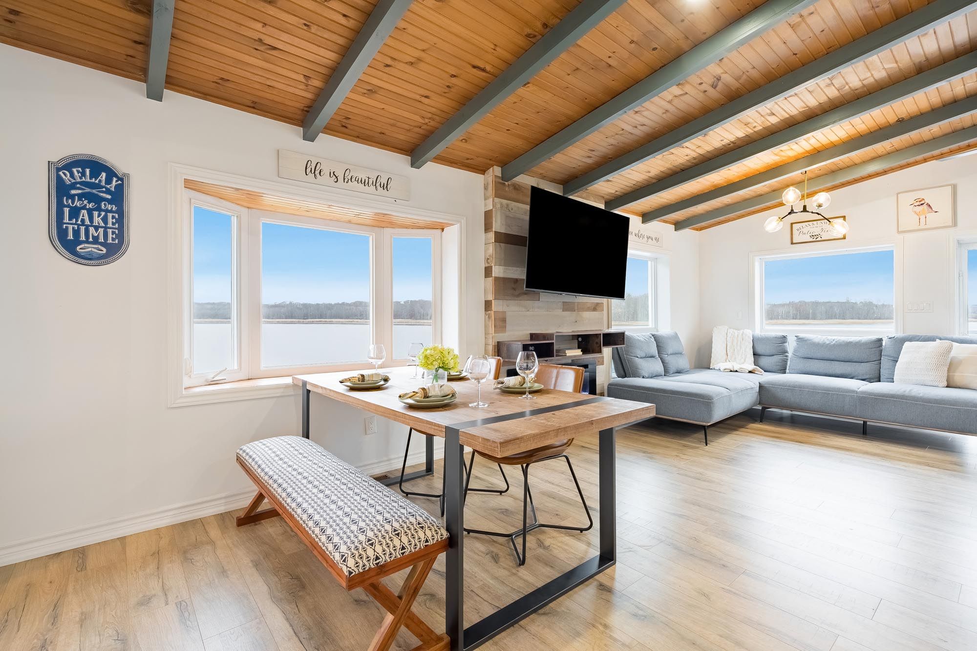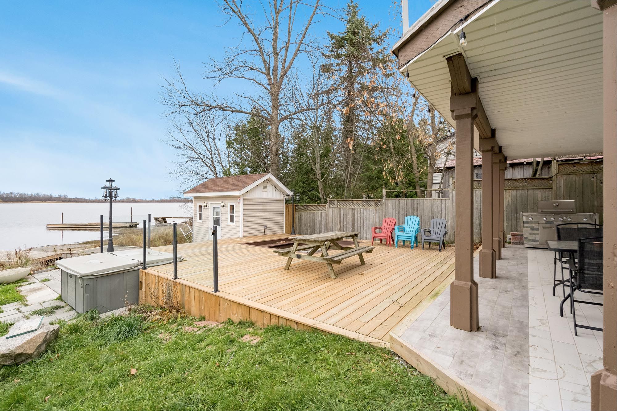 Top 5 reasons you will love this home: 1) stunning panoramic views of peaceful hogg bay await a fishing enthusiast and those seeking direct access to georgian bay in this beautifully updated, move-in-ready four-season home 2) wood vaulted ceilings and an open-concept main level blend rustic charm with modern updates, creating a welcoming and stylish retreat 3) each bedroom offers a private, updated ensuite for a luxurious experience, ideal for families and hosting guests 4) outdoors, you'll discover a wraparound deck with sleek glass railings, a cozy firepit, a refreshing outdoor shower, a private guest bunkie, and a dock for seamless access to the water 5) conveniently located in victoria harbor, with nearby amenities just a short drive away and within easy reach of highway 12 access. 1,669 fin. Sq. Ft.