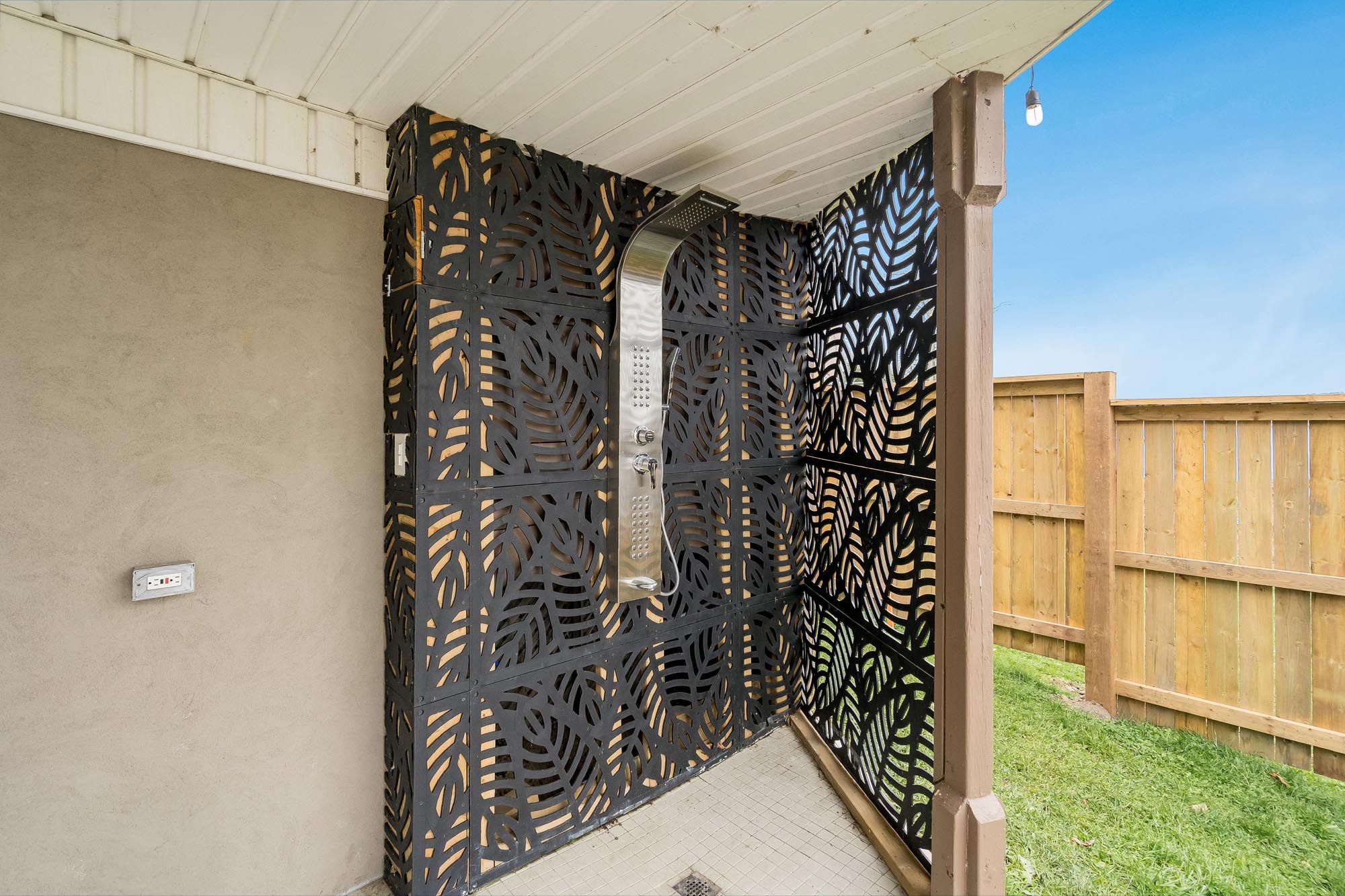 • Wraparound deck with glass railings, firepit, and outdoor shower.