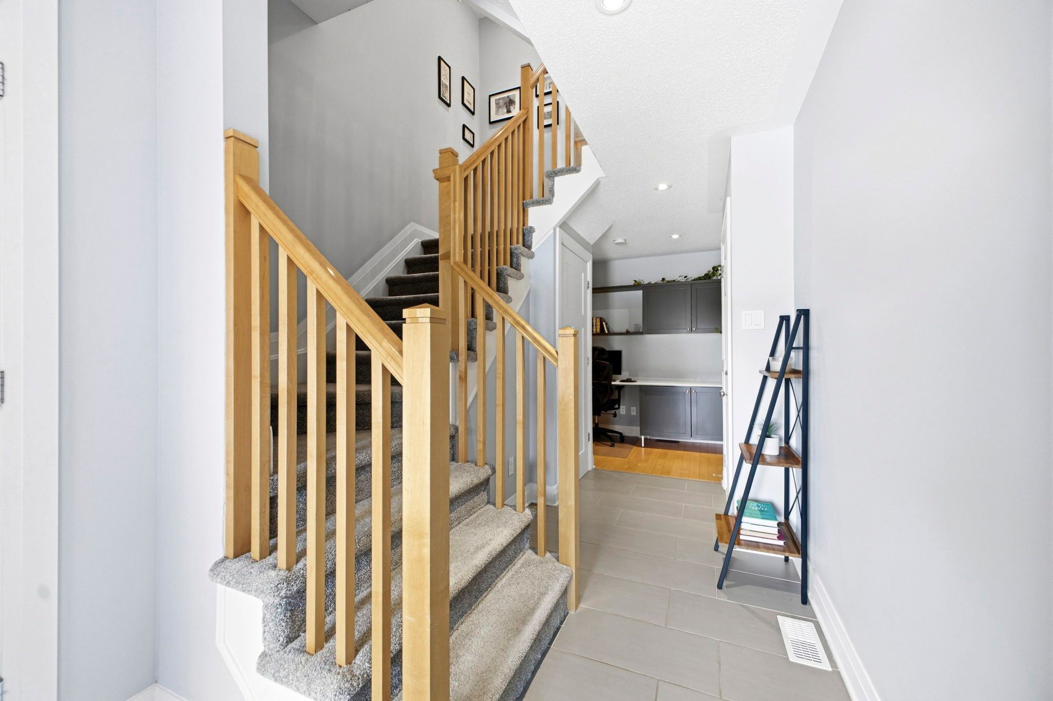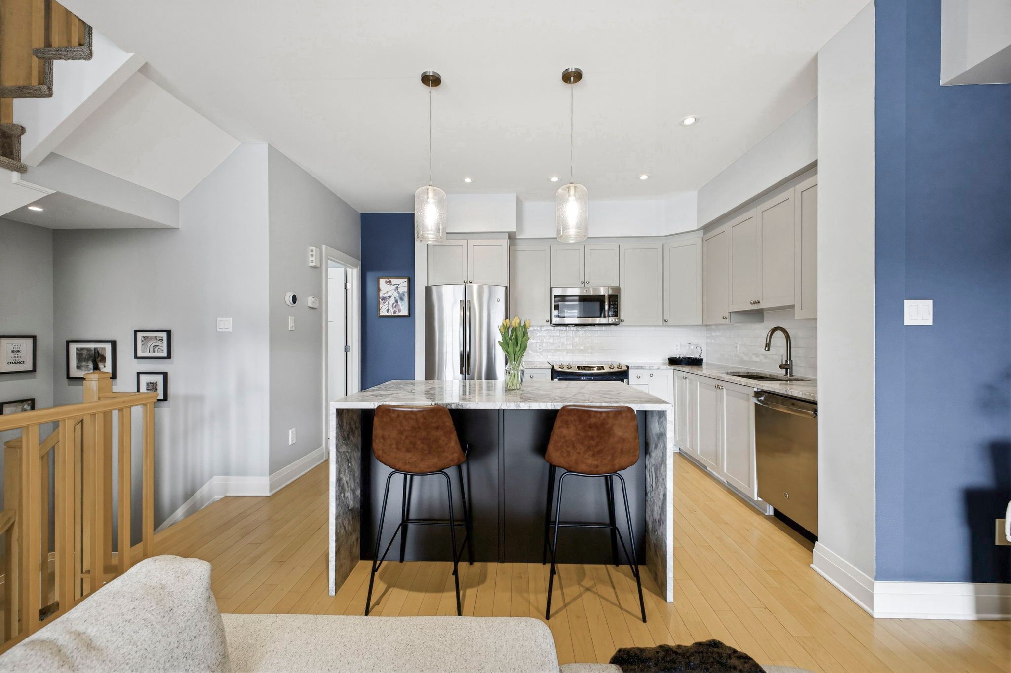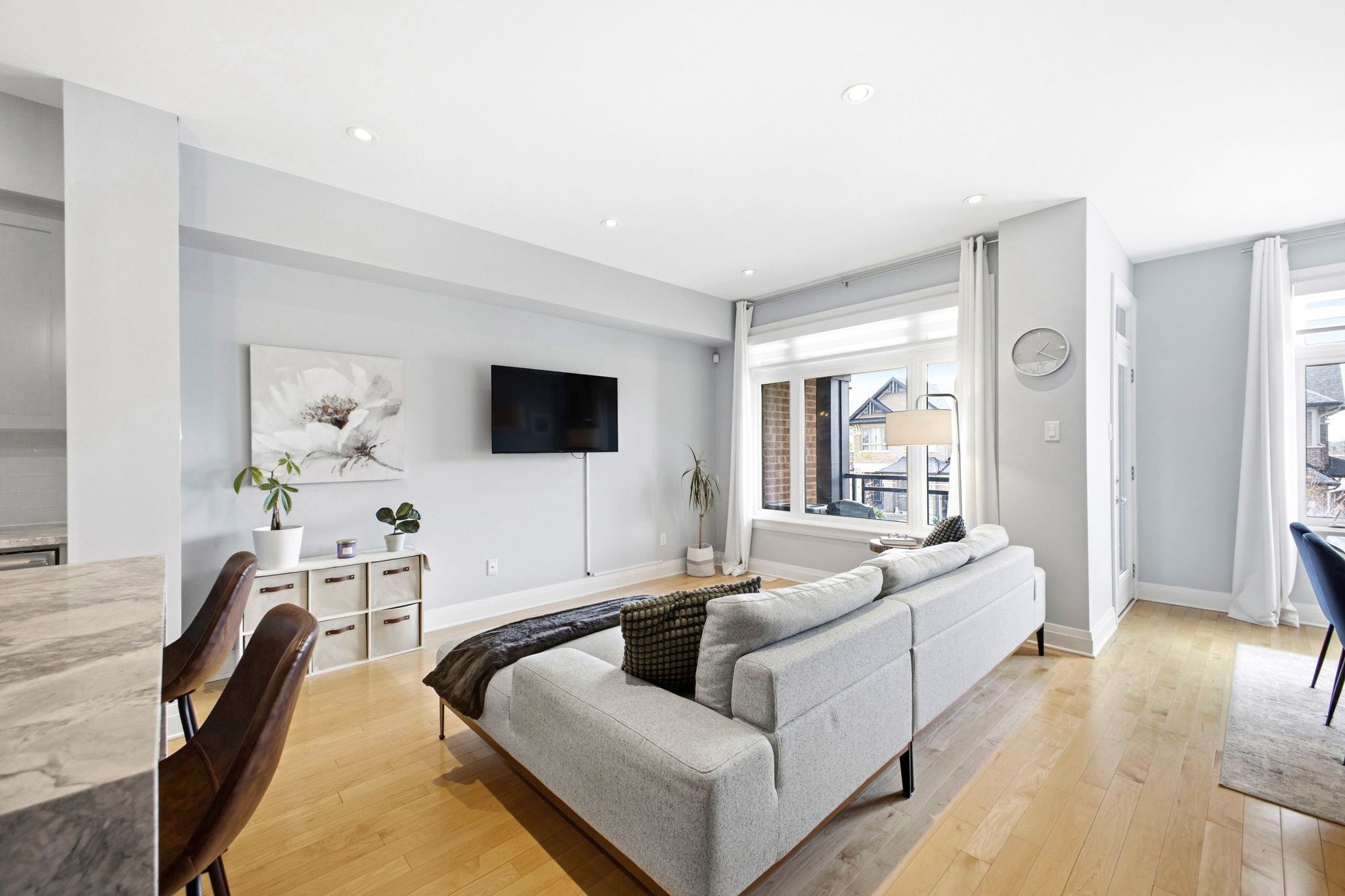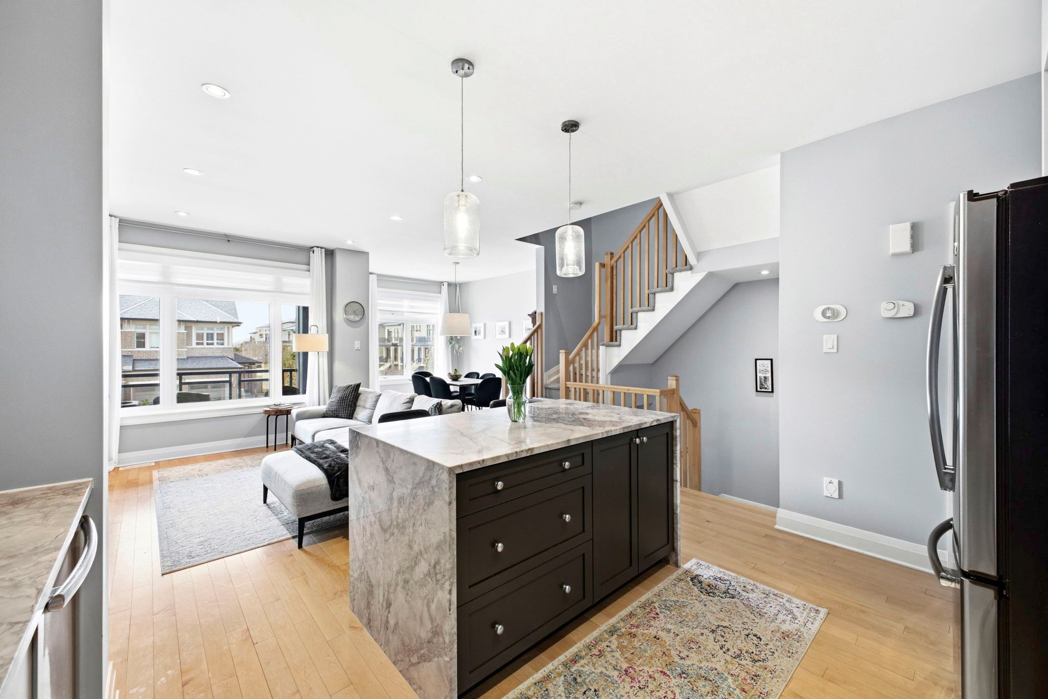 This home shows like a model with notable upgrades throughout! Discover the modern design & smart functionality of this stylish home! The ground level welcomes you with a spacious foyer & a versatile living area that can easily serve as a home office already outfitted with a built in desk -ideal for today's flexible lifestyles. This level also provides convenient interior access to the garage & offers plenty of storage, making day-to-day living both practical & efficient. The second level serves as the heart of the home, showcasing a bright & open-concept design. Filled with natural light & flow creating a warm & inviting space for both entertaining and everyday living. The contemporary kitchen features sleek cabinetry, quality finishes, & a showpiece waterfall edge quartz island that provides additional workspace & casual seating. A convenient two-piece powder room is located on this level, adding to the overall functionality. This floor also includes access to an outdoor terrace, perfect for enjoying fresh air & relaxing moments. On the upper level, you'll find two well-proportioned bedrooms designed for comfort & privacy along with a loft/flex space ideal for another home office. A full bathroom featuring modern finishes and a clean, efficient layout. The basement offers unfinished storage space. With its thoughtful three-storey design, this home offers a perfect balance of style, effeciency, low maintenance & practicality. This home is an excellent choice for professionals, investors, couples, or small families seeking a contemporary home in a convenient location close to parks, schools, shopping, and transit. This is a fantastic opportunity to own a beautifully designed richcraft home that delivers comfort, functionality, and modern appeal. Great location close to many amenities, public transit, parks, schools and more. Low monthly maintenance fee of $62. 84 covers management, snow removal for common areas, & general maintenance.