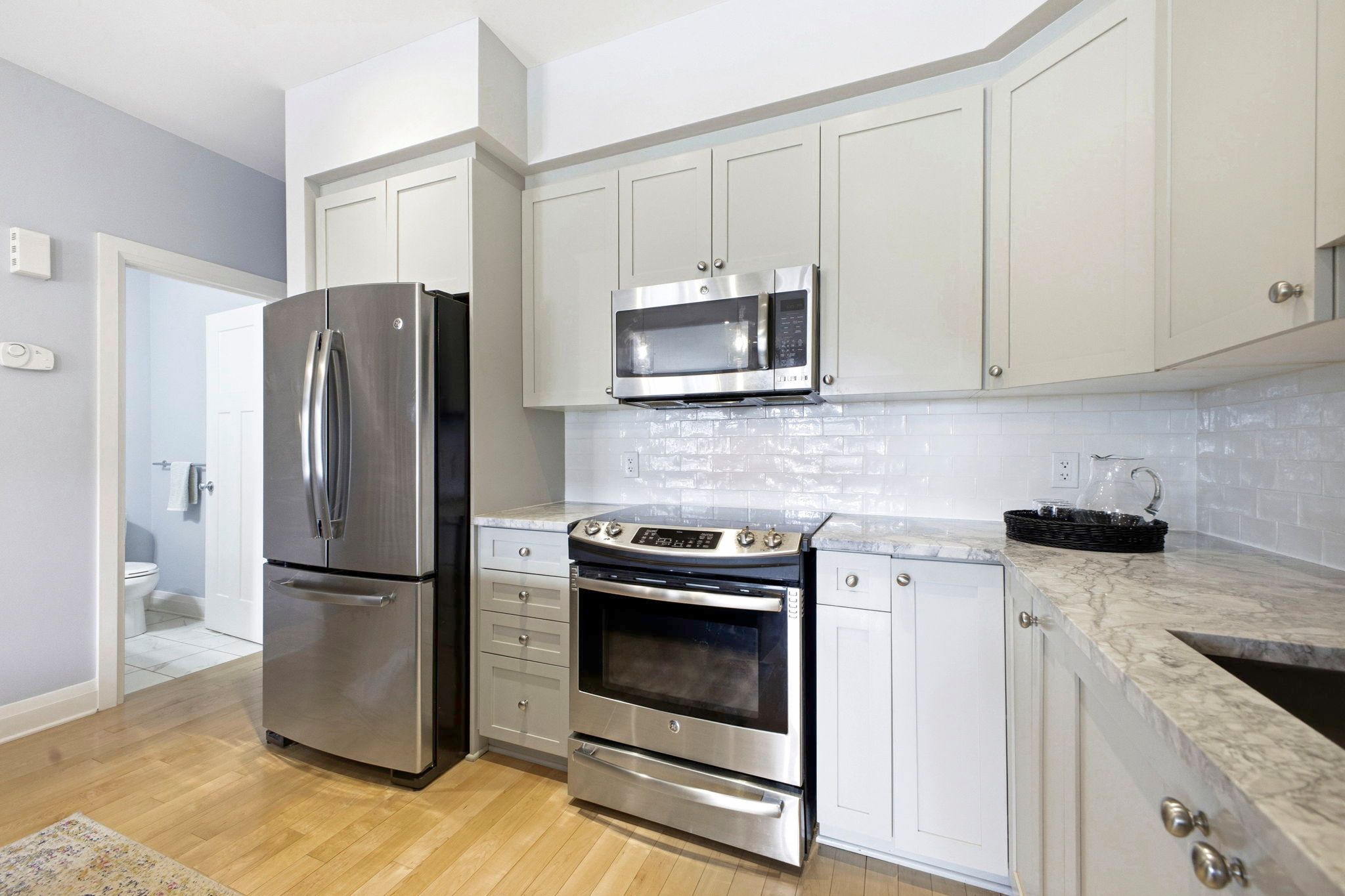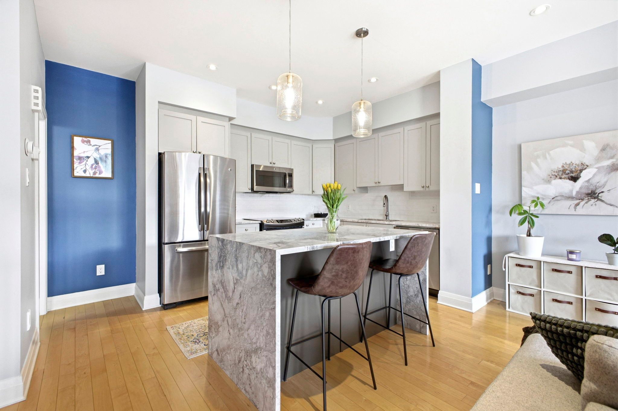 • Contemporary kitchen with sleek finishes and waterfall edge quartz island.