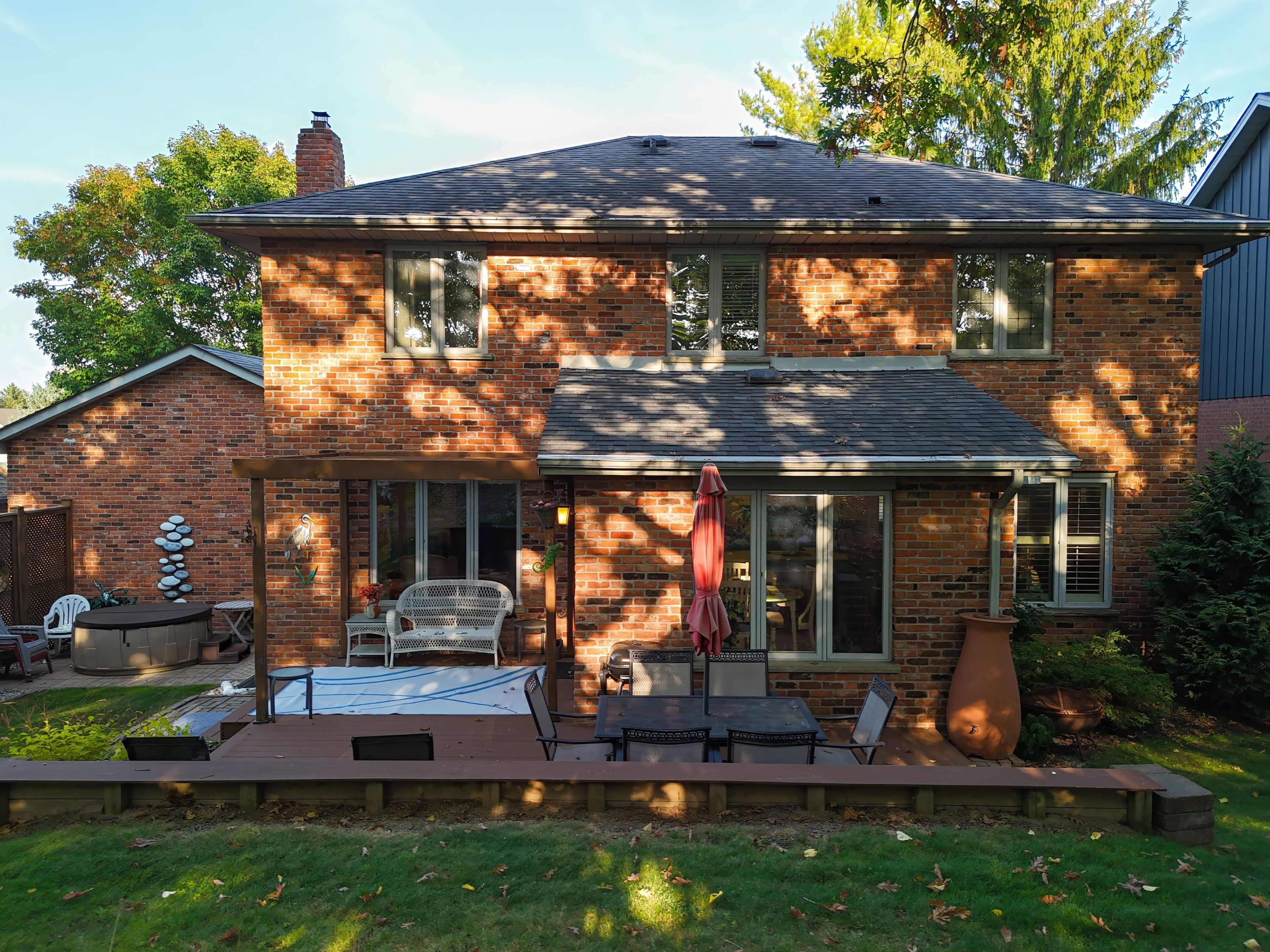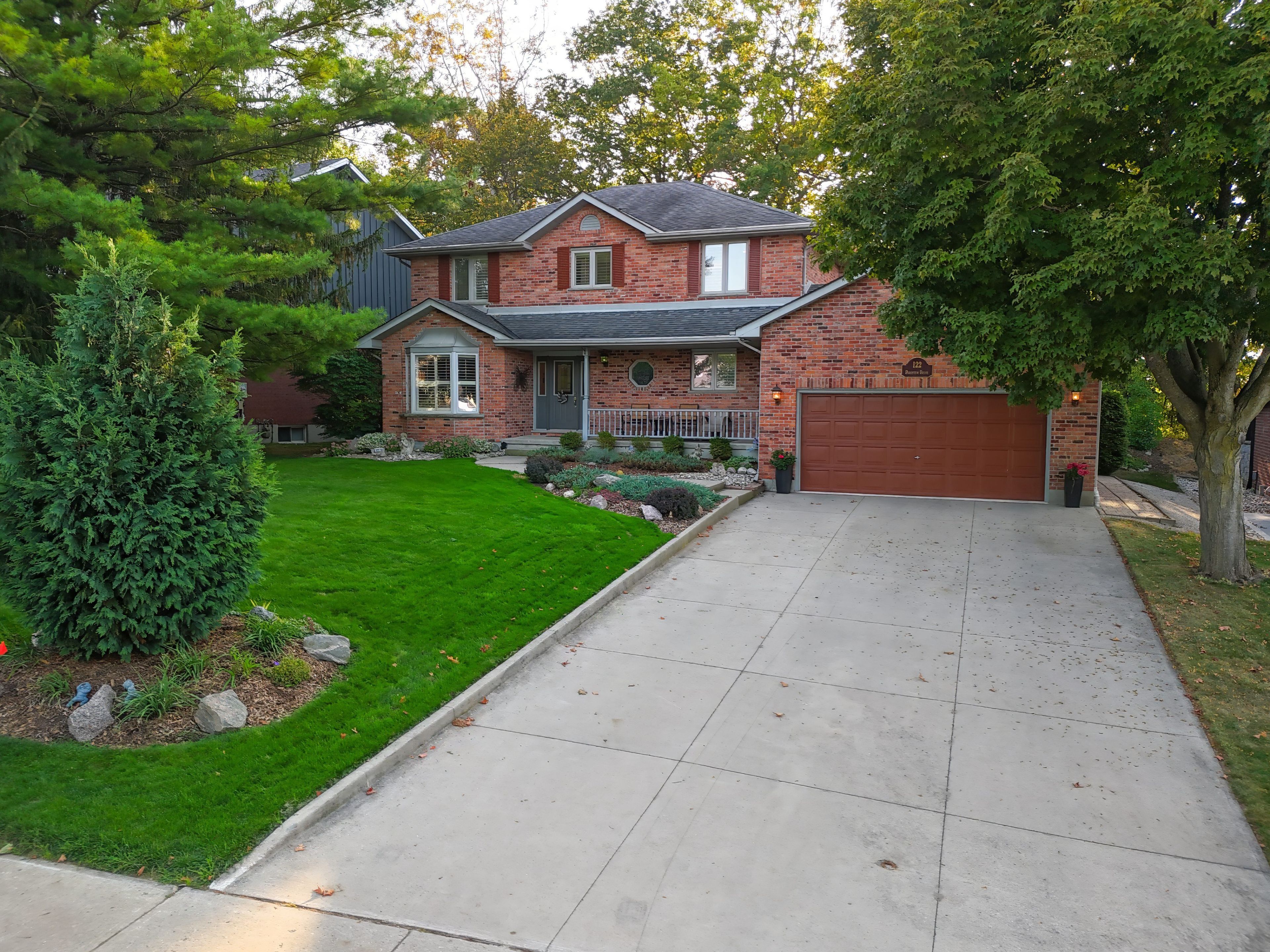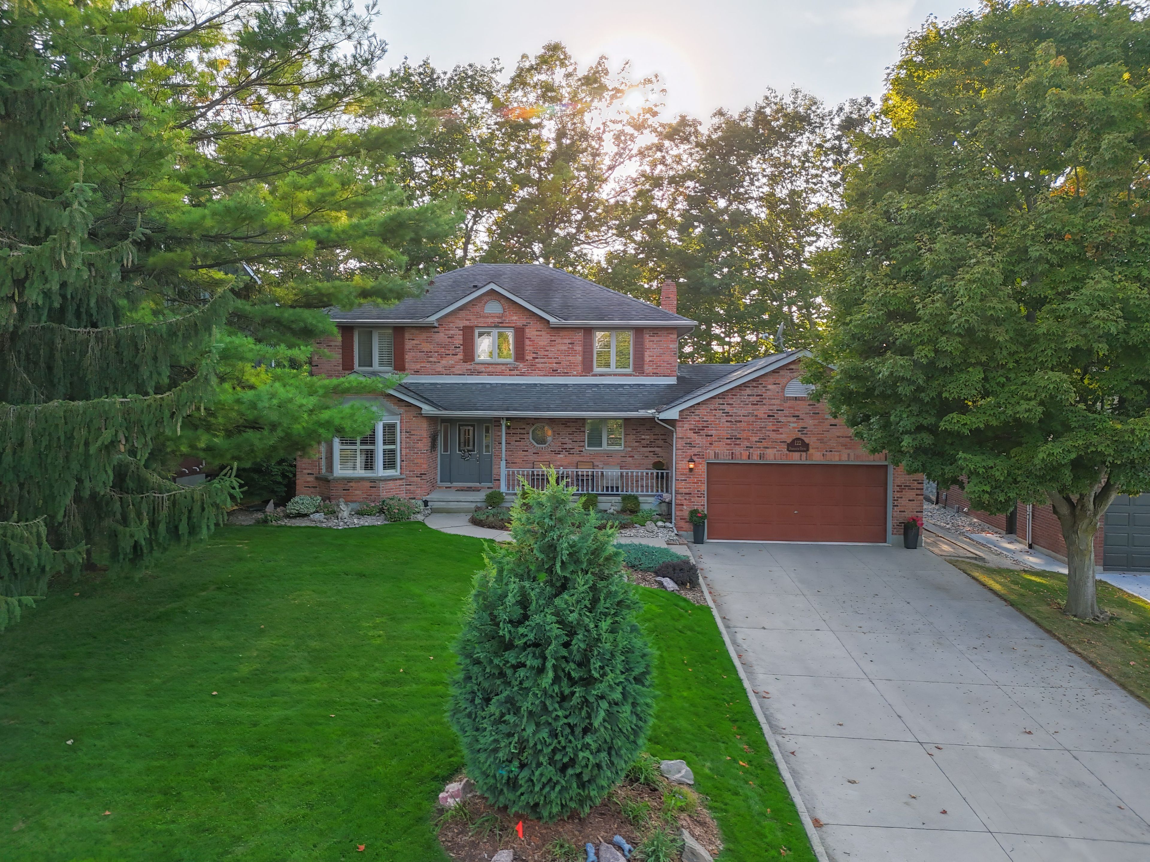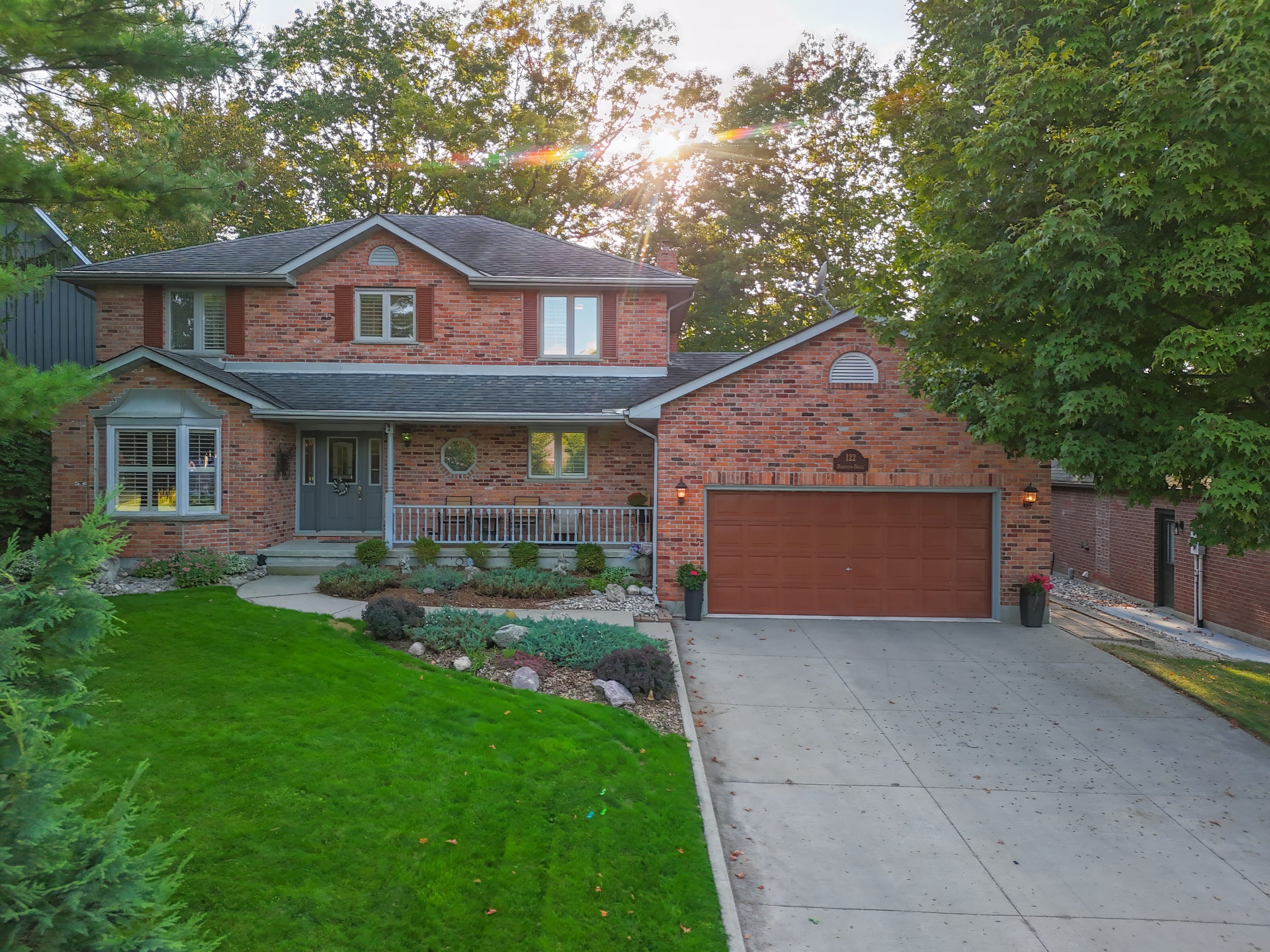 Welcome to this beautifully maintained home on a quiet street with friendly neighbours, backing onto the mill pond with seasonal water views and stunning sunsets. The large front porch is the perfect place to relax and take in the peaceful surroundings, while the private backyard offers a composite deck, patio behind the garage, hot tub (as is), irrigation system, and mature landscaping with cedar, hedges, bushes, and perennials. Inside, elegant french doors open to a bright living room, where rich hardwood flooring flows seamlessly into a spacious formal dining room. The refreshed kitchen features stainless steel appliances with a built-in microwave, quartz countertops, an updated backsplash, sink, and cabinet doors, while ceramic tile flooring continues into the laundry room. A cozy family room with a wood-burning fireplace and a convenient 2-piece bath complete the main level. The second floor offers four spacious bedrooms, all with hardwood flooring, a main 4-piece bath, and a primary retreat with walk-in closet and beautifully renovated 5-piece ensuite featuring a soaker tub, double sink vanity, and separate shower. The fully finished basement adds excellent living space with a large, open-concept recreation room, an additional bedroom, office area, workshop/hobby room, fruit cellar, and enlarged basement windows for natural light. An exercise room provides potential to convert into a spacious bathroom with ensuite privileges. Additional highlights include an owned water softener. Enjoy a spacious cement driveway accommodating six cars plus a two-car garage. Notable updates include the kitchen refresh (2018), primary ensuite renovation (2019), bathroom fixture updates (2020), finished basement with enlarged windows (2022), new furnace and water heater (2024), and garage door mechanism replacement (2025). A wonderful opportunity to enjoy space, privacy, and thoughtful updates in a beautiful natural setting.