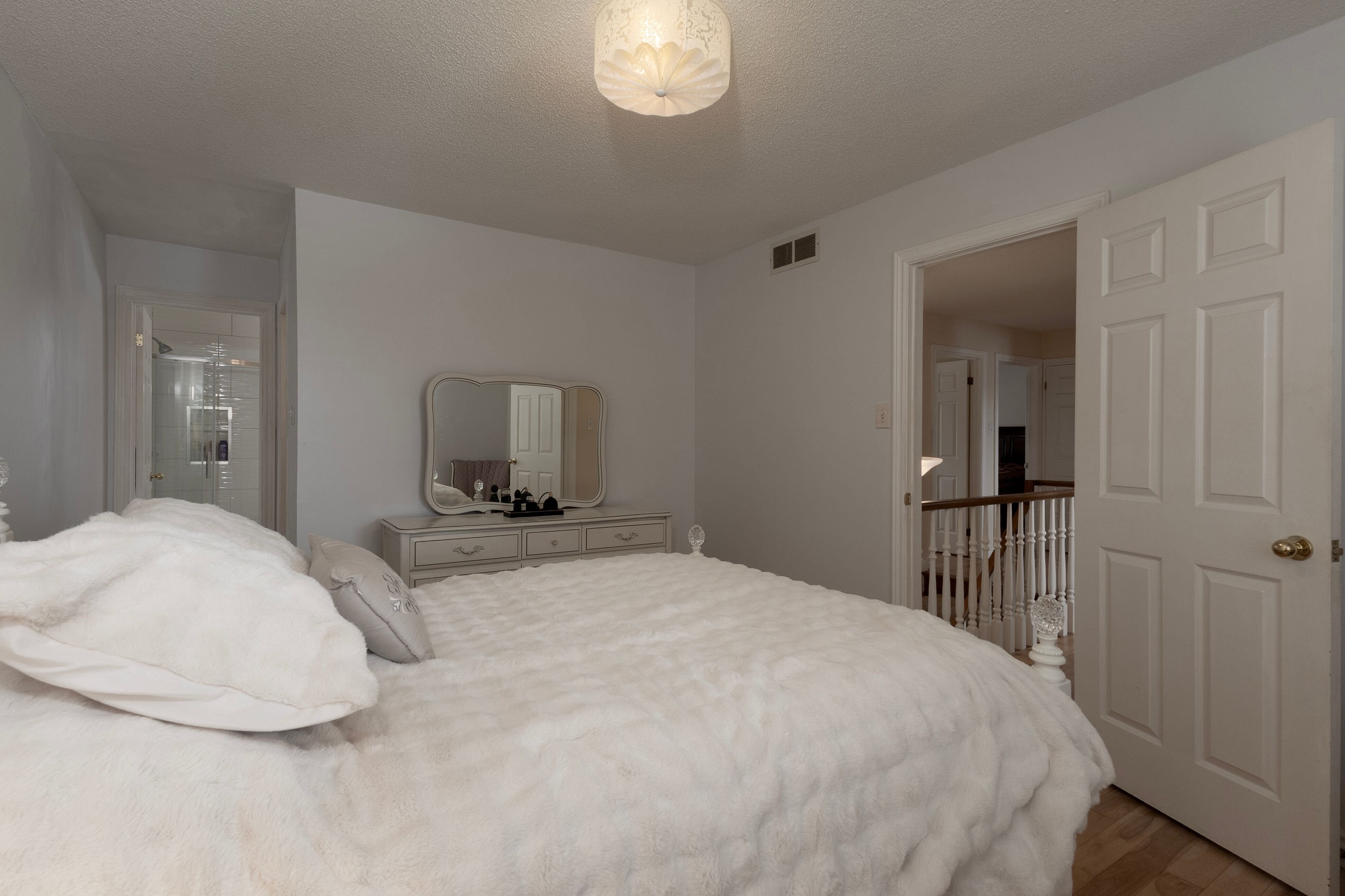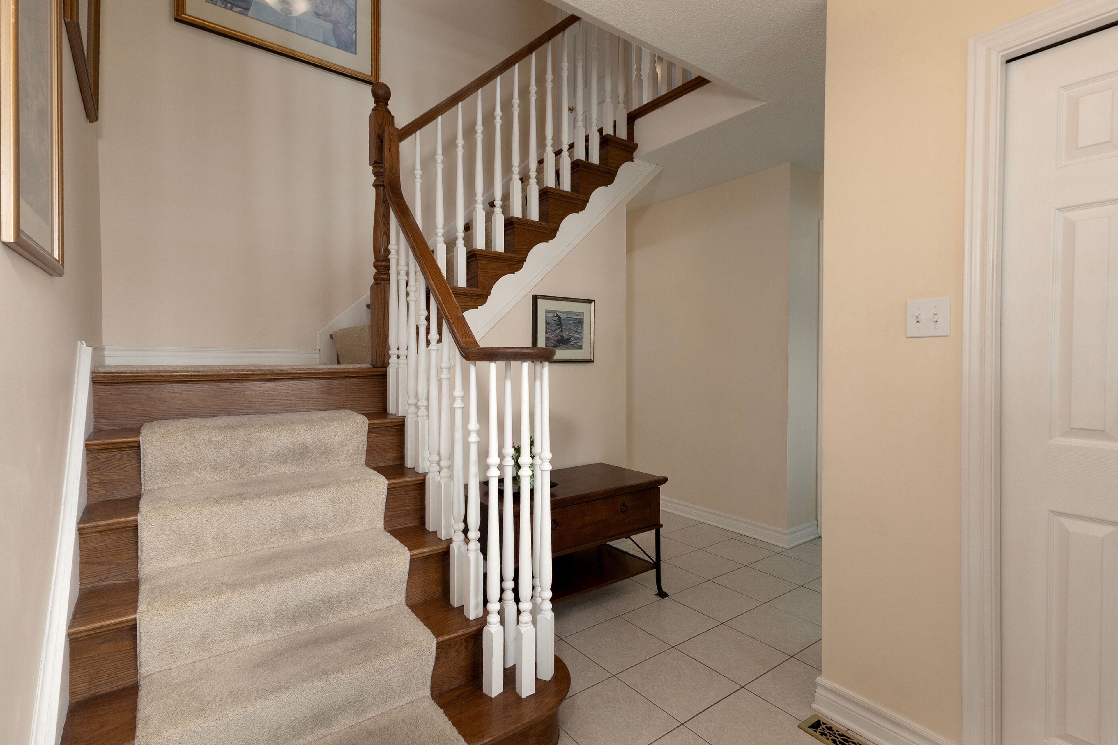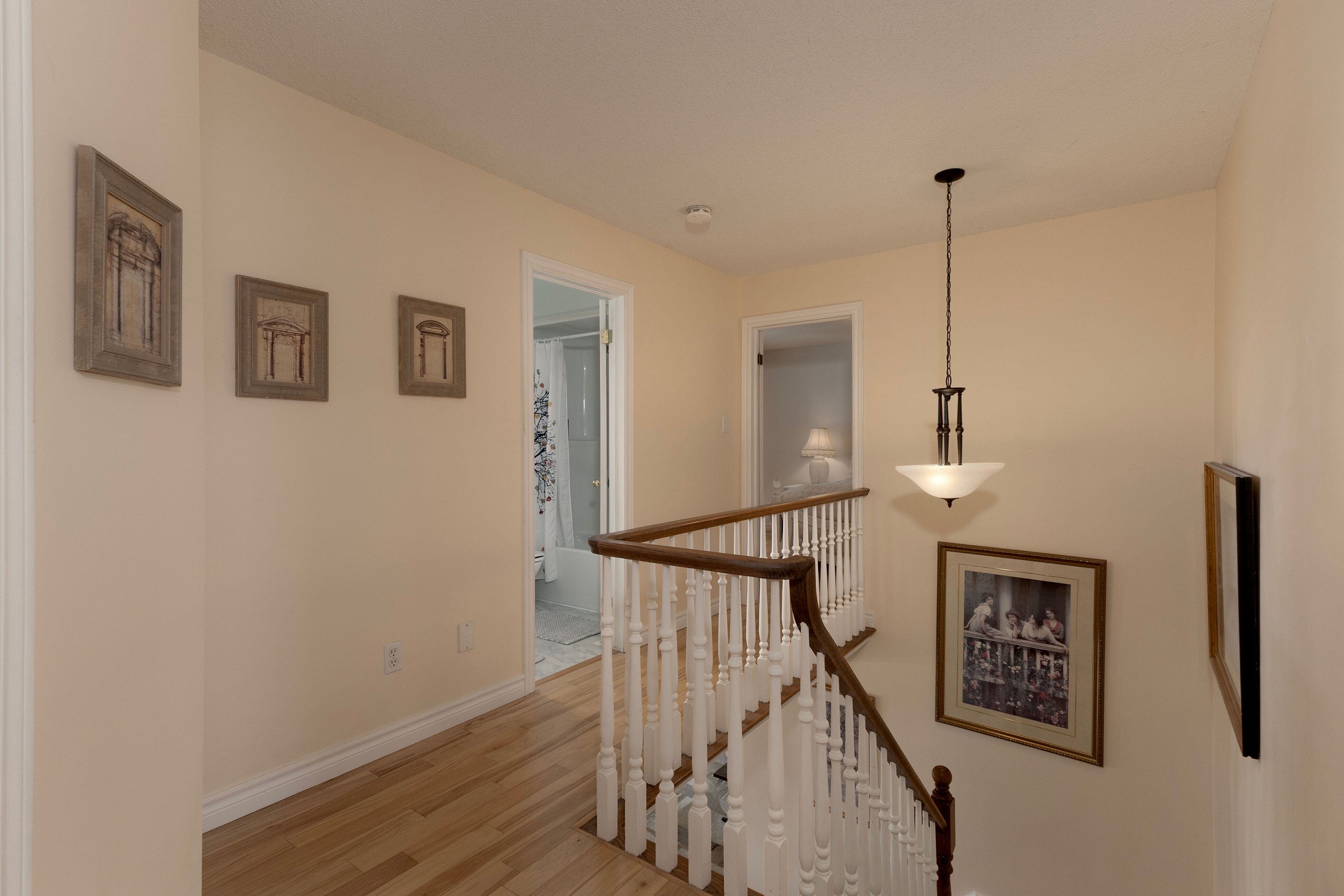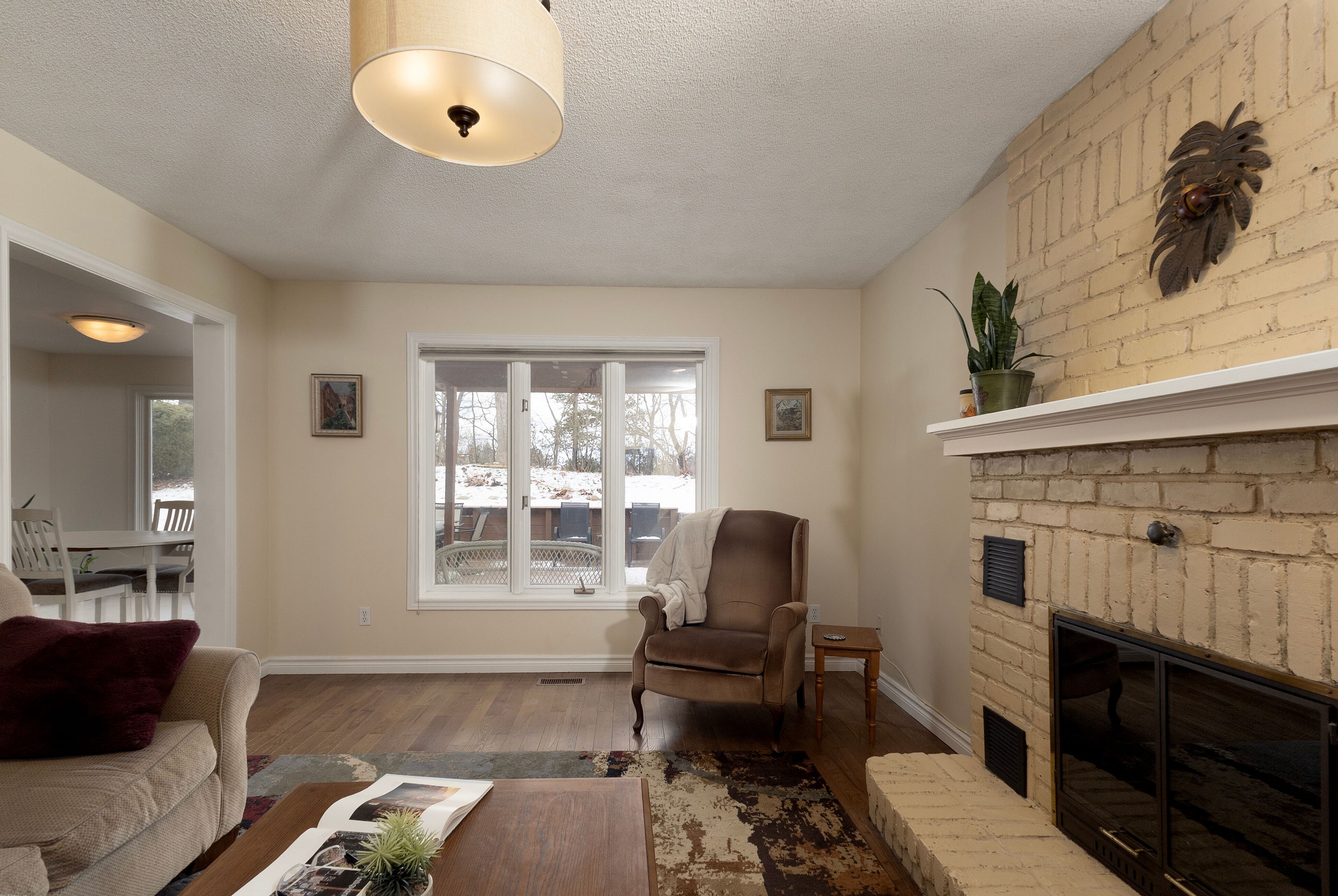 Welcome to this beautifully maintained home on a quiet street with friendly neighbours, backing onto the mill pond with seasonal water views and stunning sunsets. The large front porch is the perfect place to relax and take in the peaceful surroundings, while the private backyard offers a composite deck, patio behind the garage, hot tub (as is), irrigation system, and mature landscaping with cedar, hedges, bushes, and perennials. Inside, elegant french doors open to a bright living room, where rich hardwood flooring flows seamlessly into a spacious formal dining room. The refreshed kitchen features stainless steel appliances with a built-in microwave, quartz countertops, an updated backsplash, sink, and cabinet doors, while ceramic tile flooring continues into the laundry room. A cozy family room with a wood-burning fireplace and a convenient 2-piece bath complete the main level. The second floor offers four spacious bedrooms, all with hardwood flooring, a main 4-piece bath, and a primary retreat with walk-in closet and beautifully renovated 5-piece ensuite featuring a soaker tub, double sink vanity, and separate shower. The fully finished basement adds excellent living space with a large, open-concept recreation room, an additional bedroom, office area, workshop/hobby room, fruit cellar, and enlarged basement windows for natural light. An exercise room provides potential to convert into a spacious bathroom with ensuite privileges. Additional highlights include an owned water softener. Enjoy a spacious cement driveway accommodating six cars plus a two-car garage. Notable updates include the kitchen refresh (2018), primary ensuite renovation (2019), bathroom fixture updates (2020), finished basement with enlarged windows (2022), new furnace and water heater (2024), and garage door mechanism replacement (2025). A wonderful opportunity to enjoy space, privacy, and thoughtful updates in a beautiful natural setting.