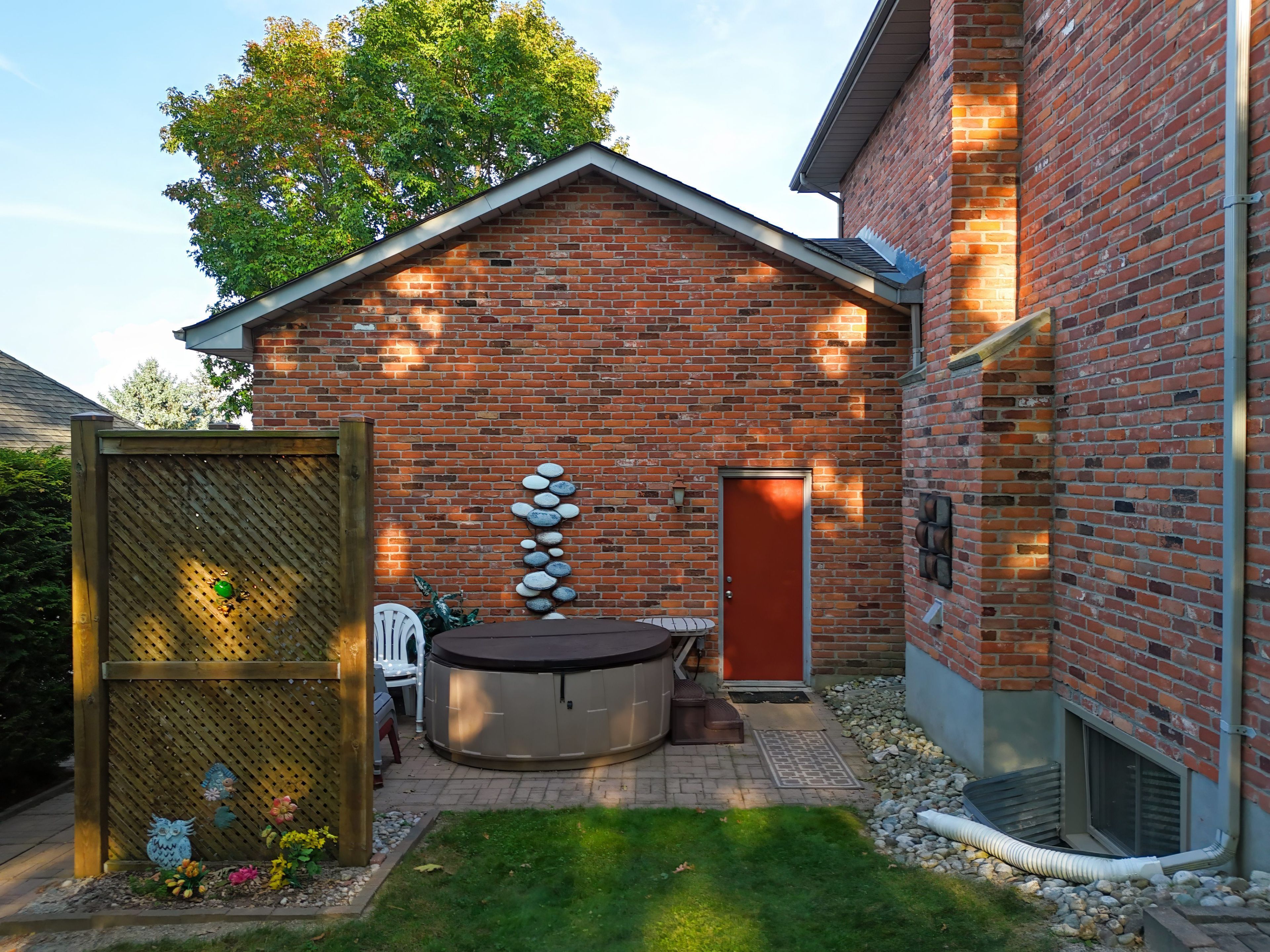 • Private backyard includes a composite deck, hot tub, and mature landscaping.