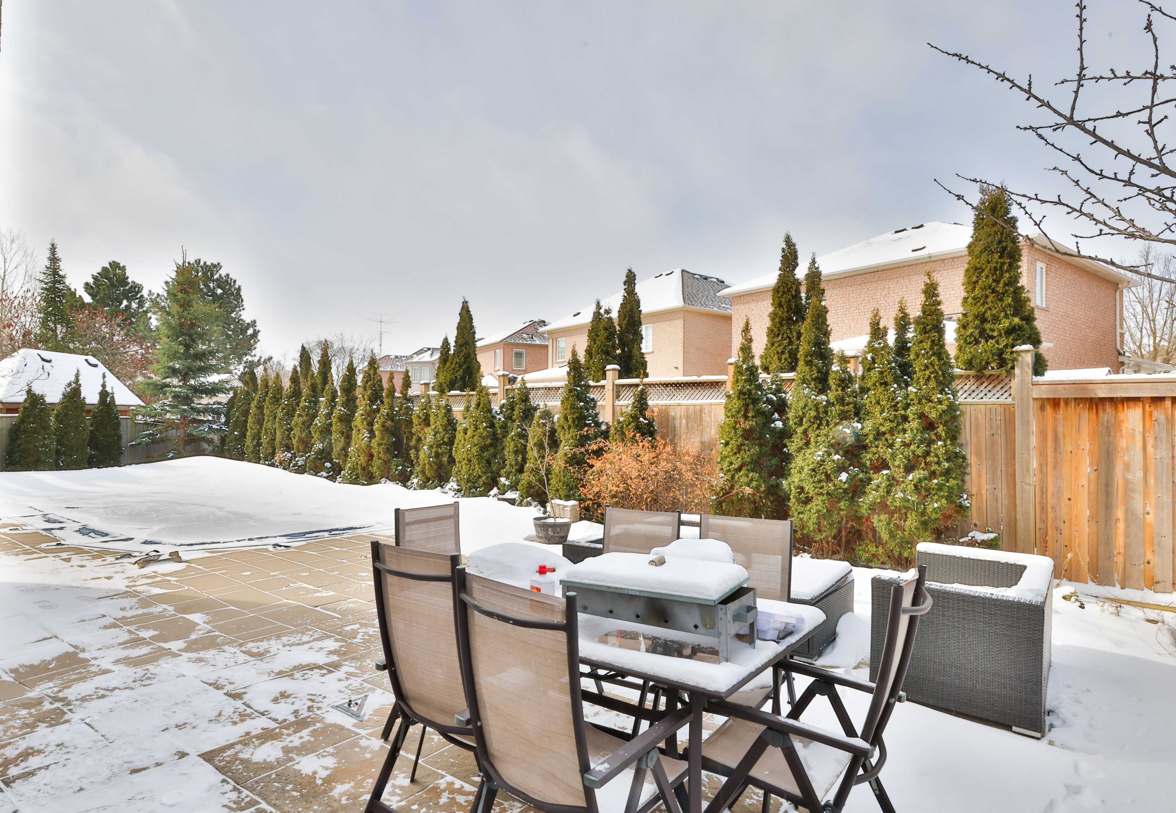 • Private oasis with a heated saltwater inground pool and mature trees.