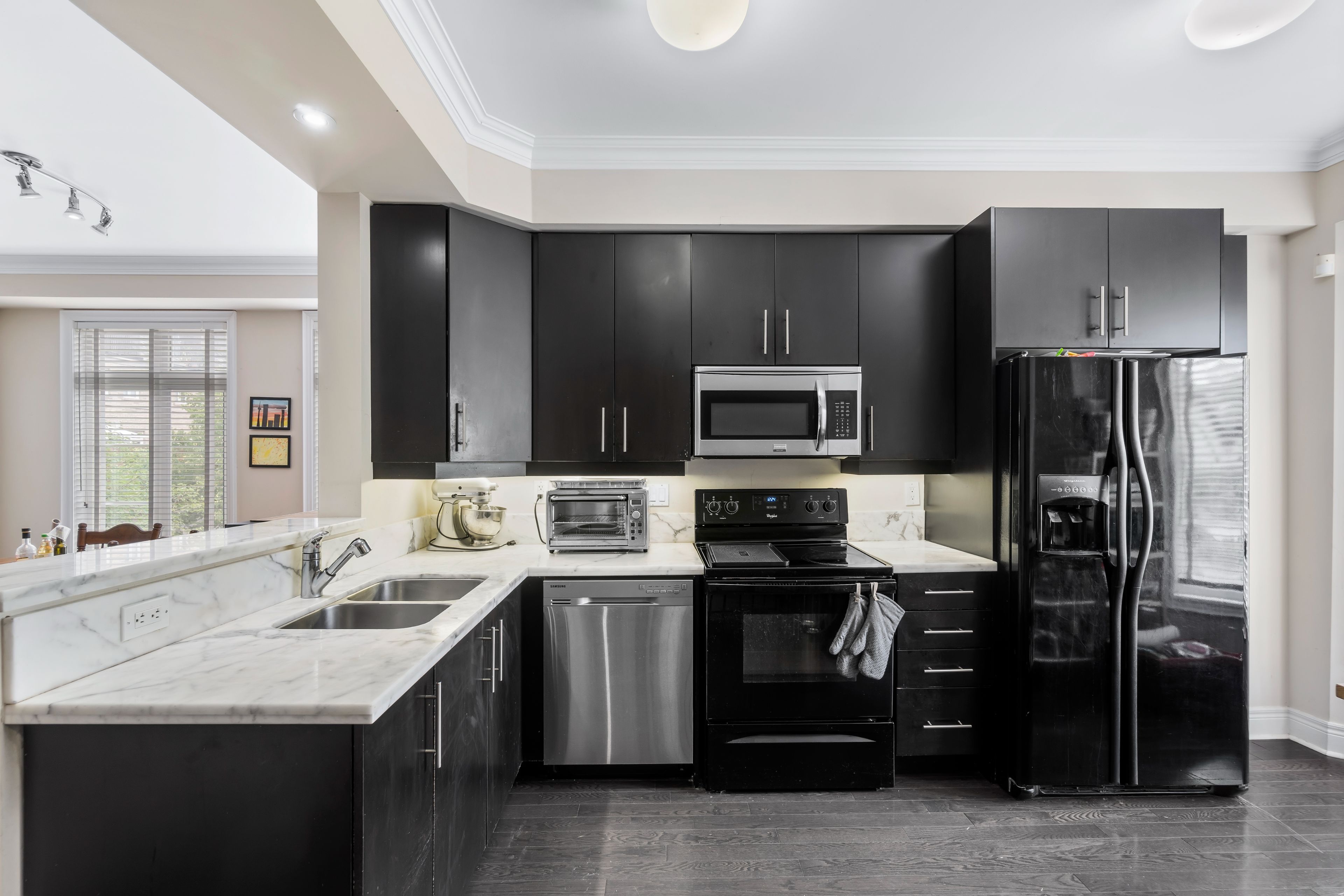 Available may 1, 2026-corner unit (practically a semi) flooded with sunlight due to its location and large thermal windows hardwood floors on main floor, new carpet to be installed for the new tenant for rest of the house, 3 luxury baths, convenient 2 storey with two full baths and 3 bedrooms all on same floor, spacious double garage (tandem), all 6 appliances included in rental. Property in move in condition. Walk to islington subway, norseman elementary school and community pool, great area for children or just carefree living with cafes and restaurants across the property.