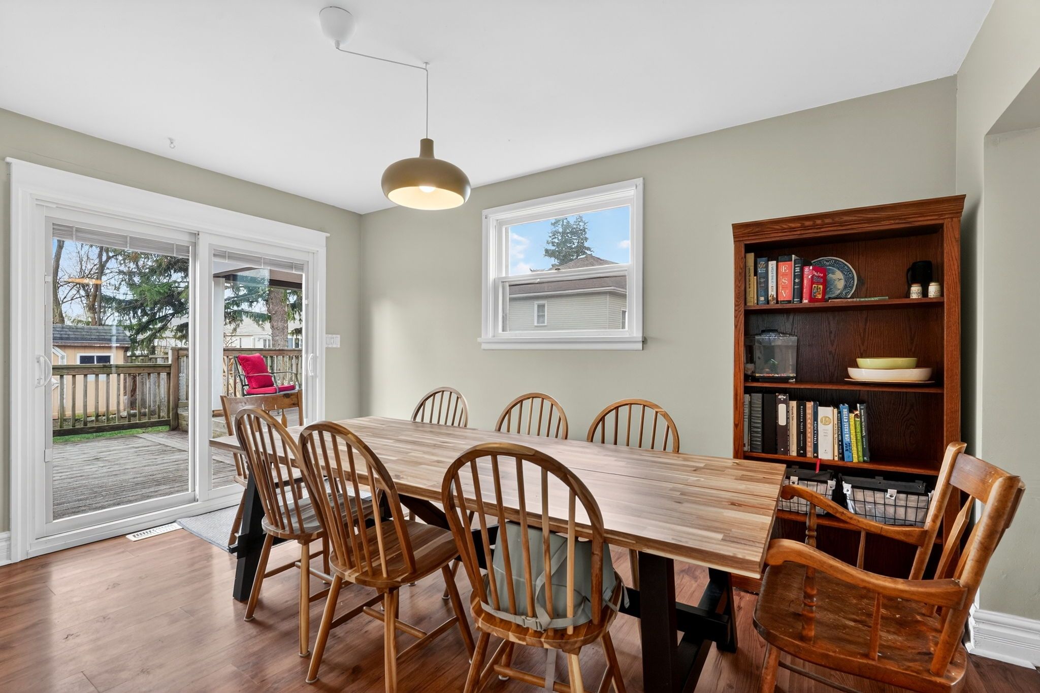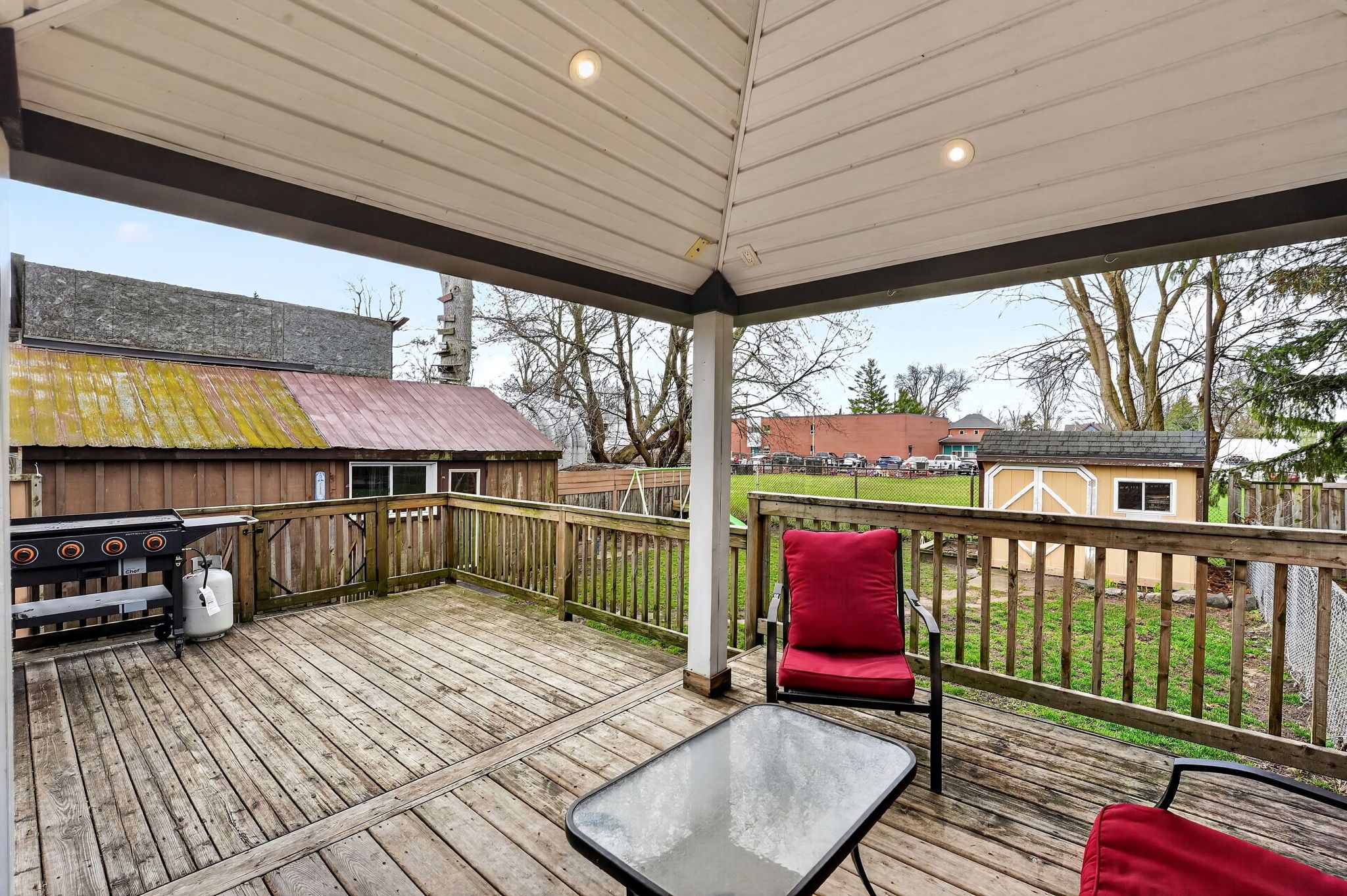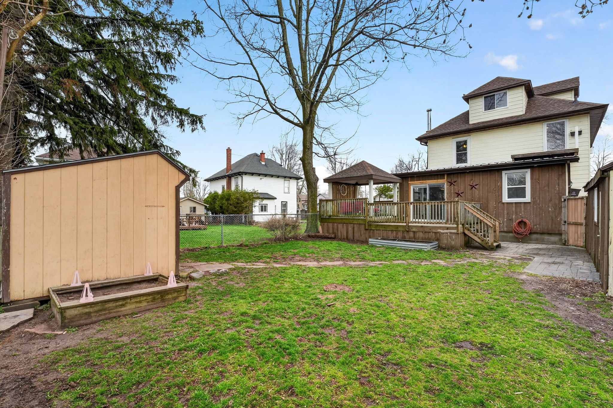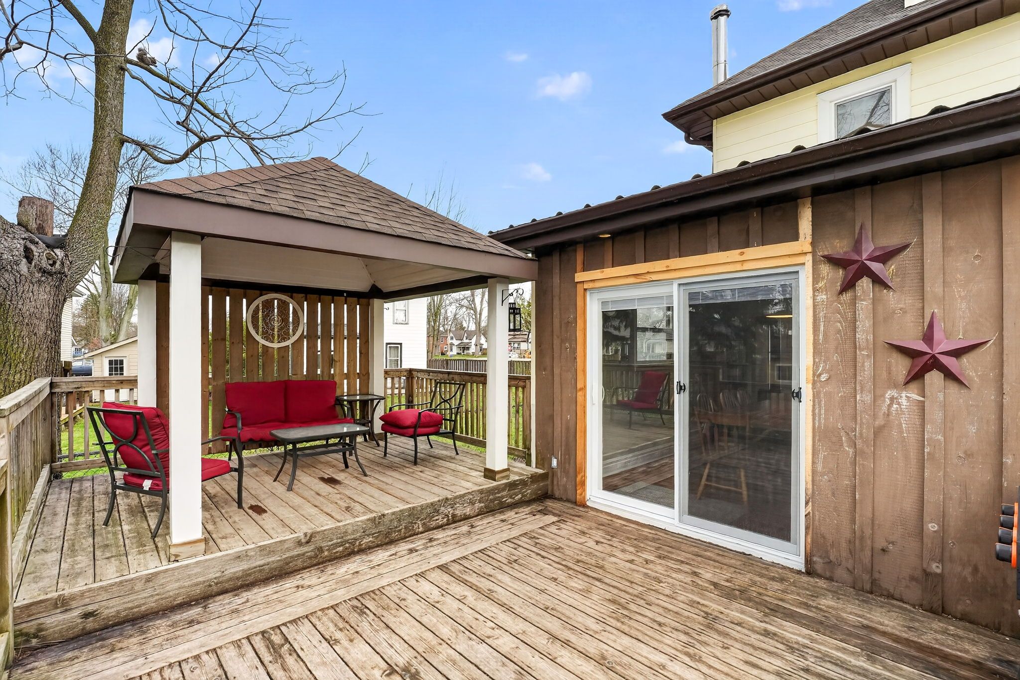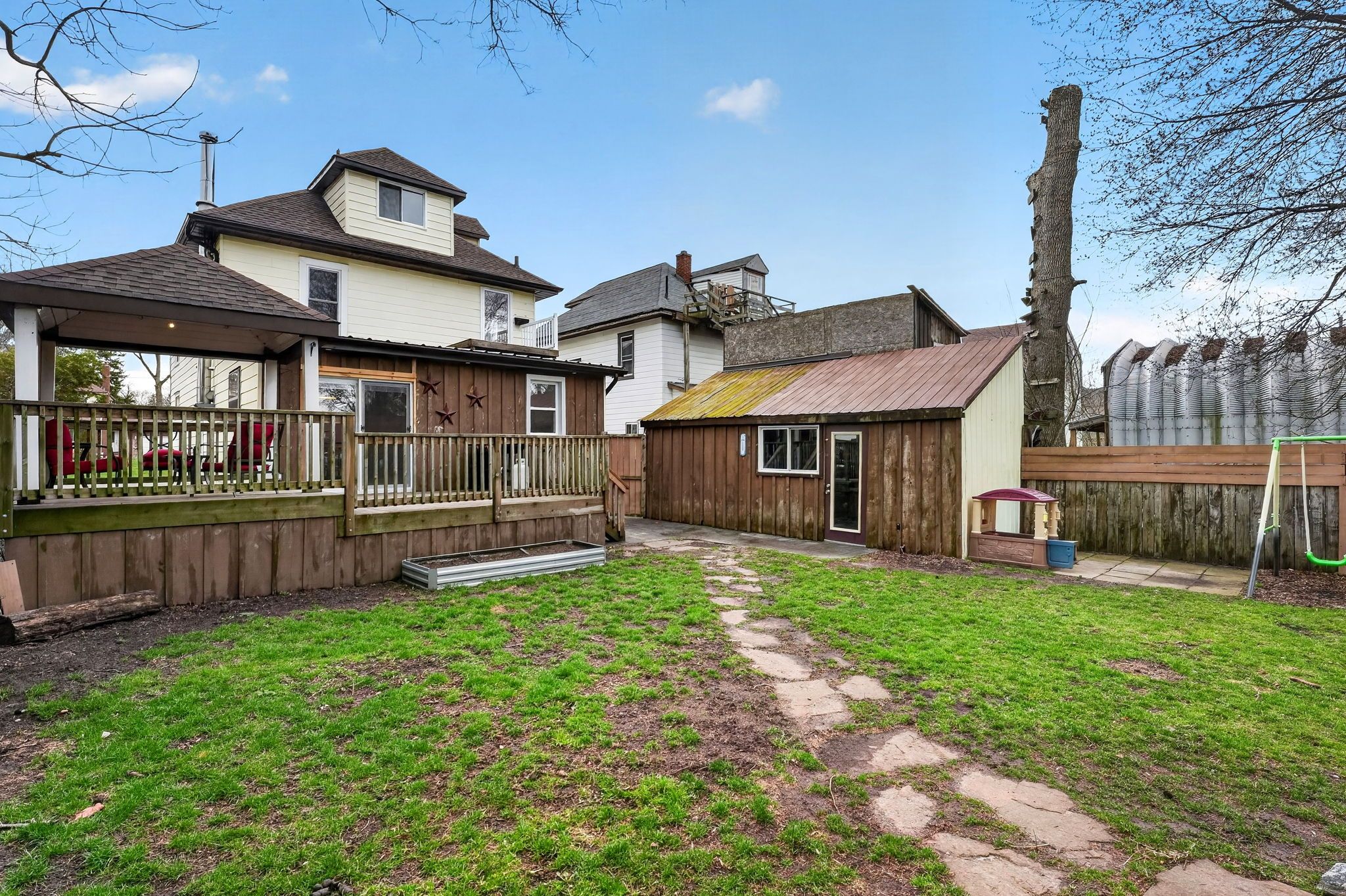 • Private backyard features a two-tier deck and room for gatherings.