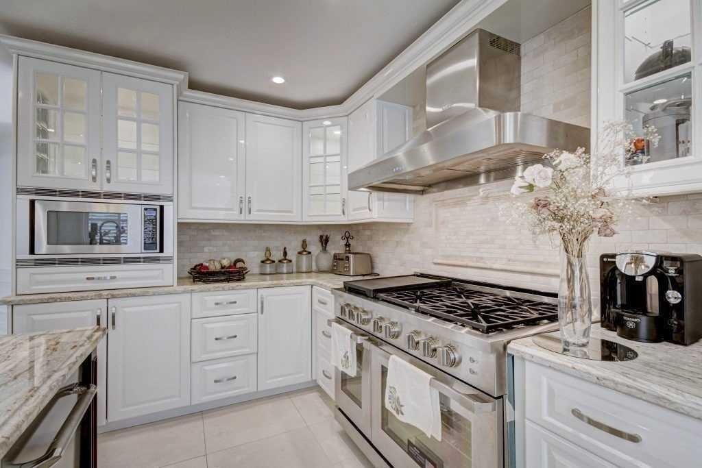 • High-end kitchen with island and top-of-the-line stainless steel appliances.