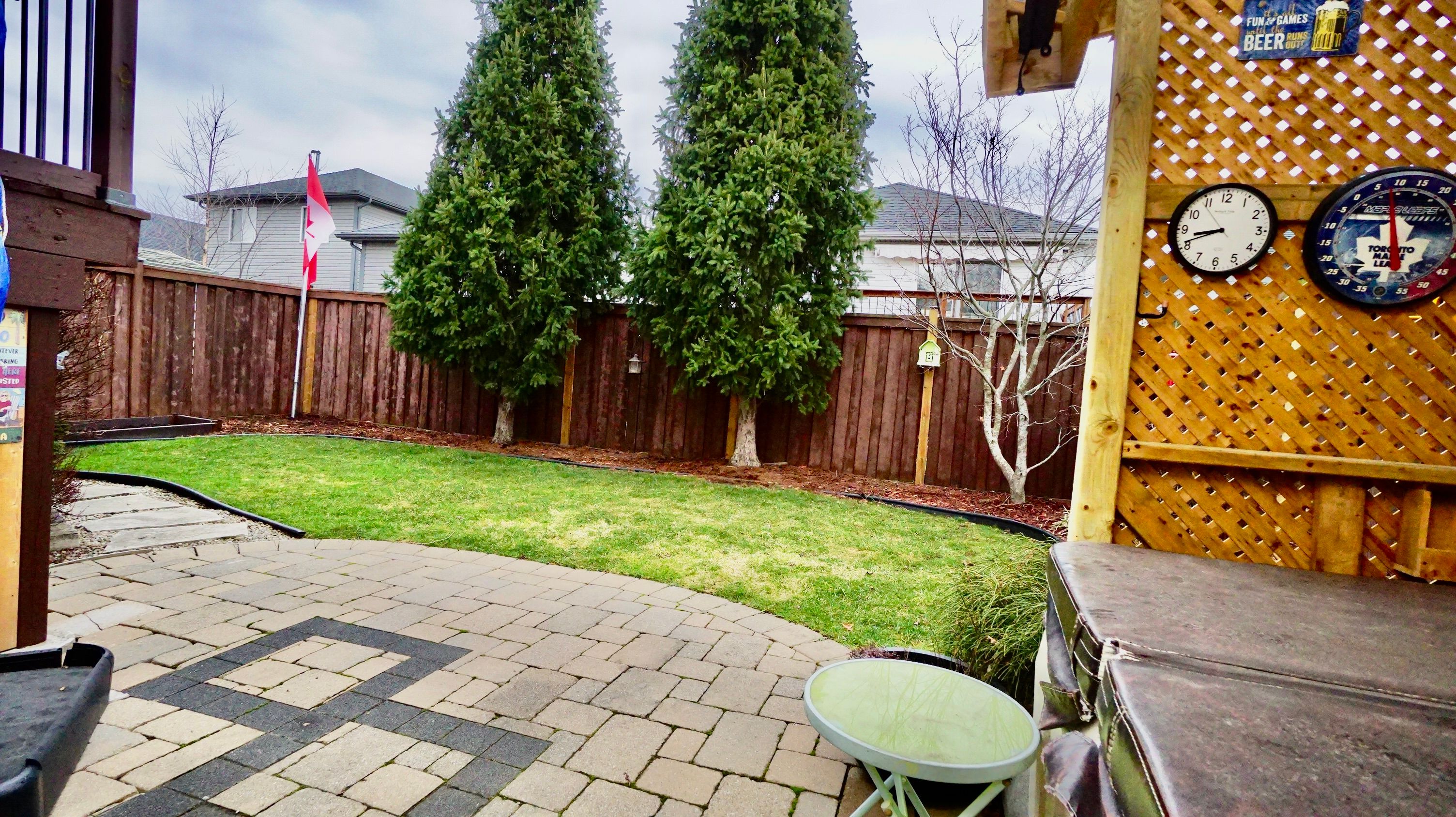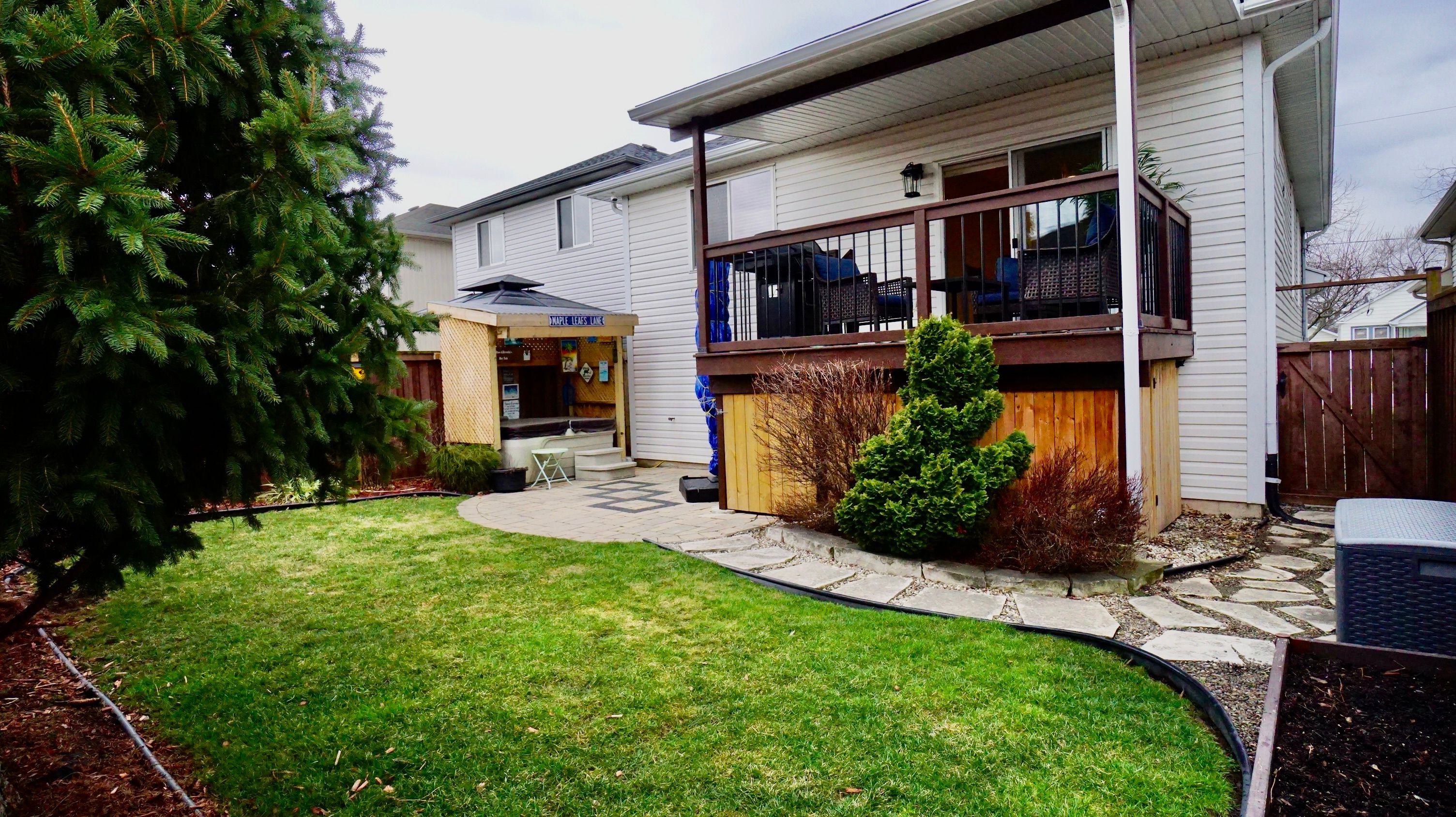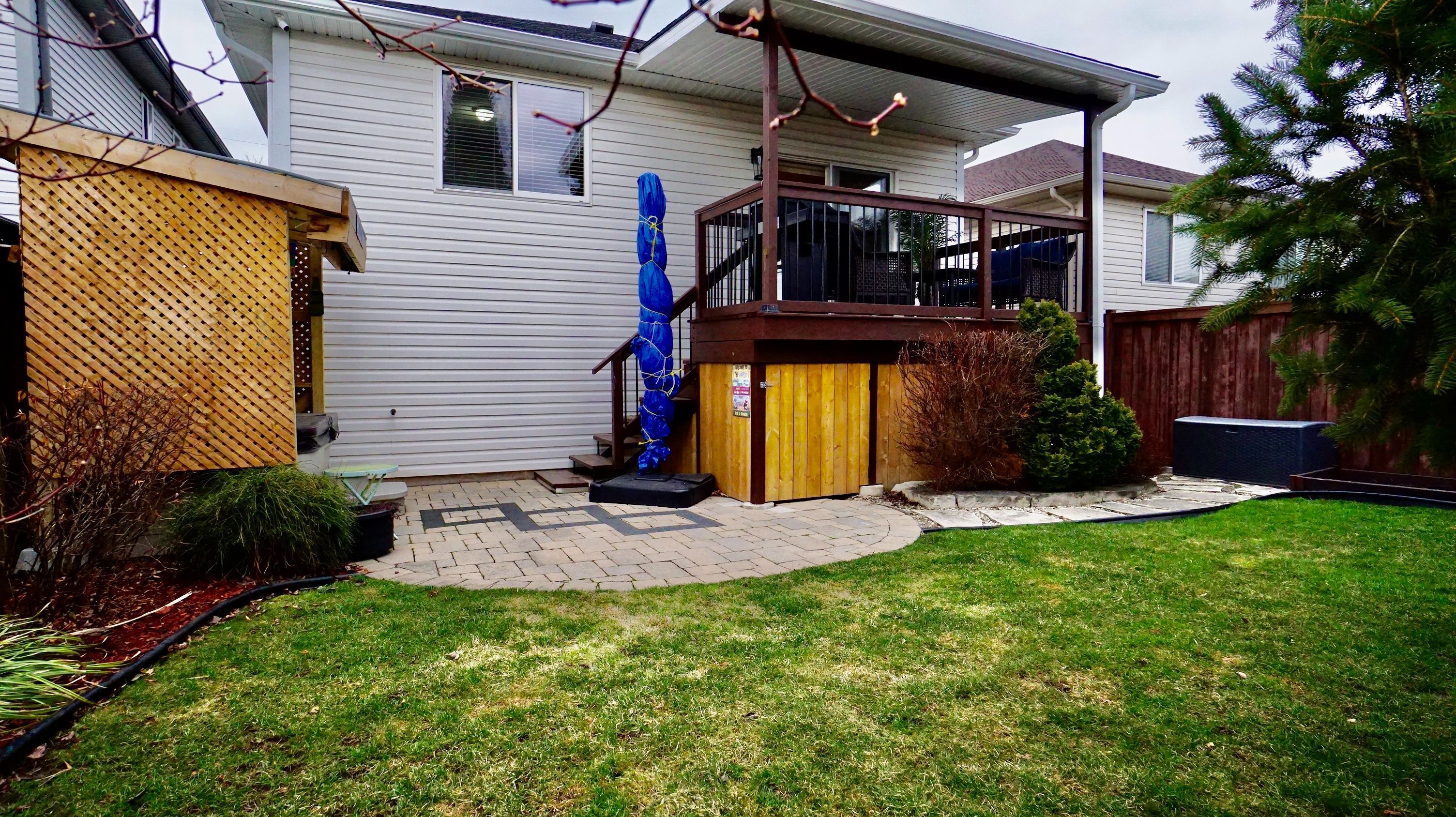• Covered deck overlooking a fully fenced yard with storage.