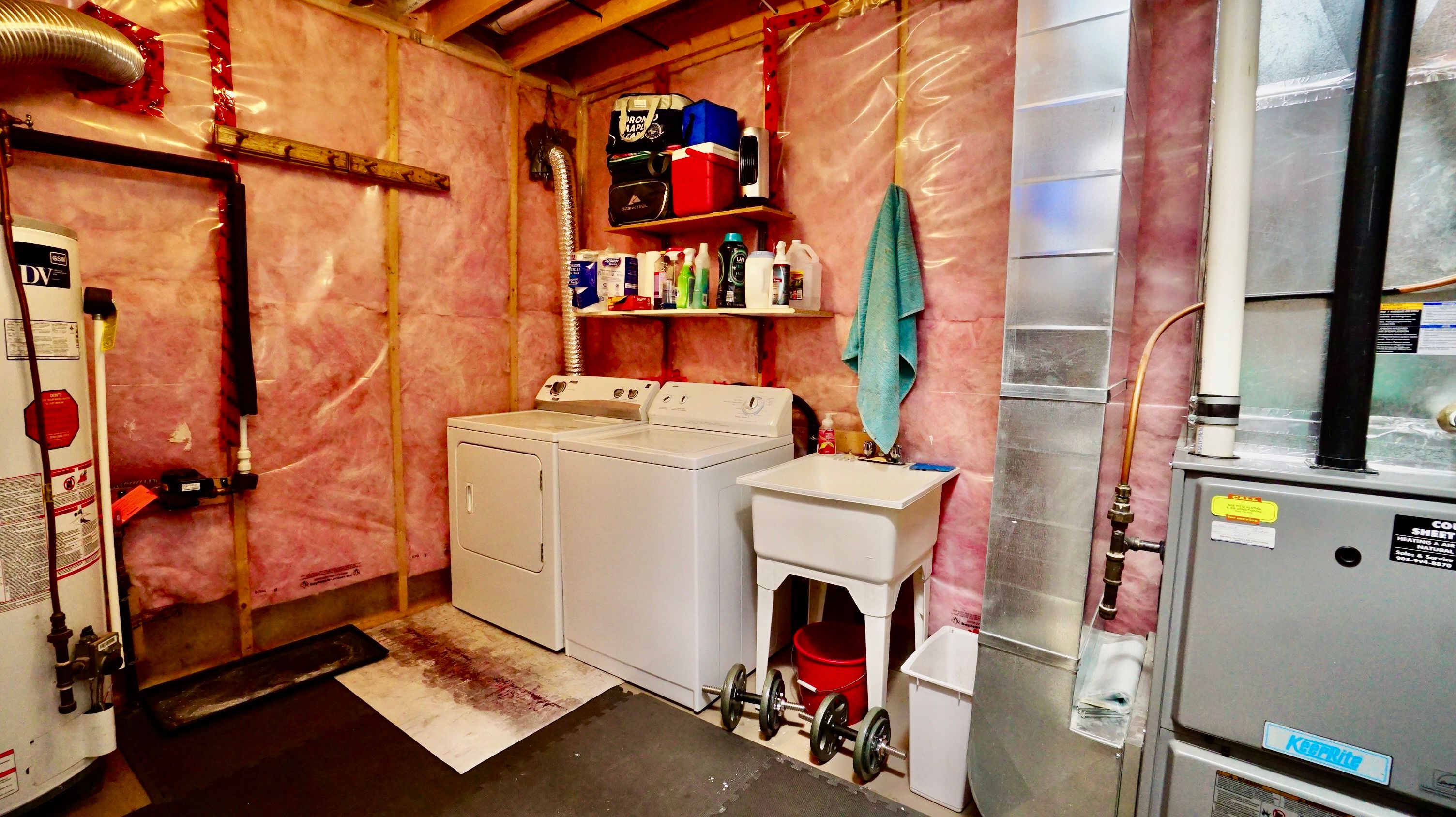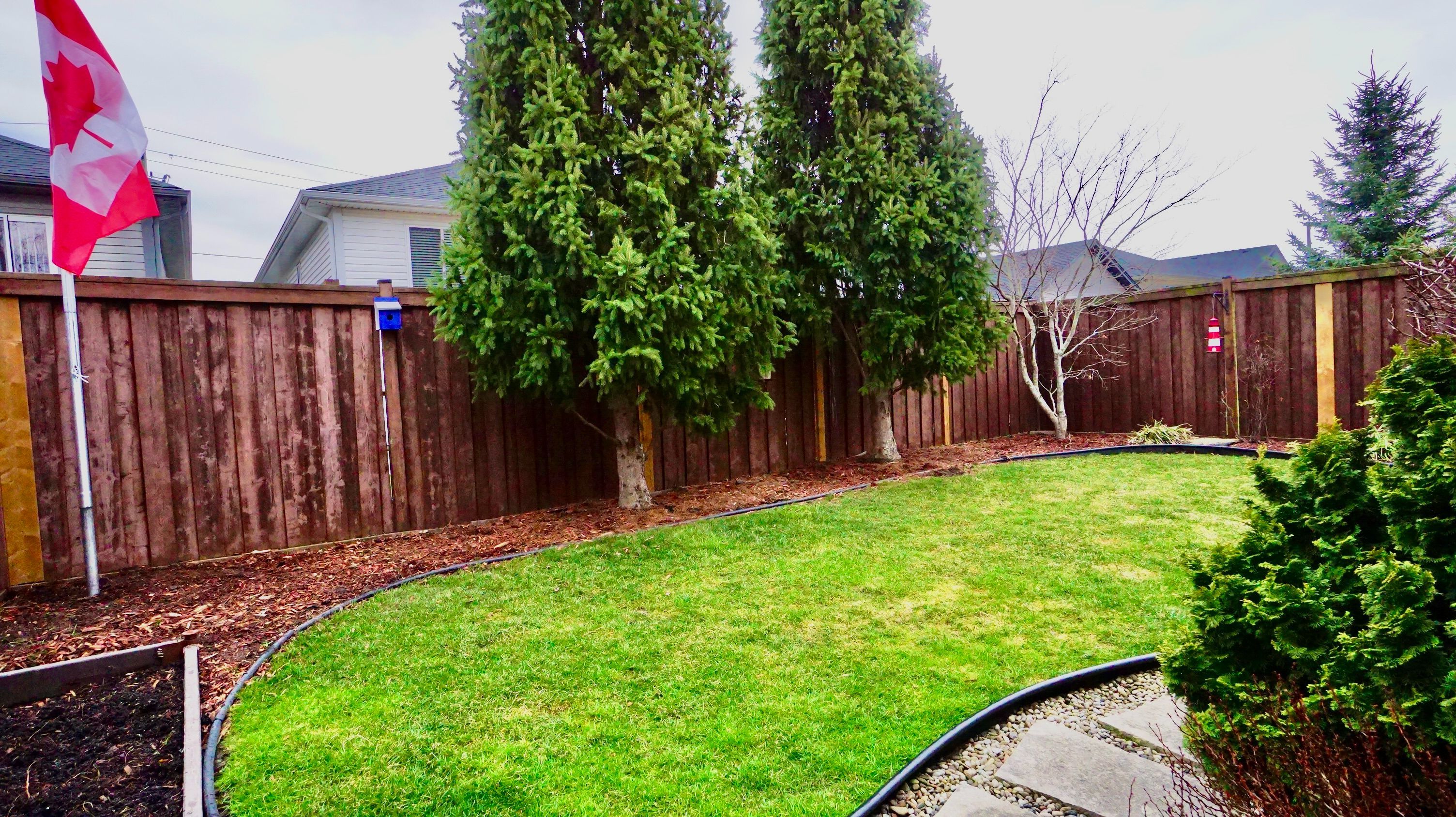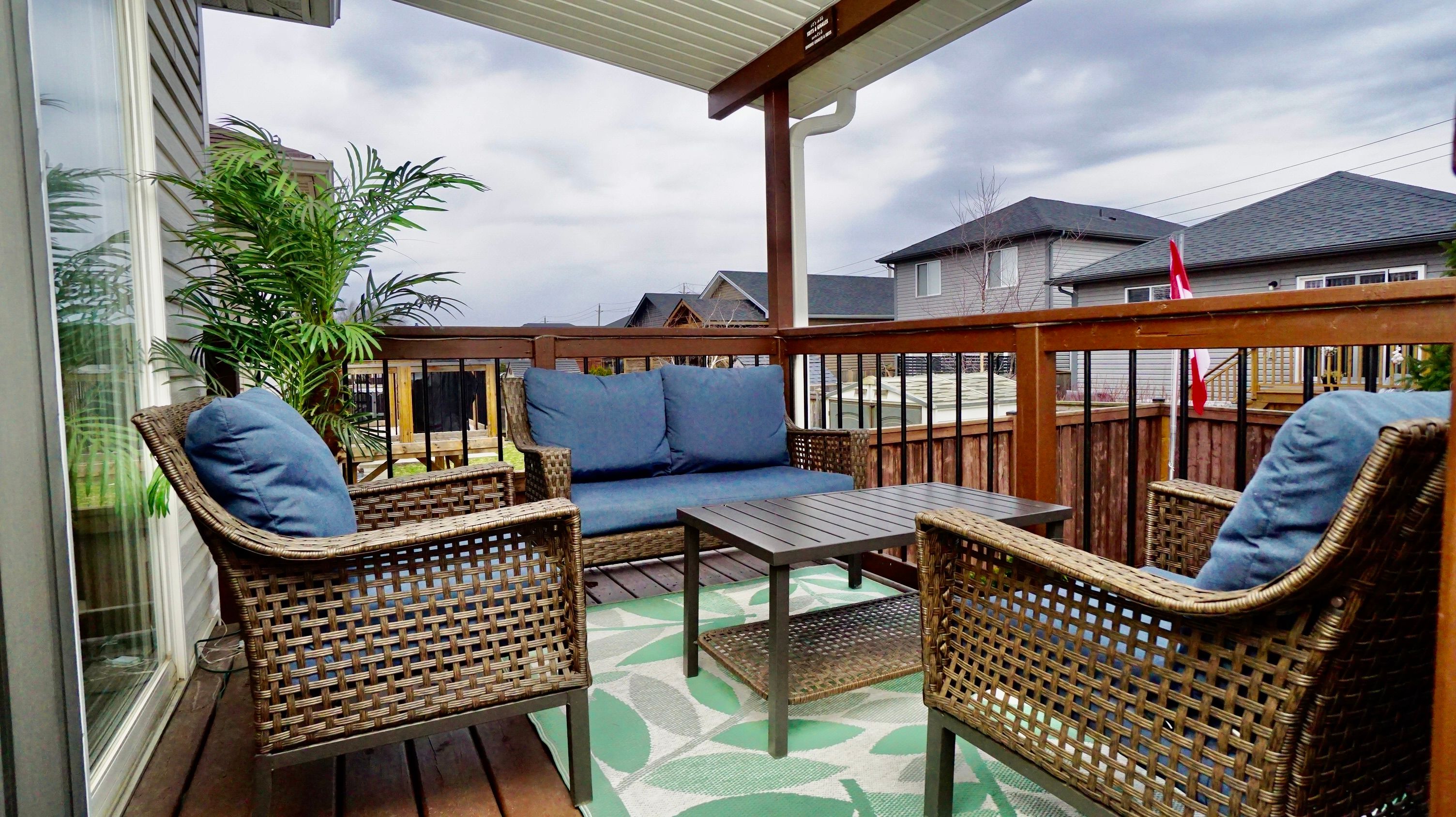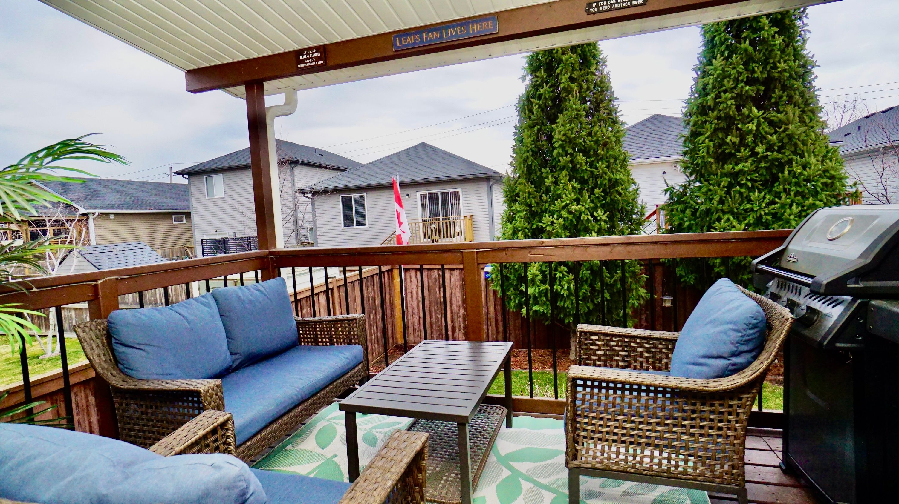 • Covered deck overlooking a fully fenced yard with storage.