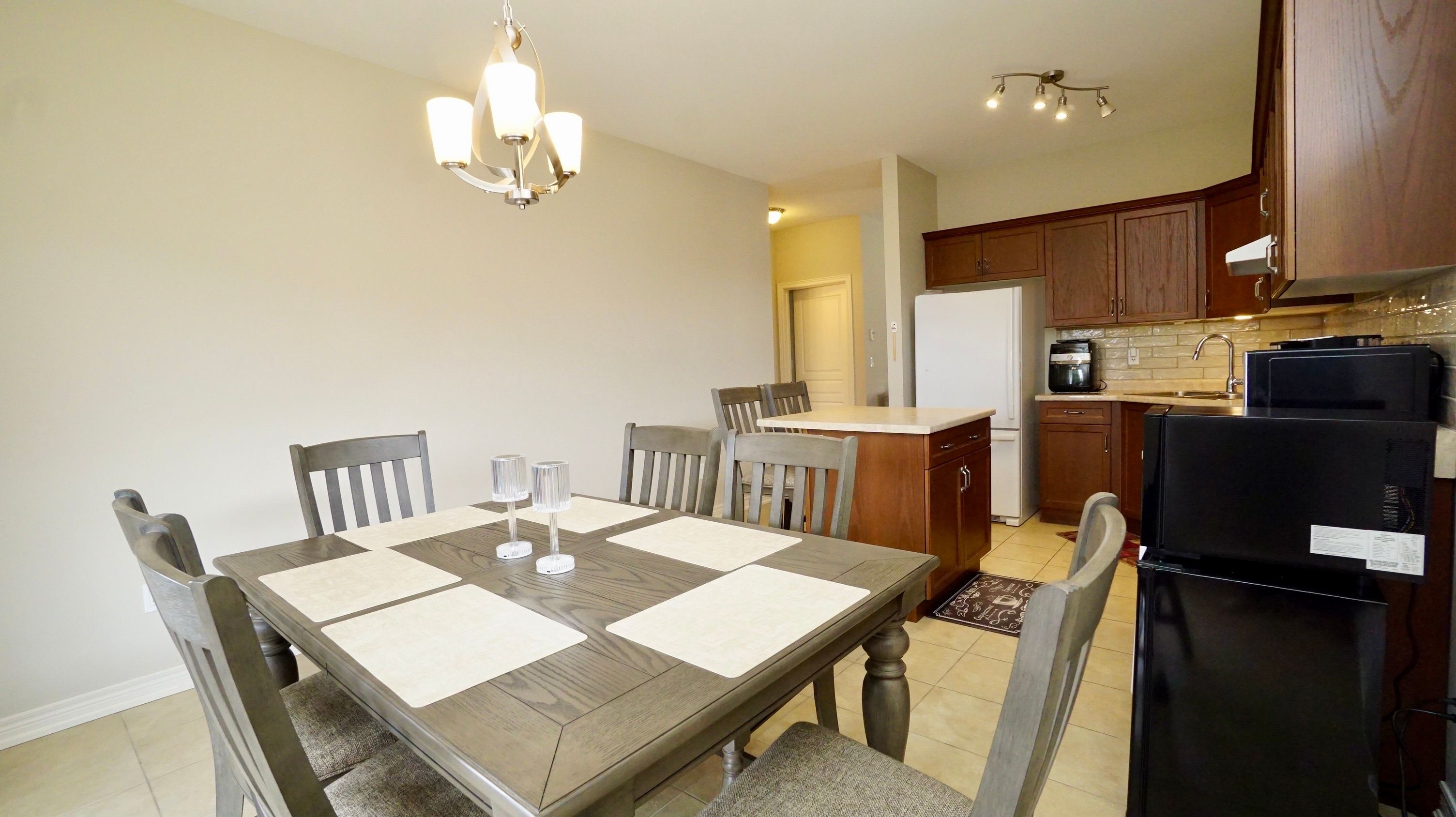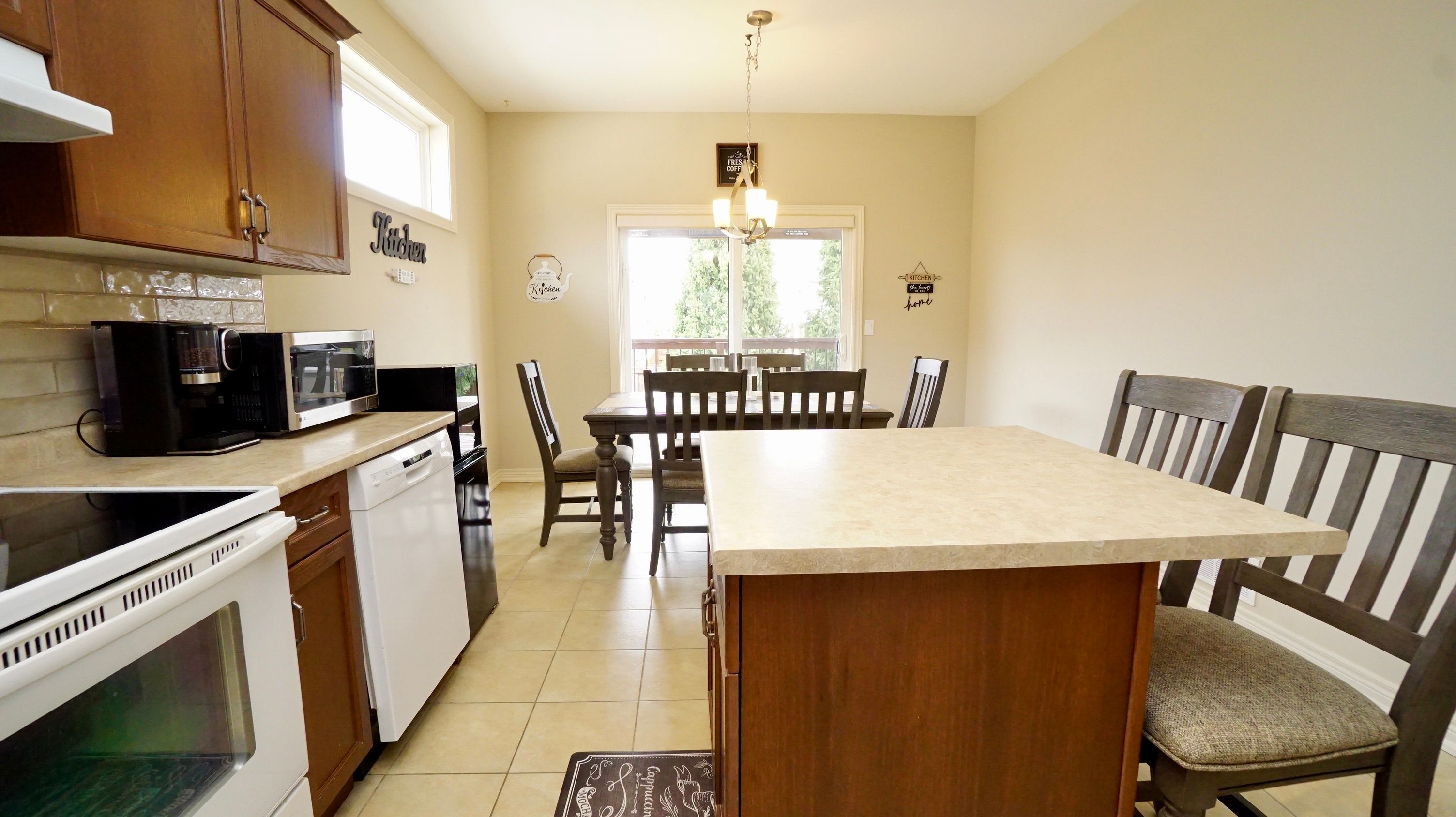 • Spacious eat-in kitchen with island and stylish backsplash.