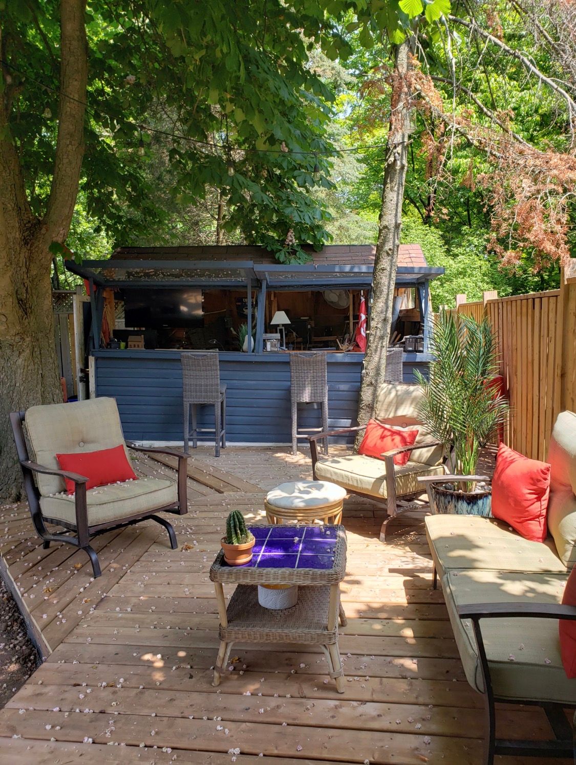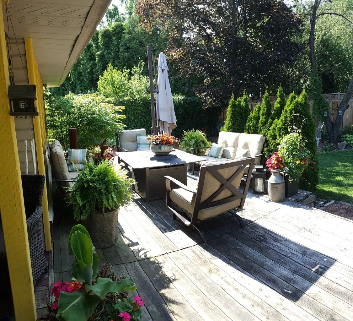 • Generous outdoor area features mature landscaping, gardens, and a fire pit.