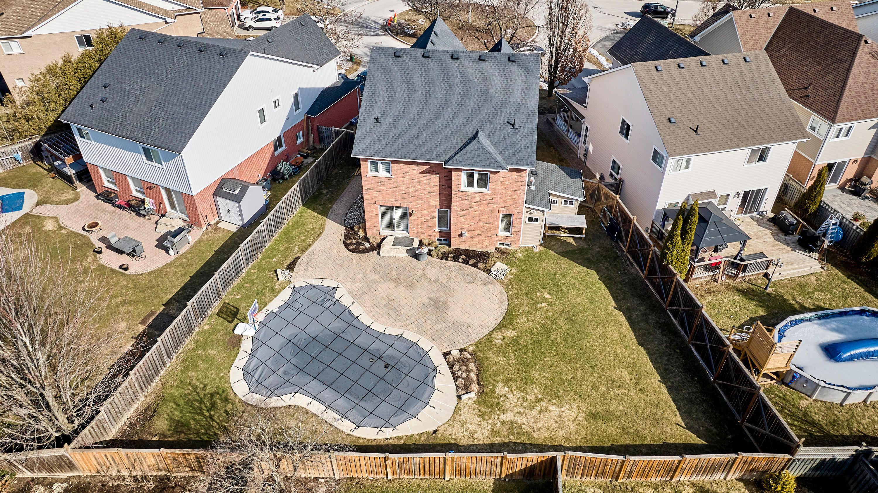 Welcome to this tribute-built valleywood model nestled on a quiet family-friendly cul-de-sac in the highly sought-after park ridge community of north oshawa. Situated on a premium pie-shaped lot, this home offers exceptional outdoor living with a south-facing backyard featuring an inground saltwater pool, large stone interlock patio, and plenty of space for entertaining, relaxing, and family play. Unwind poolside on warm summer days, host gatherings on the patio, or enjoy the expansive yard with ample room for kids to run, play, and create lasting memories. Inside, the home features a bright, open-concept layout with 9 ft ceilings, crown moulding and hardwood flooring throughout the main level. The gourmet kitchen is equipped with stainless steel appliances, a large centre island with breakfast bar, and a sun-filled breakfast area with walk-out to the backyard and pool. The kitchen flows seamlessly into the family room with gas fireplace and pot lights, while the combined living and dining areas provide additional space for gatherings. Upstairs offers four spacious bedrooms featuring ample-sized closets and large windows that fill the rooms with natural light, including a primary suite with a large walk-in closet and a 4-piece ensuite with soaker tub and separate shower. Convenient second-floor laundry adds everyday functionality. The unfinished basement provides a blank canvas for future living space, whether for a recreation room, home office, or additional bedrooms. Located within walking distance to elementary and secondary schools and close to parks, waling trails, recreation centres, shopping, dining, movie theatre, public transit, and convenient access to hwy. 407. Numerous updates include roof, furnace, a/c, fence, california shutters, pool liner, pool heater, pool filter, toilets, and interlock patio. A rare opportunity to own a bright, updated family home on a premium lot in a prime neighbourhood-ready to enjoy today and grow into for years to come.