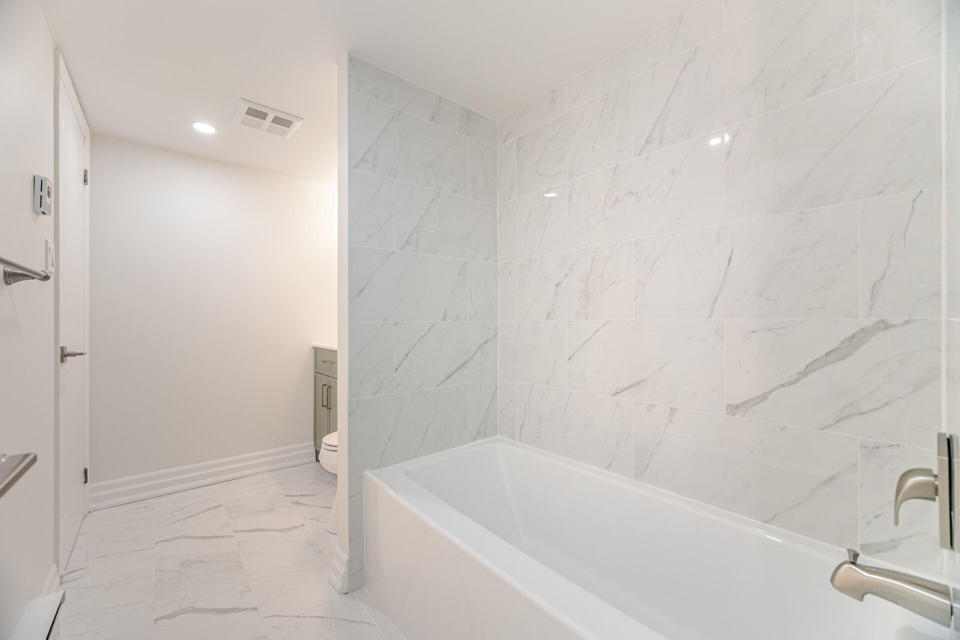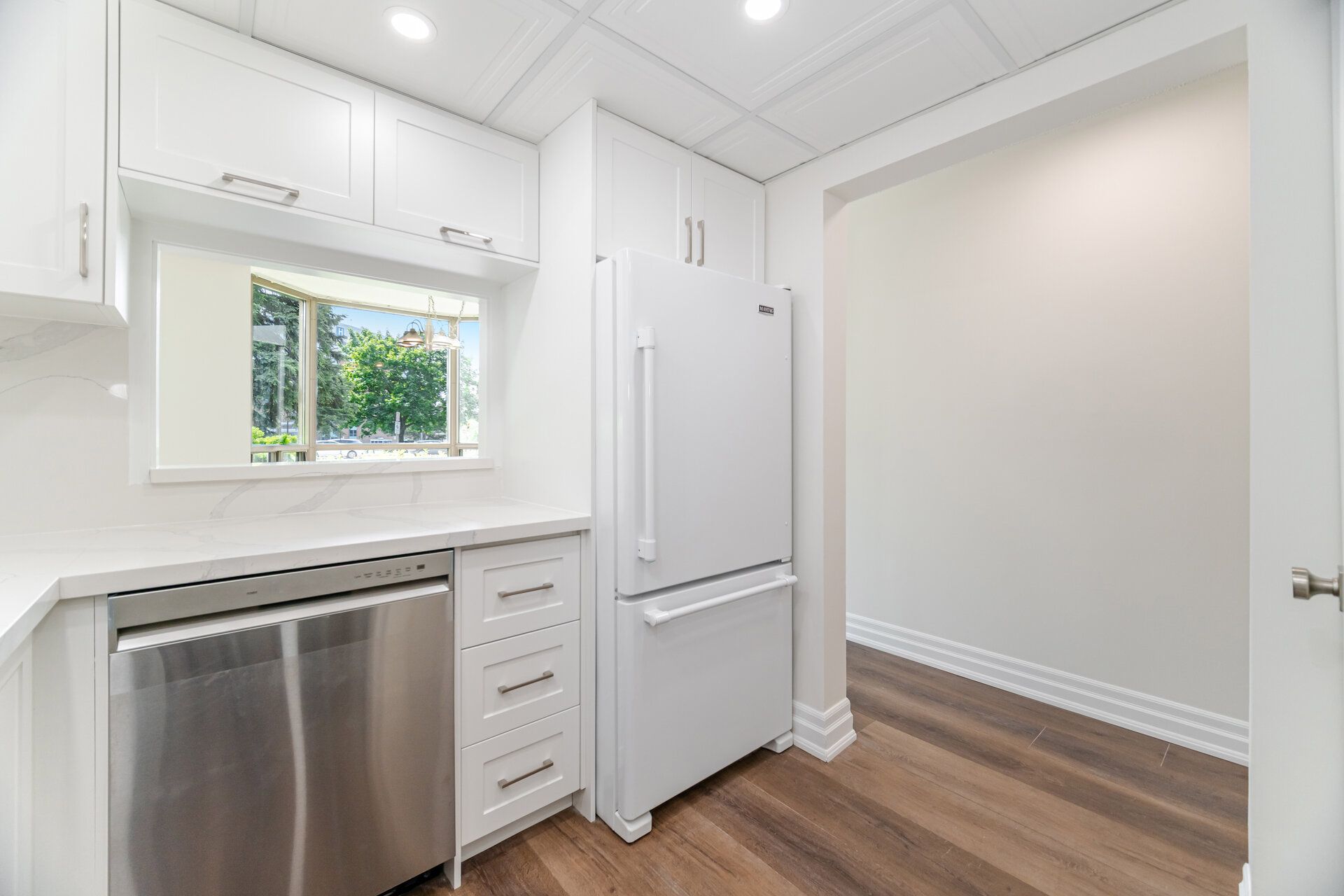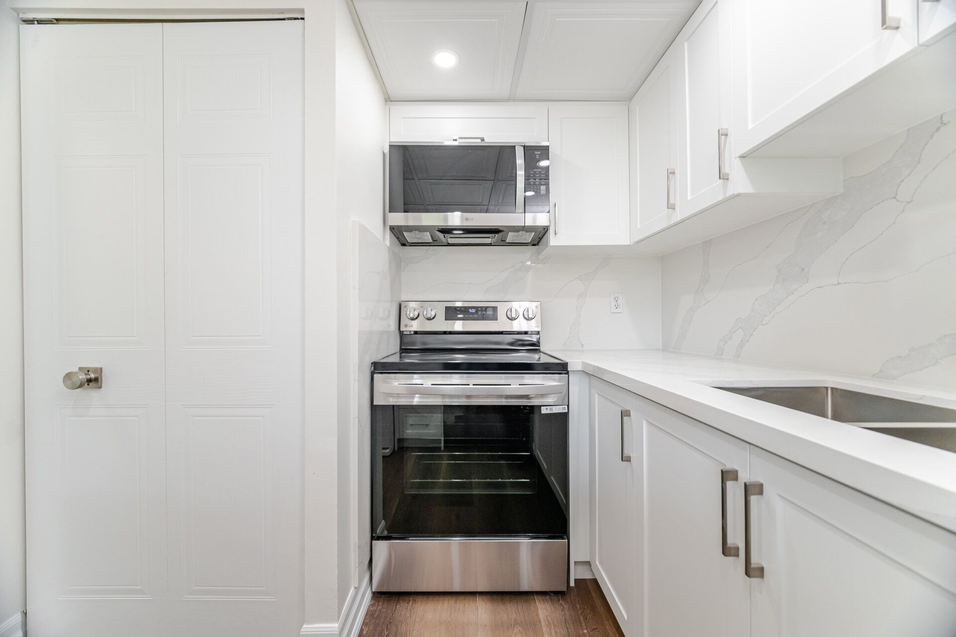• Modern kitchen features new quartz countertops and appliances.