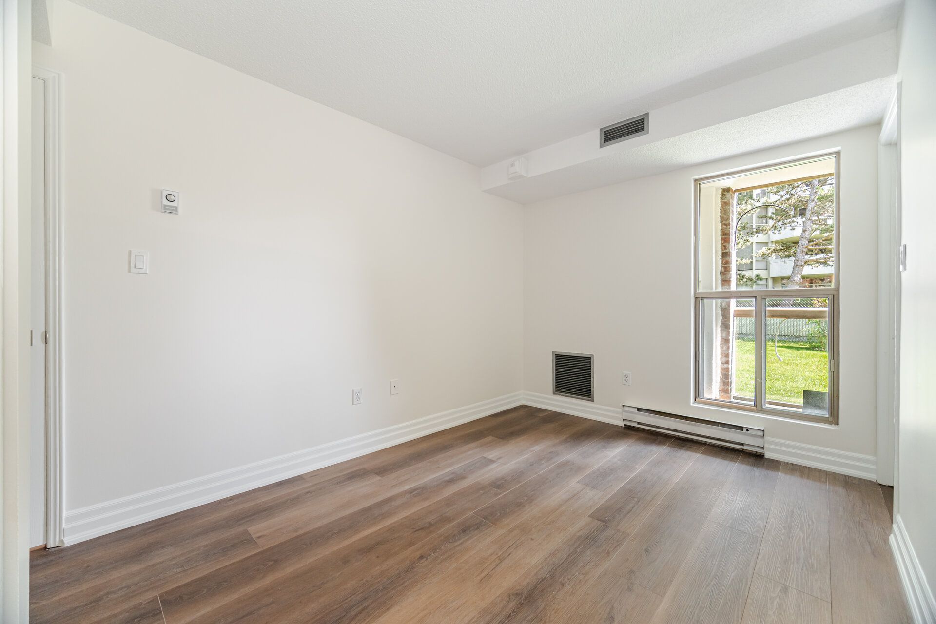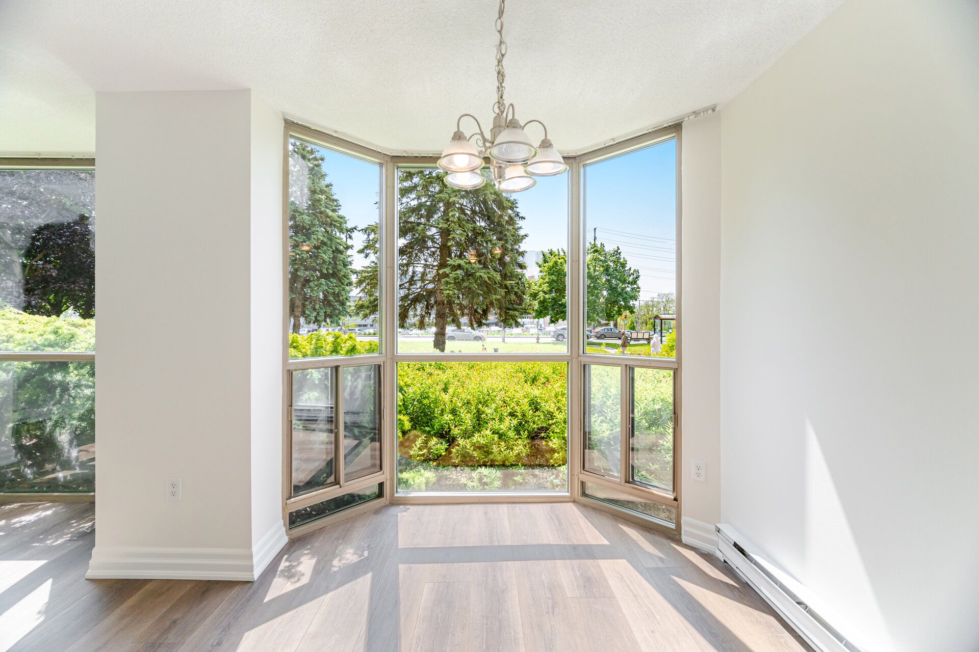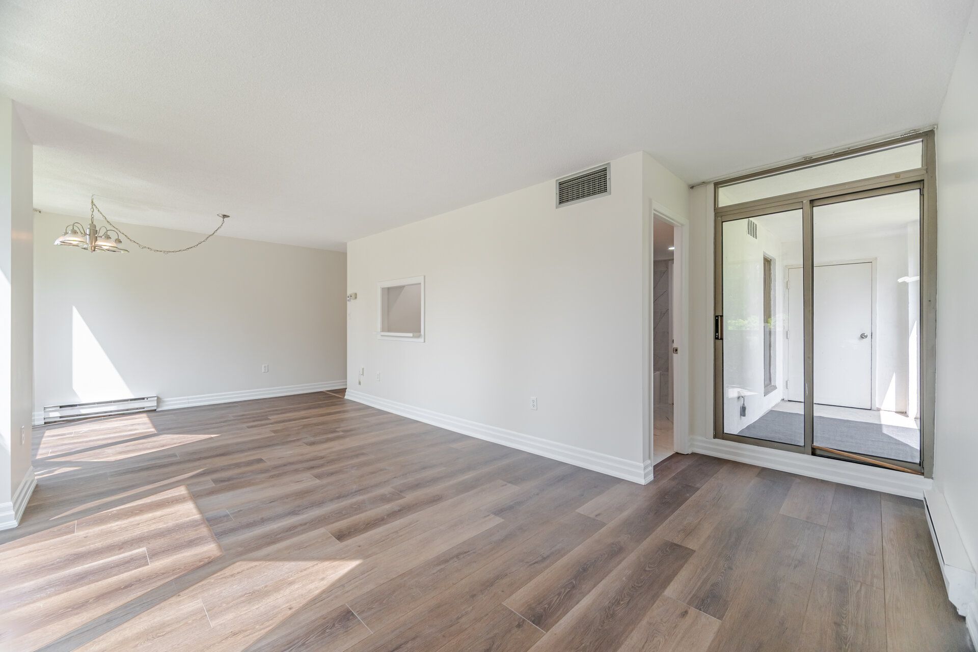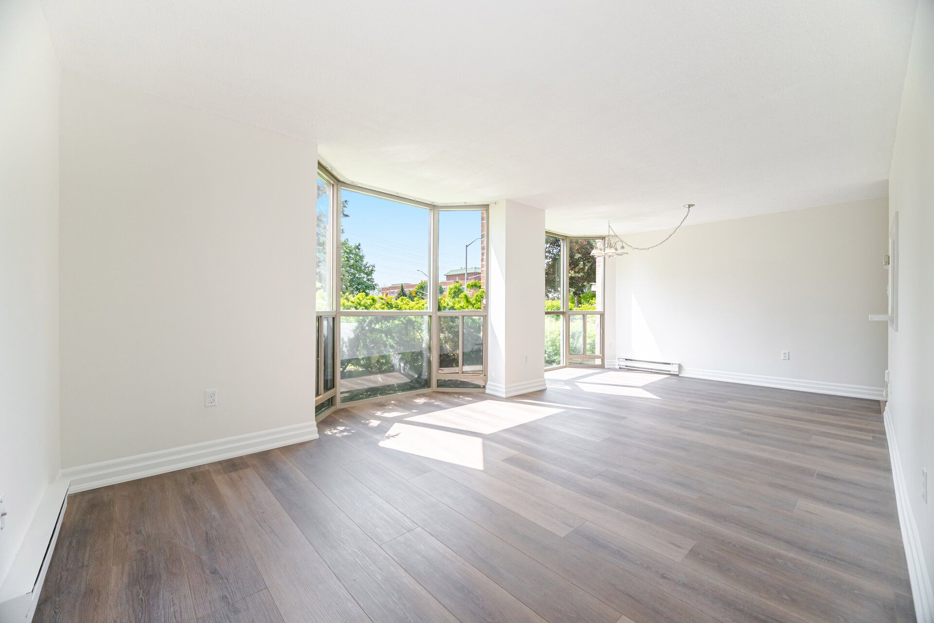 • Bright living and dining area with large windows and private balcony.